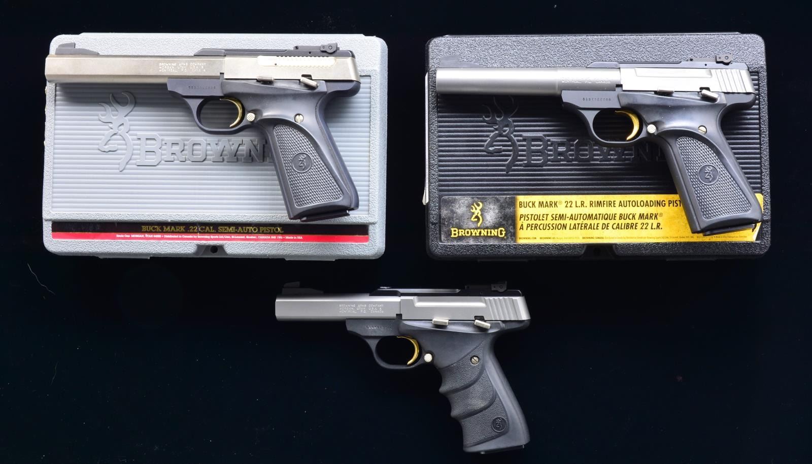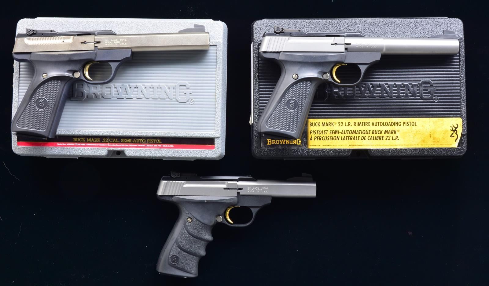 ALL: cal. 22 LR. 1) BUCKMARK STANDARD. S# 655NR02998. Bbl. 5 1/2". Satin nickel slab side bbl. w/ adj. sights. Black alloy frame w/ URX grips. MAGS: 1- 10 rd. UNATTACHED ACCESSORIES: Browning gray plastic case w/ paperwork. CONDITION: evidence of very little firing, very close to new. Brilliant bore. Mechanically crisp. (20-3725/MGM). 2) BUCKMARK CAMPER W/ BOX. S# 515ZY22786. Bbl. 5 1/2" rnd. satin finish w/ adj. sights. Black alloy frame w/ gold trigger & URX grips. MAGS: 1- 10 rd. UNATTACHED ACCESSORIES: plastic box w/ cleaning equipment & paperwork. CONDITION: shows evidence of limited firing w/ a few scattered light marks in all factory finishes. Mechanically fine. (20-3726/MGM). 3) BUCKMARK STANDARD MICRO. S# 515MV13320. Bbl. 4" slab side w/ satin finish & adj. sights. Small grip frame w/ gold trigger & wraparound 1 piece rubber grip. MAGS: 2 - 10 rd. UNATTACHED ACCESSORIES: Browning gray plastic case w/ matching number containing accessories. CONDITION: w/ evidence of some firing & a few minor marks. (20-3727/MGM). ALL MODERN. $800-1,200.