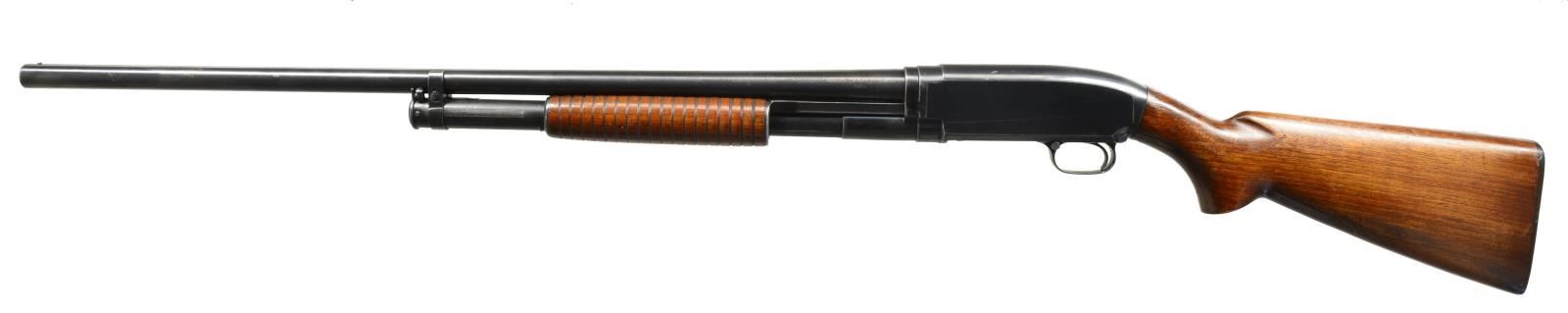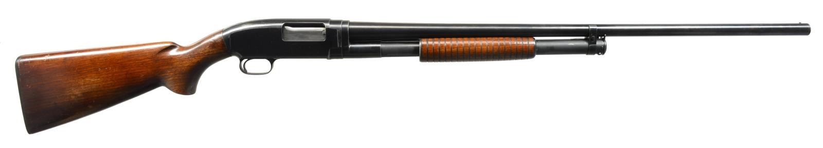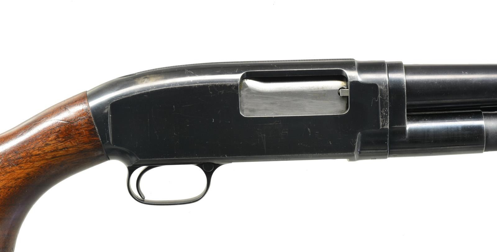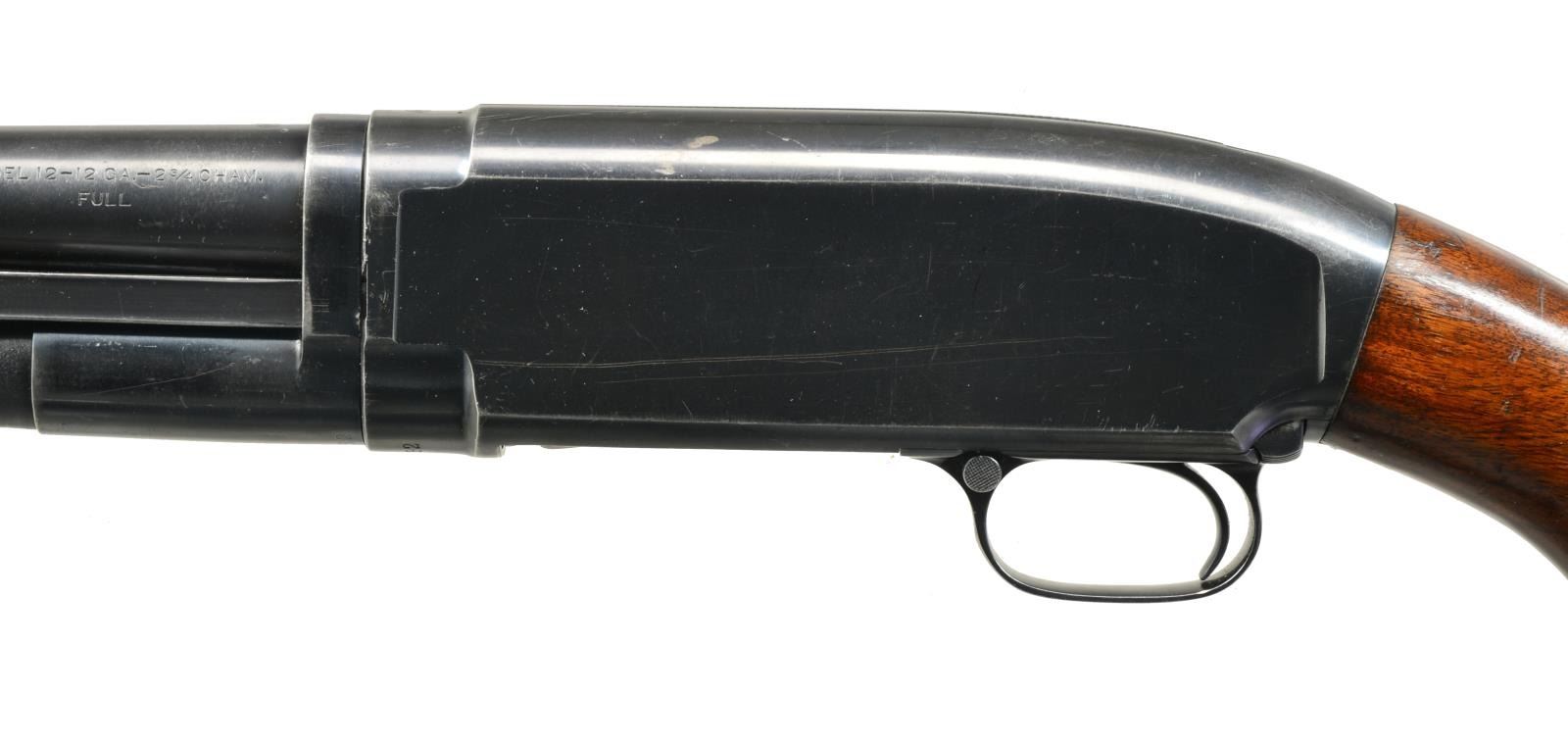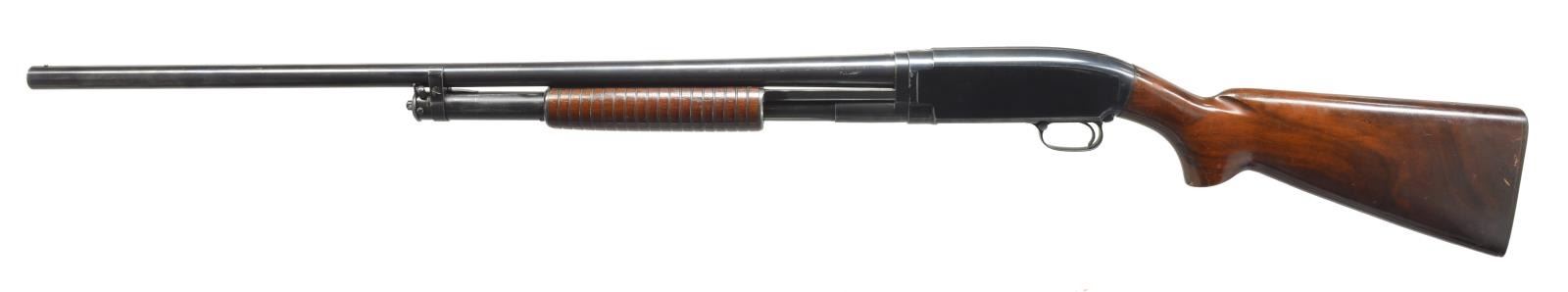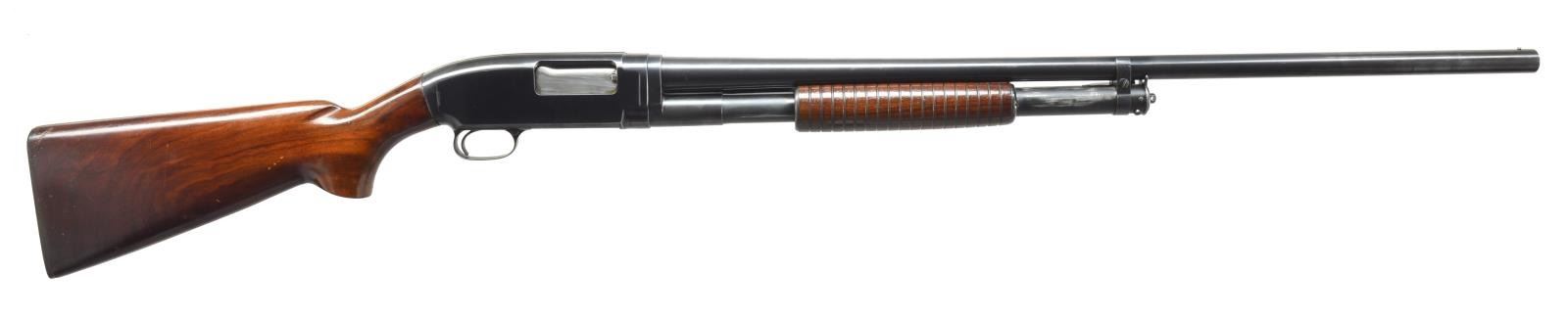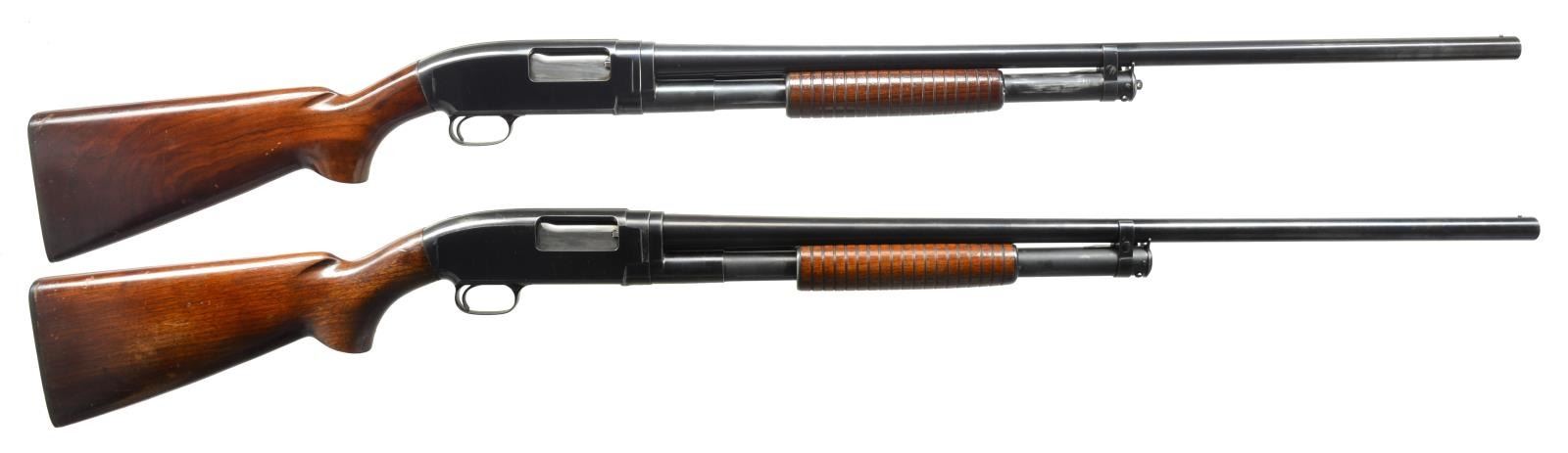 BOTH: cal. 12 Ga., 2 3/4". Bbl. 30" plain of Winchester Proof Steel. 1. S# 860316. Fixed Full choke. Steel bead. Blue finish. Sm. rnd. grooved walnut forearm & pistol grip stock w/ original buttplate. 1941 Mfg. CONDITION: 90% blue showing light edge & mag. tube wear w/ assembly scratches on right side of receiver. Original stock finish shows numerous scratches, marks & sm. dents w/ sm. chips along leading edge of grip. Nice bright bore. (20-2496/DS). 2. S# 952682. Fixed Full choke. Steel front bead. Blue finish. Sm. rnd. grooved forearm & pistol grip walnut stock w/ original buttplate. 1942 Mfg. CONDITION: 80% lightly worn blue showing scratches, marks & slight handle wear. Wood shows wear w/ areas of finish loss, numerous scratches, dents & handling marks. Good bright bore. (20-2497/DS). BOTH CURIO. $600-800.