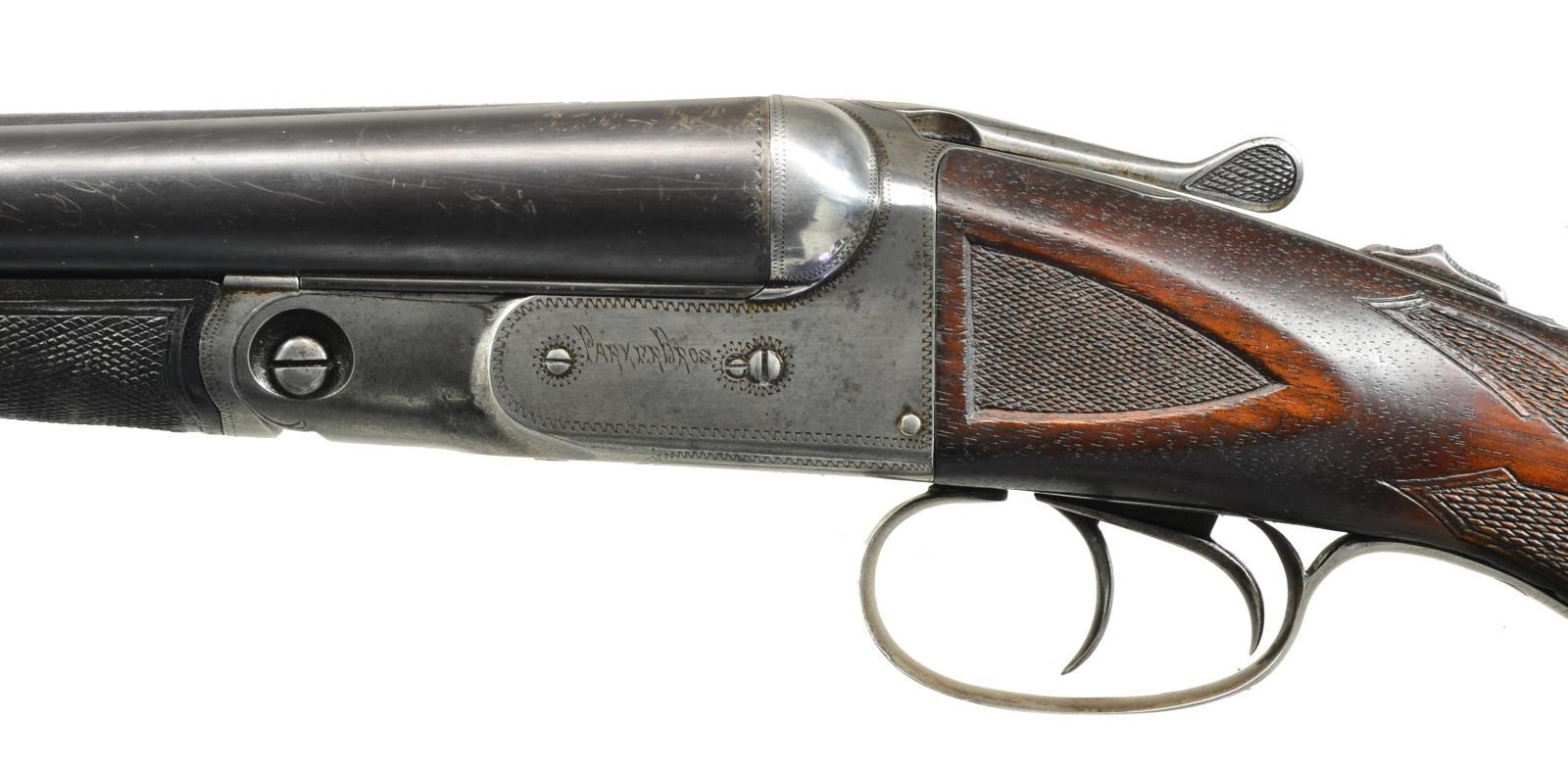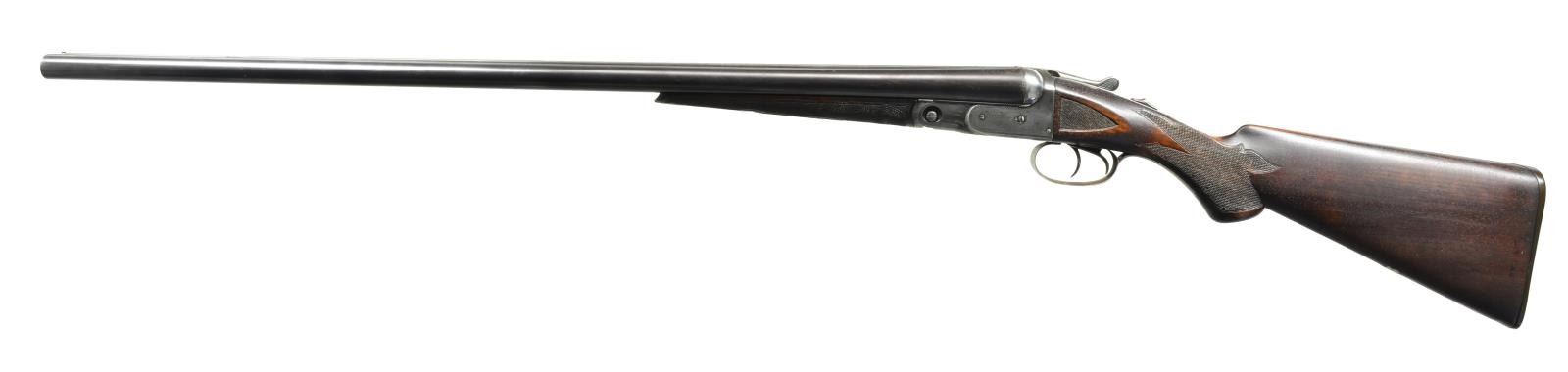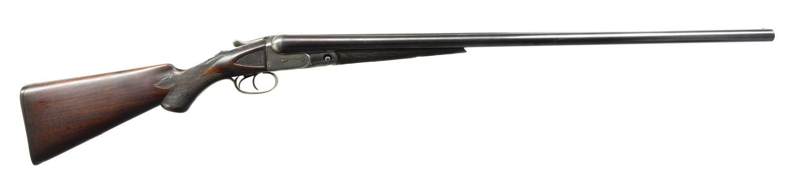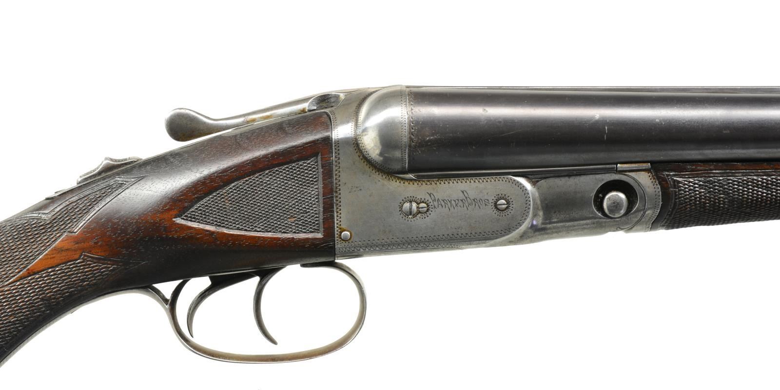 BBLS. & HIGH GRADE CHECKERING. Cal. 12 Ga., 2 3/4". S# 172657. Bbls. 30". The history of this gun is a bit of a mystery. At first it looks like a well worn "VH" that someone has augmented the checkering to mimic "B" style. Closer examination shows a replacement set of bbls. w/ the S# 82228. "The Parker Story" relates that the earliest "VH" gun in the stock books is #88220. These bbls. w/ a much earlier # are marked in standard fashion on the rib w/ "VULCAN STEEL". 82228 Is listed in the Parker Serialization Ledger as grade "V3", probably a grade 3 gun w/ Vulcan steel bbls. 82225 Is the earliest listing of any "V" gun. How all these bits came together is anyone's guess. It is, however an interesting Parker which has an unusual "Parker TrapGun" buttplate w/ embossed flying pigeon. 30" Bbls. have all correct markings on concave rib & water table. They were made for 1 1/2 frame gun & the loop is stamped "2" as is normally found on extra sets of bbls. Usual Parker VH frame features automatic safety & dbl. triggers. Plain American walnut capped pistol grip buttstock measures 14 1/4" over "Parker TrapGun" buttplate. Checkering is well done & as mentioned before in "B" style w/ flourishes into butt & mullered borders. Matching splinter forend is near fully checkered, patent date is on release. MEASUREMENTS: BARRELS: L 730 .036 (FULL) R 731 .038 (FULL). Min Wall thickness: L .033 R .030. STOCK: LOP 14 1/4". DAH 2 15/16". DAC 1 5/8+". WEIGHT: 7 lbs. 6 oz. CONDITION: good as partially refinished. Bbls. retaining most of their original blue. Action cleaned to silver gray, engravings slightly softened. Stock has old refinish, pistol grip rounded, checkering appears to have been done after this refinish & is relatively crisp although execution is a bit haphazard. Bores are very fine to excellent w/ 1 or 2 scattered very minor dents. Action is very slightly loose & bbls. are a bit undersized for action. You've heard about buying a pig in a poke? (20-1659/MGM22). CURIO. $400-800.