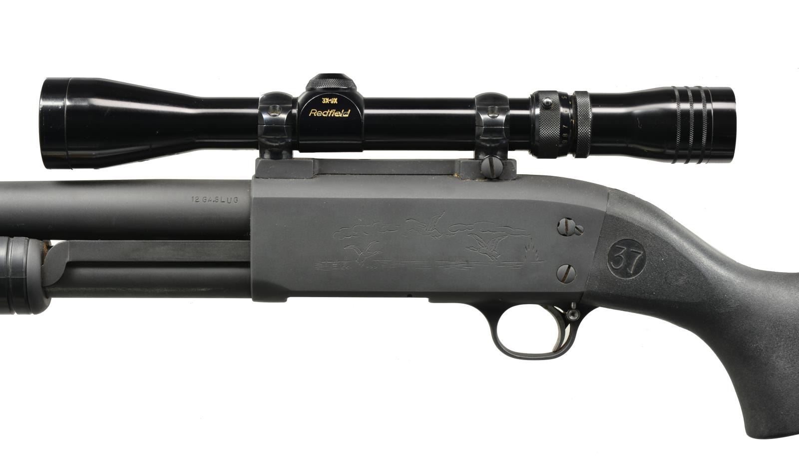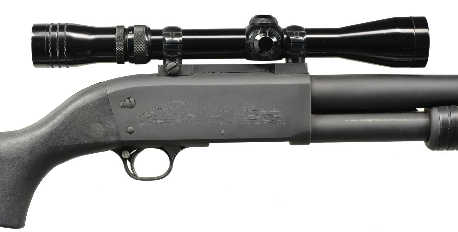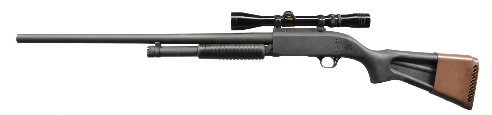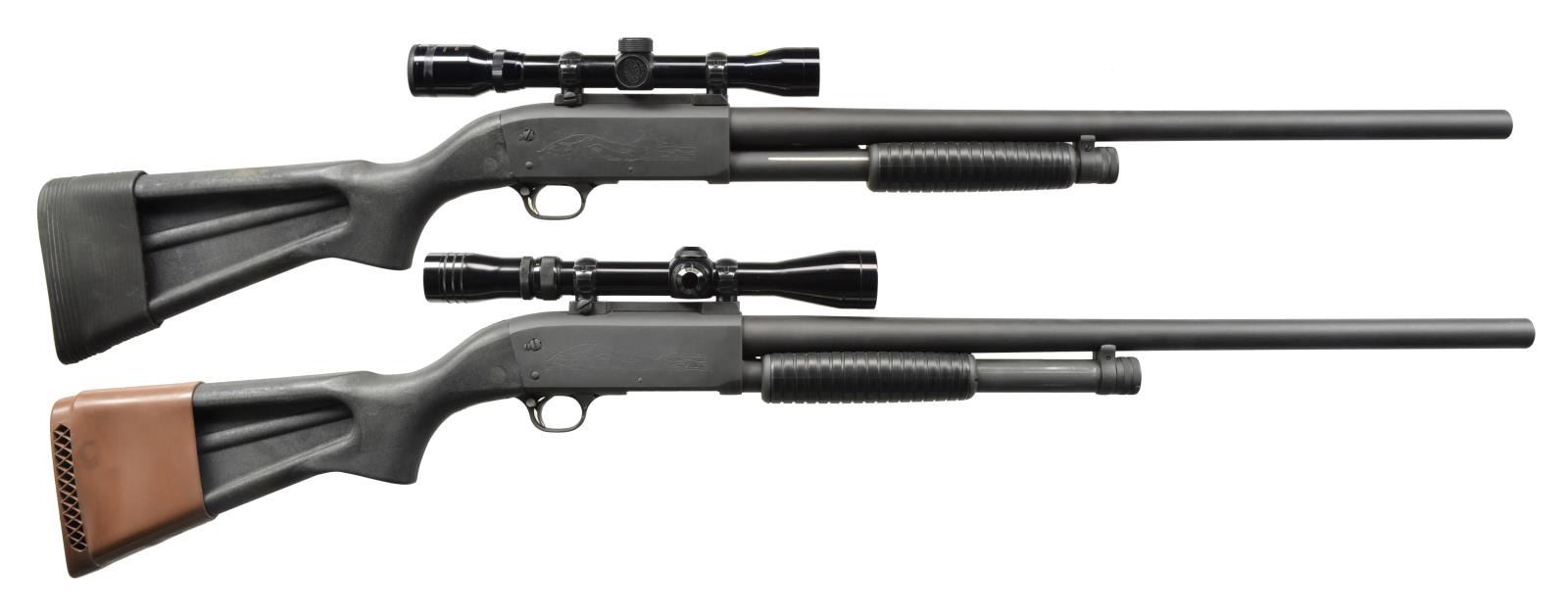 ALL: cal. 12 Ga., 2 3/4". ER Shaw 24" fully rifled slug bbls. permanently fixed on early Ithaca actions for non interchangeable bbls. Custom matte black metal finishes. Ithaca synthetic stocks & grooved pump handles. 1) S# 811386. Fitted w/ Tasco 4x32 gloss finished scope on Redfield mts. Stock has a Limbsaver slip on recoil pad. CONDITION: over 95% finish. Near excellent rifled bore. Scope has clear optics. (20-2244/DS). 2) S# 523727. Redfield 3x-9x Widefield gloss finished scope w/ duplex reticle on Leupold mts. Slip on Pachmayr pad. CONDITION: over 95% finish. Near excellent rifled bore. Scope has clear optics. (20-2245/DS). ALL MODERN. $800-1,200.