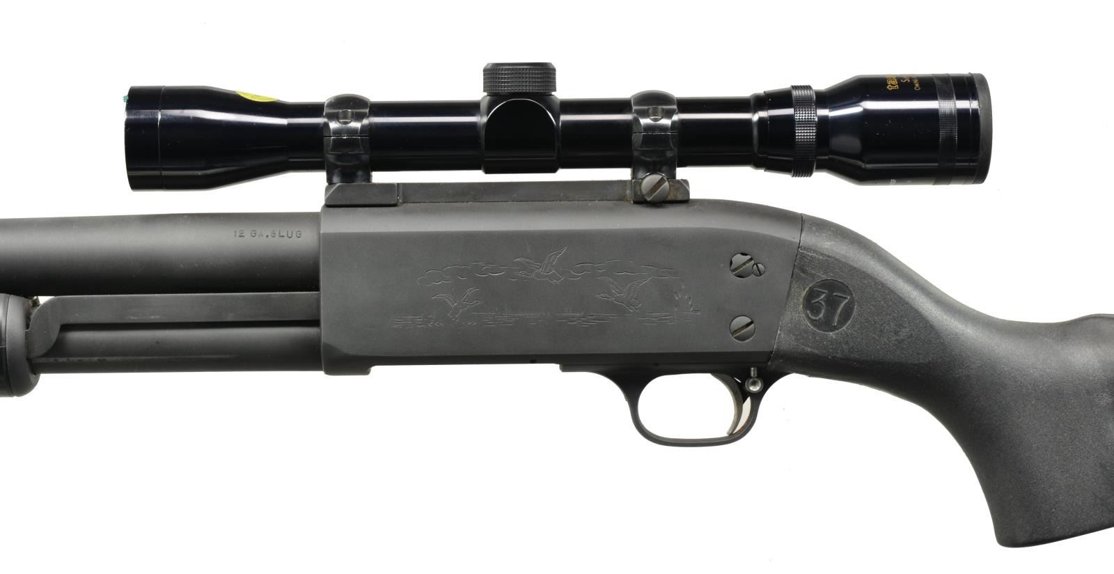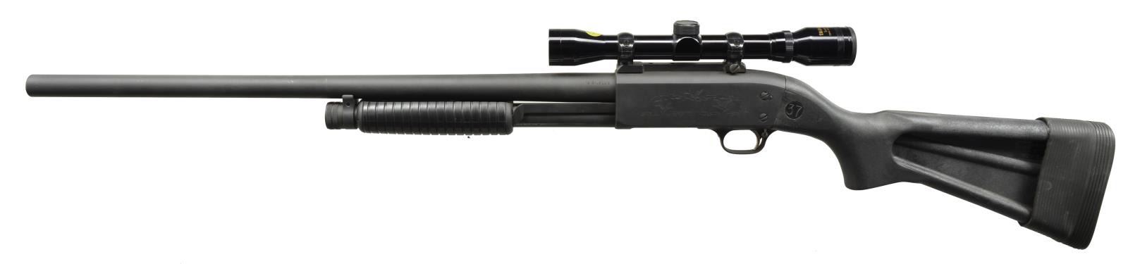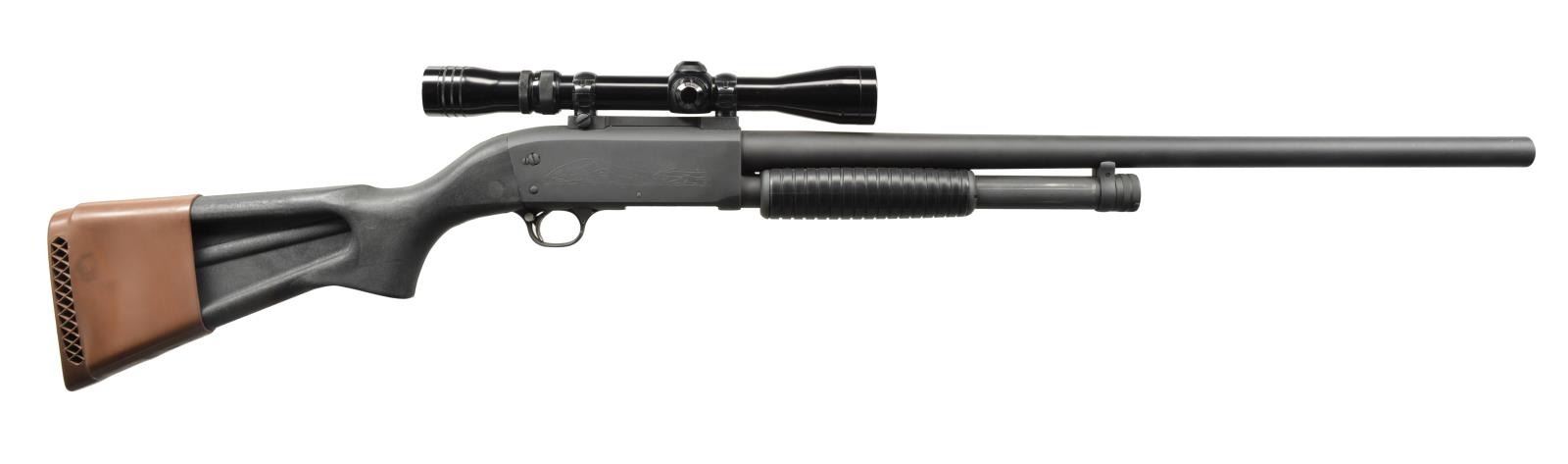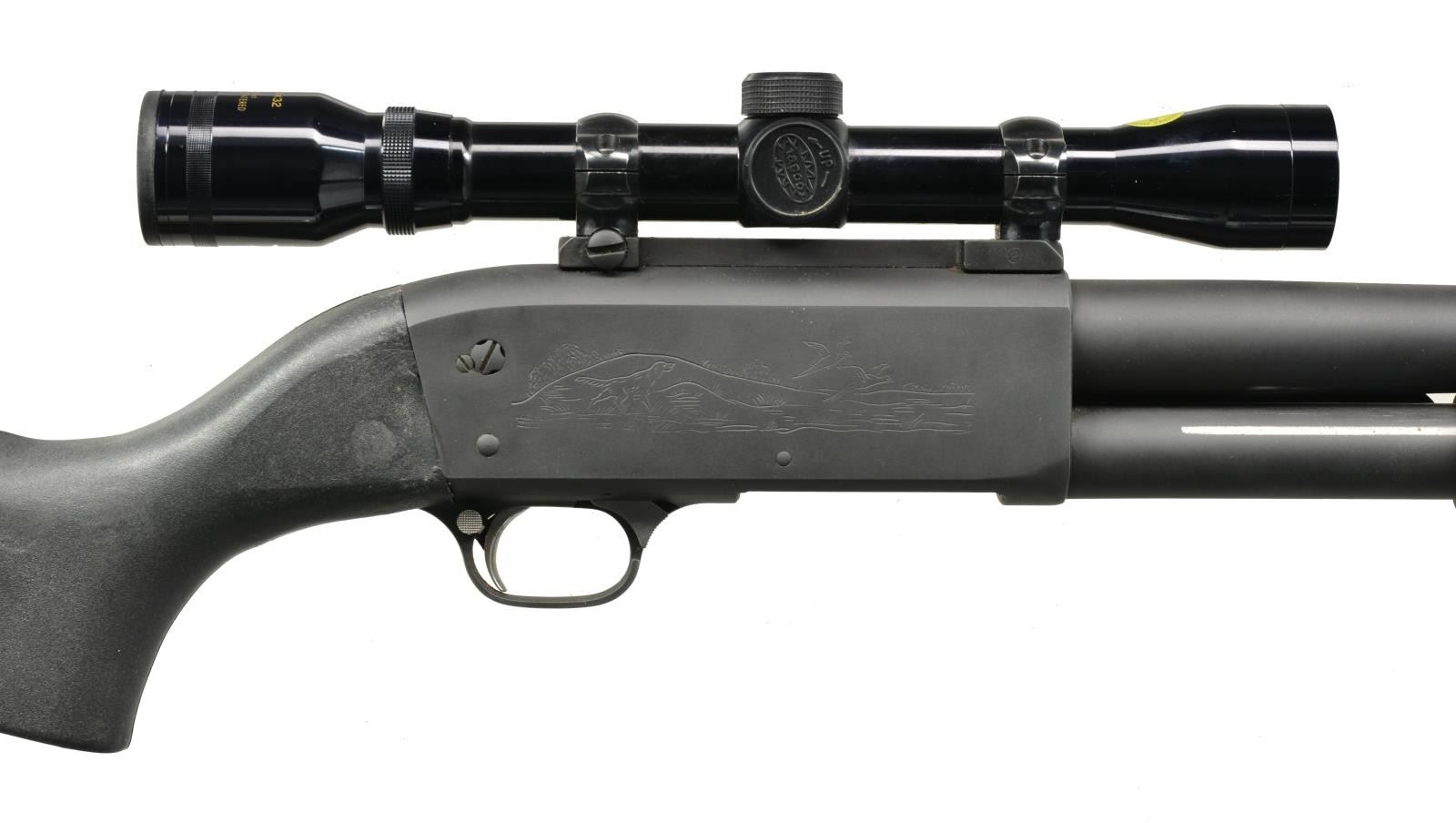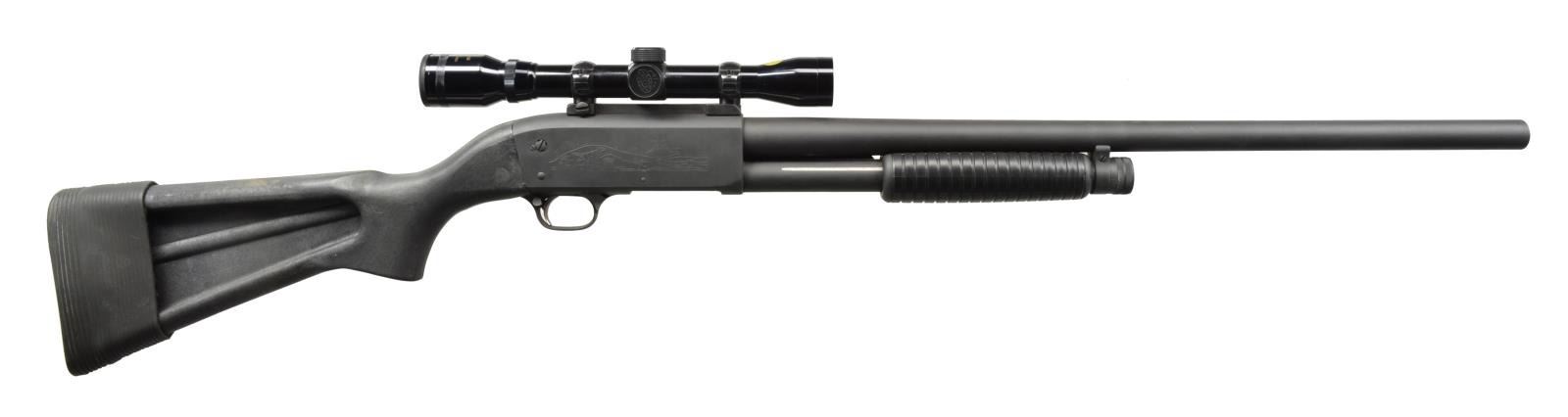 ALL: cal. 12 Ga., 2 3/4". ER Shaw 24" fully rifled slug bbls. permanently fixed on early Ithaca actions for non interchangeable bbls. Custom matte black metal finishes. Ithaca synthetic stocks & grooved pump handles. 1) S# 811386. Fitted w/ Tasco 4x32 gloss finished scope on Redfield mts. Stock has a Limbsaver slip on recoil pad. CONDITION: over 95% finish. Near excellent rifled bore. Scope has clear optics. (20-2244/DS). 2) S# 523727. Redfield 3x-9x Widefield gloss finished scope w/ duplex reticle on Leupold mts. Slip on Pachmayr pad. CONDITION: over 95% finish. Near excellent rifled bore. Scope has clear optics. (20-2245/DS). ALL MODERN. $800-1,200.