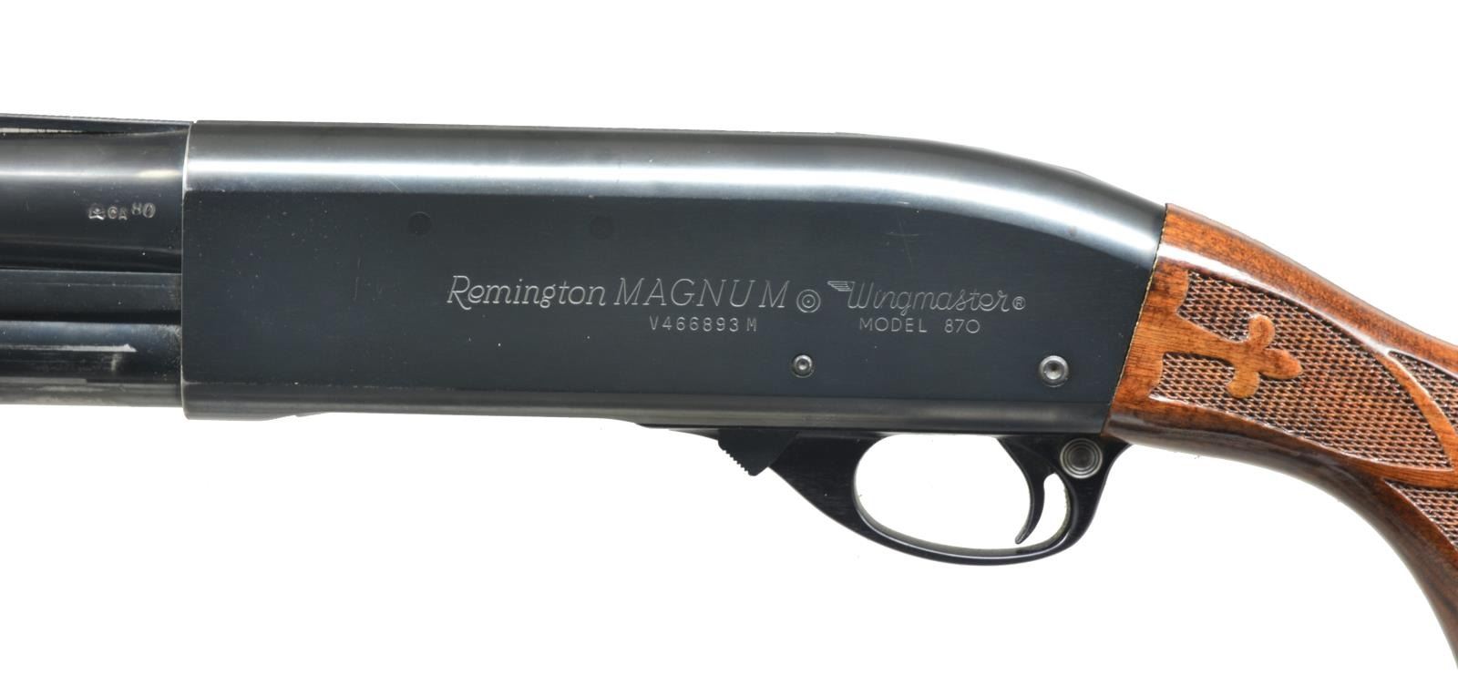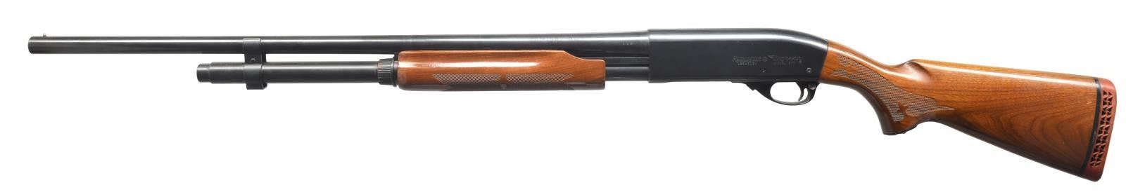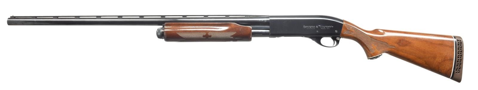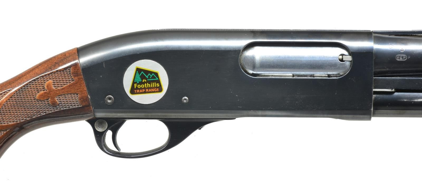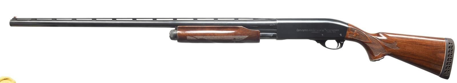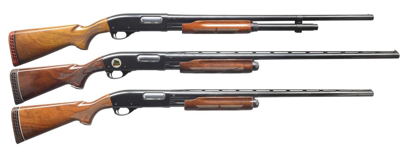 1) Cal. 12 Ga., 2 3/4". S# 1294219V. Bbl. 28" plain marked “MODIFIED”. Single silver front sighting bead. 9" Mag. tube extension. Standard checkered forend. Checkered pistol grip w/ black grip cap w/ flying duck. Vented red Remington recoil pad. CONDITION: bbl. has original blue w/ area of fine surface oxidation. Receiver has original blue w/ some wear on sharp edges. Forend has original finish, minor handling marks & good checkering. Buttstock has original finish w/ a couple minor nicks/dings w/ good checkering. Recoil pad is soft. Bore is good. (20-3483/BT). 2) Cal. 12 Ga., 2 3/4". S# V101810V. Bbl. 28" vent ribbed marked “MODIFIED”. Standard checkered forend & checkered pistol grip w/ black grip cap w/ flying duck. Brown vented Remington recoil pad. CONDITION: bbl. has good original blue w/ few minor scratches. Top of vent rib has a brown discoloration in grooves. Receiver has good original blue w/ minor wear on sharp edges. Sm. marks on right side of receiver. Forend has original finish w/ few handling marks & good checkering. Buttstock has original finish w/ a couple light scratches & good checkering. Bore is good. (20-3484/BT). 3) MAGNUM. Cal. 12 Ga. Mag., 3". S# V466893M. Bbl. 30" vent rib w/ full choke mark. Left side of receiver marked “REMINGTON MAGNUM”. Right side has a decal for “Foothills Trap Range”. Standard checkered forend. Checkered pistol grip w/ black grip cap & flying duck mark. Brown vented Remington recoil pad. CONDITION: bbl. has good, original blue w/ minor rub mark from forend. Receiver has good original blue w/ minor wear on sharp edge. Forend has good, original finish w/ few handling marks & good checkering. Buttstock has original finish w/ some minor handling marks & good checkering. Mag. tube has blue loss from wear. Recoil pad is soft. Bore is good. (20-3485/BT). ALL MODERN. $950-1,600.