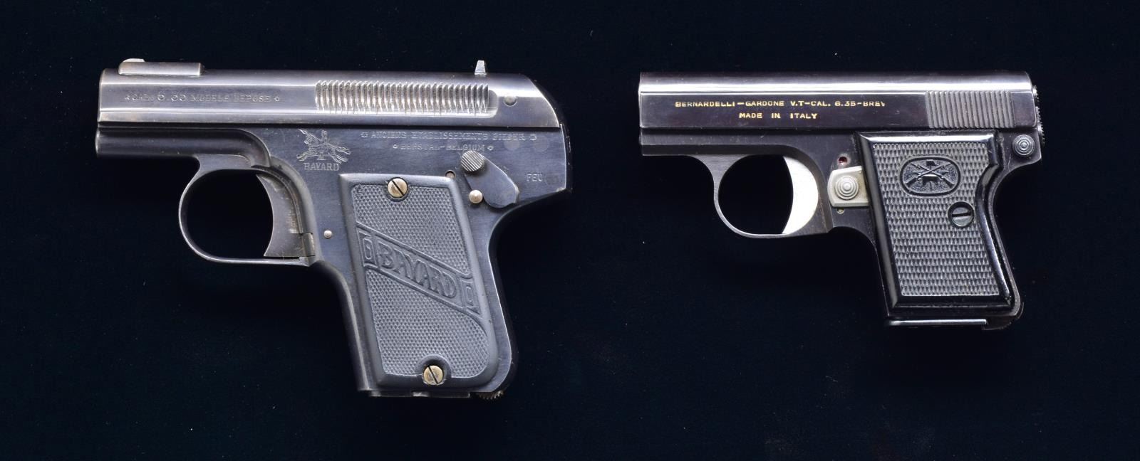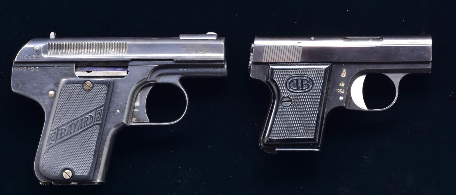 1) BAYARD MODEL 1908. Cal. 25 ACP. S# 32132. 2 1/4" Bbl. w/ fixed sights. Blued finish w/ rubber grips marked “Bayard”. Slide marked w/ cal. on left side & patent information on top. Left side of frame w/ Bayard horse & rider logo. MAGS: 1 bottom release 6 rd. UNATTACHED ACCESSORIES: spare pair of white plastic grips. CONDITION: retaining approx. 80% blue. Considerably browned thinning overall w/ high edge wear & some scattered flecking. Grips are good w/ slight shrinkage. Good bore, lightly pitted throughout. Mechanically good. (20-3768/MGM). 2) BERNARDELLI "VEST POCKET". Cal. 6.35. S# 74673. This very sm. sized pistol has a 2" bbl. Right side of slide marked w/ Bernardelli info, cal. & “MADE IN ITALY”. Left side of frame stamped w/ 1954 Italian proofs. Steel frame has black hard rubber grips, right w/ VB logo. This cute little pistol retailed for $32 in 1956. MAGS: 1 bottom release 5 rd. CONDITION: retaining over 95% original blue w/ only a hint of high edge wear & marks on left side of frame from safety use. Bright shiny bore. Mechanically good. (20-3903/MGM). BOTH CURIO. $500-900.