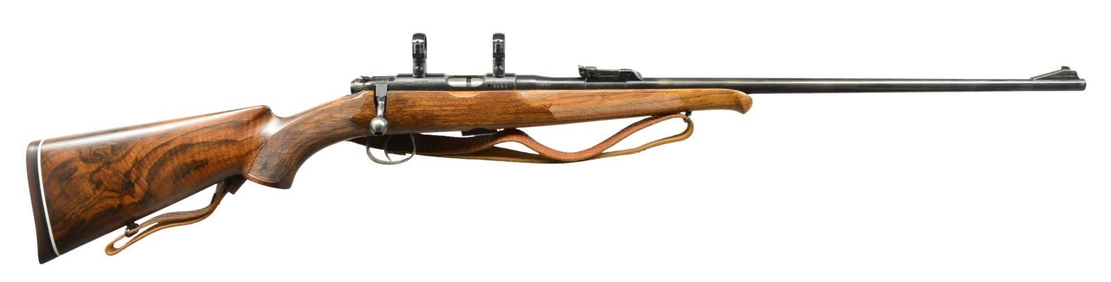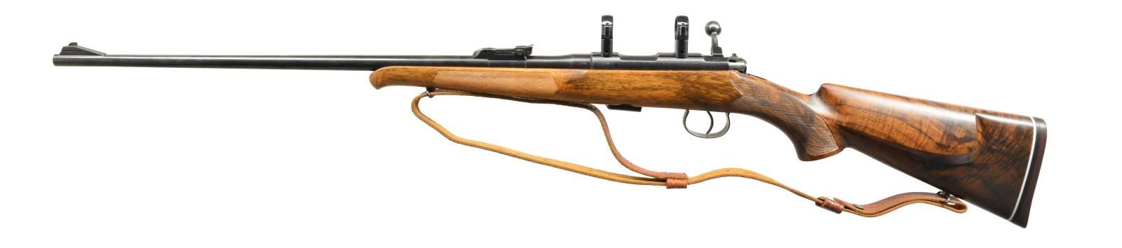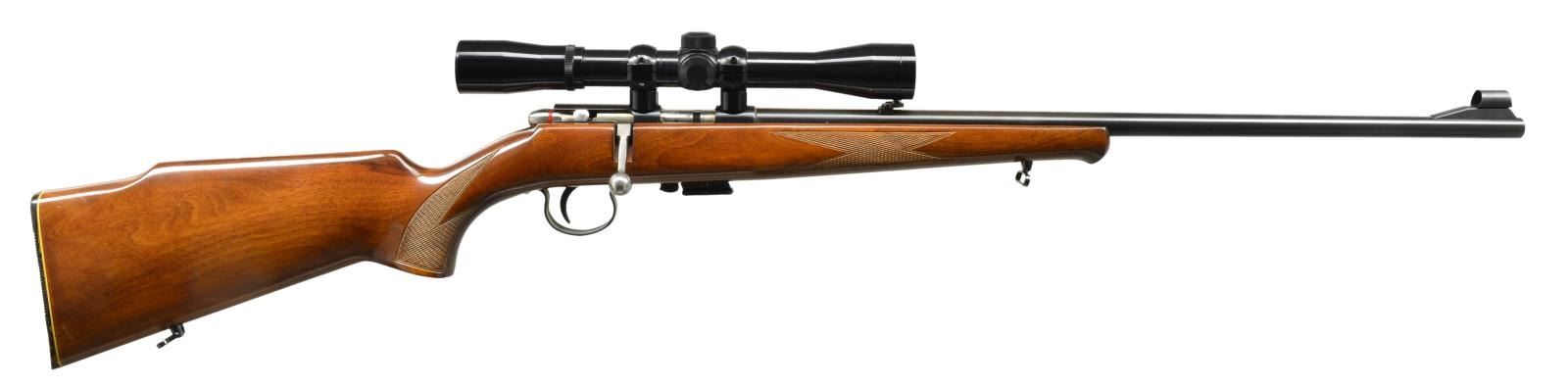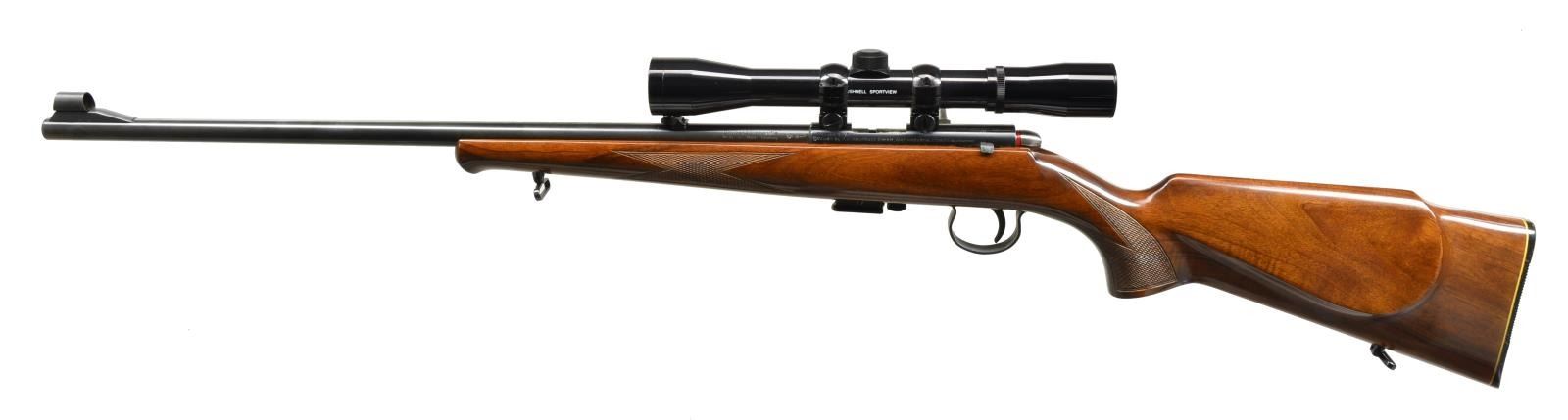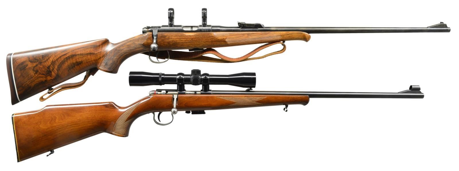 ALL: cal. 22 LR. 1) MANSOURA SPORTER. S# 2454. Bbl. 24 3/4" w/ ramp mounted blade front sight & square notch tangent rear sight. Egyptian rifle patterned after BRNO Model 2. Action has Tasco rings on tip off mts. Wing type safety. Finely built custom sporting stock of fancy thin shell walnut. Features include shadow line cheekpiece, Schnable forearm tip, well executed borderless hand checkering & swivels w/ tooled leather sling. LOP: 14 1/8" over thin rifle style pad & white line spacer. MAGS: 1 detachable 5 rd. CONDITION: 90% lightly worn blue. Stock has very good finish showing a few sm. marks. Bore is bright w/ strong rifling. (20-2258/DS). 2) ANCHUTZ MODEL 184 SPORTER. S# 953028A. Bbl. 21 3/4" light sporter weight w/ hooded ramp bead front sight & folding leaf rear sight. Bushnell Sportview gloss finished 4x w/ duplex reticle on tip off mts. Schnable tipped Monte Carlo cheekpiece walnut sporter stock. Features include hand checkering & swivels. LOP: 13 3/4" over original buttplate & white line spacer. West German mfg. imported 1963-1981. CONDITION: 98% blue. Stock has very good finish showing a few sm. marks. Bright near excellent bore. Scope has good optics. (20-2264/DS). ALL MODERN. $700-1,200.