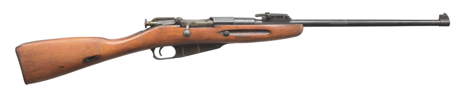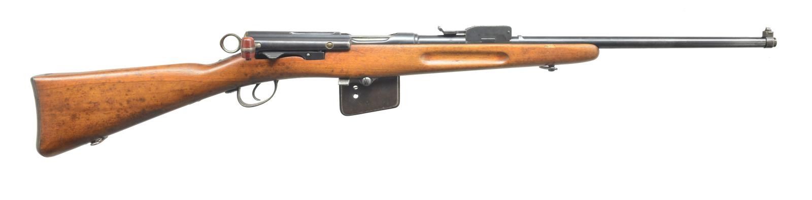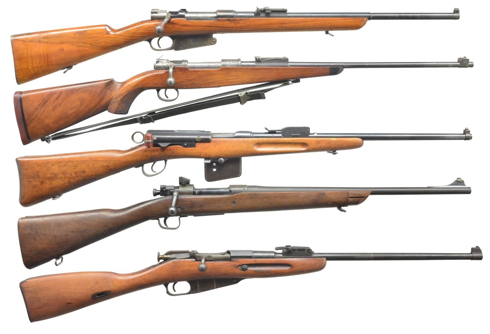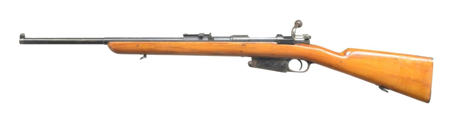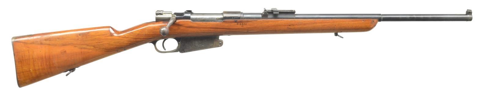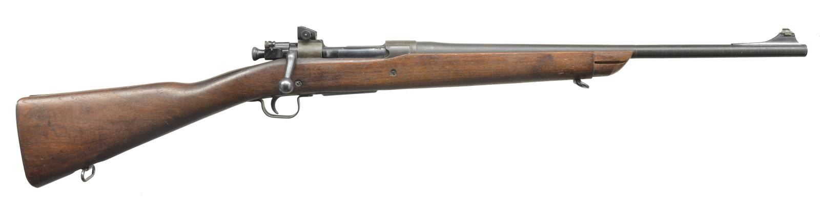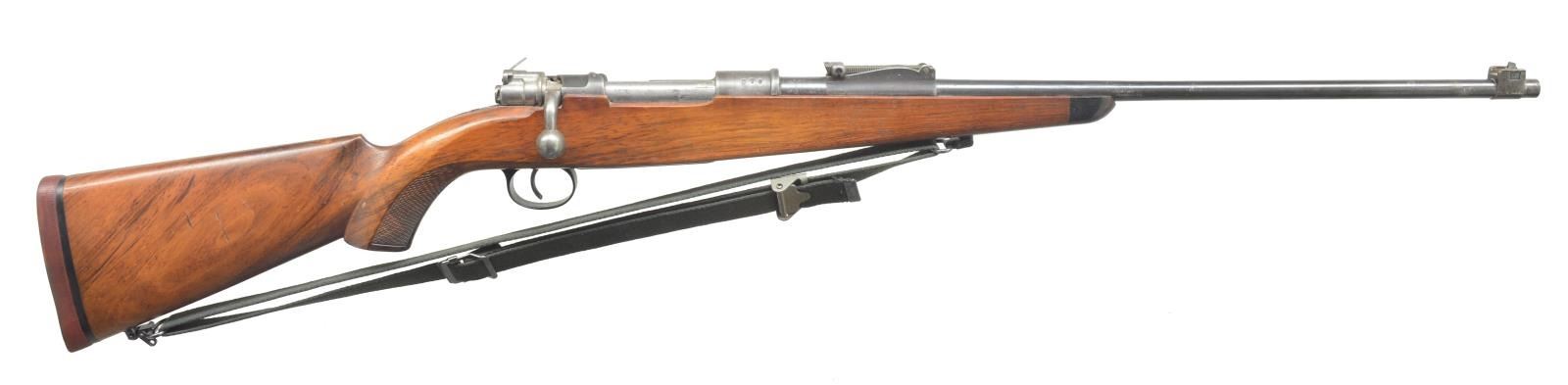 1) LOEWE ARGENTINE 1891 MAUSER BOLT ACTION. Cal. 7.65 x 54. S# A3701. Bbl. 22”. Bbl. & receiver numbers match. Stock number does not. Banded block w/ dovetail blade sight. Adj. rear sight. Bolt handle number matches. Uncheckered stock w/ sling swivels. Straight grip w/ steel smooth buttplate. Left side of receiver is marked “Mauser Modelo Argentino 1891 / Manufacture Loewe Berlin”. CONDITION: bbl. retains original blue blended w/ silver patina forend forward. Stock has grain crack behind top tang. Receiver has traces of original blue blending w/ brown patina over front ring. Stock has light coat of added finish w/ nicks & dings. Mag. & trigger guard retain traces of original blue blending w/ fine surface oxidation. Mag. number does not match gun. Bore is good. (01-18524/BT). ANTIQUE. 2) MAUSER 98. Cal. 8mm. S# 9016. Bbl. 24” rnd. Blade front. Adj. rear. Bolt number does not match gun. Numbers on floorplate match bolt. Custom stock w/ 90 degree ebony forend tip. Checkered pistol grip w/ left side cheekpiece. Solid red “Noshoc” pad. CONDITION: bbl. retains original blue w/ some minor scuffing. Stock has crack running from forend tip to tang of trigger guard. Also cracked from rear of trigger guard to pistol grip. Sling swivels hold dark green nylon sling. Cheekpiece has area of white paint. Bore is dark w/ substantial fine pitting. (20-3396/BT). CURIO. 3) SCHMIDT RUBBEN STRAIGHT PULL. Cal. 7.5 Swiss. S# 152238. Bbl. 22”. Square base front w/ dovetail blade. Adj. rear. Finger groove stock has been shortened at forend. Sling swivel included. Finger groove w/ uncheckered straight grip stock & steel buttplate. Mag. & bbl. have matching number to receiver. Top of buttplate has last 3 numbers matching. CONDITION: bbl. has good original blue w/ minor wear at muzzle. Receiver has original blue w/ 4 vacant holes on left side for scope mount. Stock has light coat of added finish w/ some handling marks & minor ding above front sling swivel on edge of stock. One mag. Bolt has matching S#. Bore is dark w/ minor scattered pits. (20-3398/BT). CURIO. 4) REMINGTON MODEL 03A3 BOLT ACTION. Cal. 30-06. S# 3925067. Bbl. 21” rnd. Added screw on ramp w/ dovetail bead sight. No rear bbl. sight. Rear ring of receiver has standard adj. peep. Uncheckered stock w/ sling swivels. Checkered steel buttplate w/ trap door. Stock is cut just in front of rear bbl. band. Stock has “FJA” stamp on left side of grip & a circle “P” behind trigger guard. Four sm. stampings in front of trigger guard screw. Bbl. retains original parkerized finish. Top receiver ring is marked “US. Remington Model 03A3”. There is an “A1” stamping over chamber. Trigger guard & floor plate have original blue w/ wear on sharp edges. Stock has original finish w/ some minor nicks & dings. Dark on top of grip area. Bore is good. (20-3405/BT). CURIO. 5) MOSIN NAGANT. Cal. 7.62 x 54R. S# 76605. Bbl. 22 1/2”. Banded front w/ pin blade front sight. Ladder adj. rear sight. Marked w/ Cyrillic characters & dated “1923”. Stock has been shortened to just in front of rear sight. Forend has finger grooves. Uncheckered straight grip & steel carbine style buttplate. Recoil bolt has been added to gun. S# on bolt & bottom of mag. do not match gun. CONDITION: bbl. has original blue w/ surface oxidation forward of forend tip. Receiver has good original blue w/ wear on sharp edges. Trigger guard & mag. box have toned to a brown patina. Stock has original finish w/ numerous handling marks. Bore is good. (20-3606/BT). CURIO. $1,000-1,200.