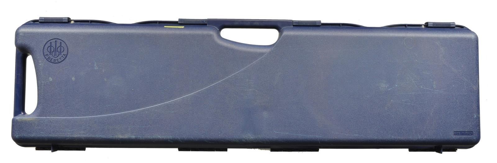 SHOTGUNS. 1) Cal. 20 Ga., 2 3/4" & 3". S# AA033601. Bbl. 28" VR w/ steel bead & fitted for Mobile chokes; full set of 5 tubes included. Left side of bbl. has gold inscription "Made Especially for Ken Behring". Matte black anodized alloy receiver w/ natural finished side panels having gold markings w/ game scenes having gold plated woodcock on right side & 2 flying pheasants on left side. Jeweled bolt & carrier. Gold finished trigger. Forearm & pistol grip buttstock of checkered fancy walnut having vivid marbling & dark streaking. LOP: 14 3/8" over solid black Beretta pad. UNATTACHED ACCESSORIES: blue molded case containing spare chokes, choke wrench, Beretta oil, stock shims, sling swivels, buttplate, grip cap, plug, owner's manual & warranty information. CONDITION: bbl. & action retain over 95% finish, left side of receiver shows area of light scratches. Stock & forearm have very good finish. Clean bright bore. (20-1172/DS). 2) Cal. 20 Ga., 3". S# AA033602. Bbl. 28" VR w/ steel bead & fitted for Mobile chokes; Imp. Mod., Mod., Imp. Cyl. & Cyl. tubes included. Left side of bbl. has inscription "Made Especially for Ken Behring". Matte black anodized alloy receiver w/ natural finished side panels having gold markings w/ game scenes having gold plated woodcock on right side & 2 flying pheasants on left side. Jeweled bolt & carrier. Gold finished trigger. Forearm & pistol grip buttstock of checkered fancy walnut having vivid marbling & dark streaking. LOP: 14 3/8" over solid black Beretta pad. Blue molded case containing spare chokes, choke wrench, Beretta oil, stock shims, sling swivels, buttplate, grip cap, plug, owner's manual & warranty information. CONDITION: action retains over 95% anodized finish showing area of light scratches across left side. Bbl. retains 95% blue w/ an area of spotted corrosion near muzzle. Wood has good finish, Stock has 2 areas of heavy dents on right side. (20-1173/DS). BOTH MODERN. $1,500-2,100.