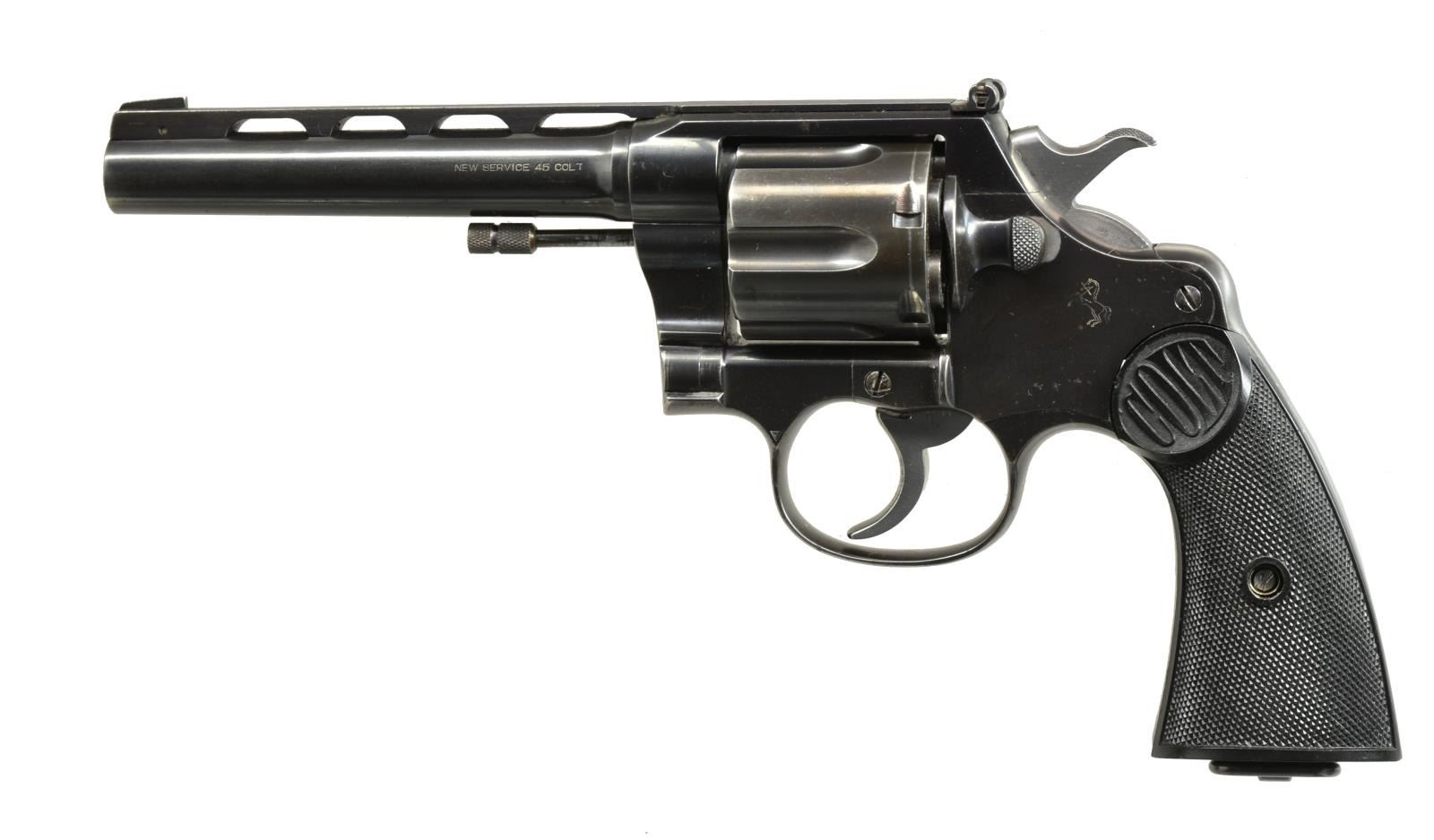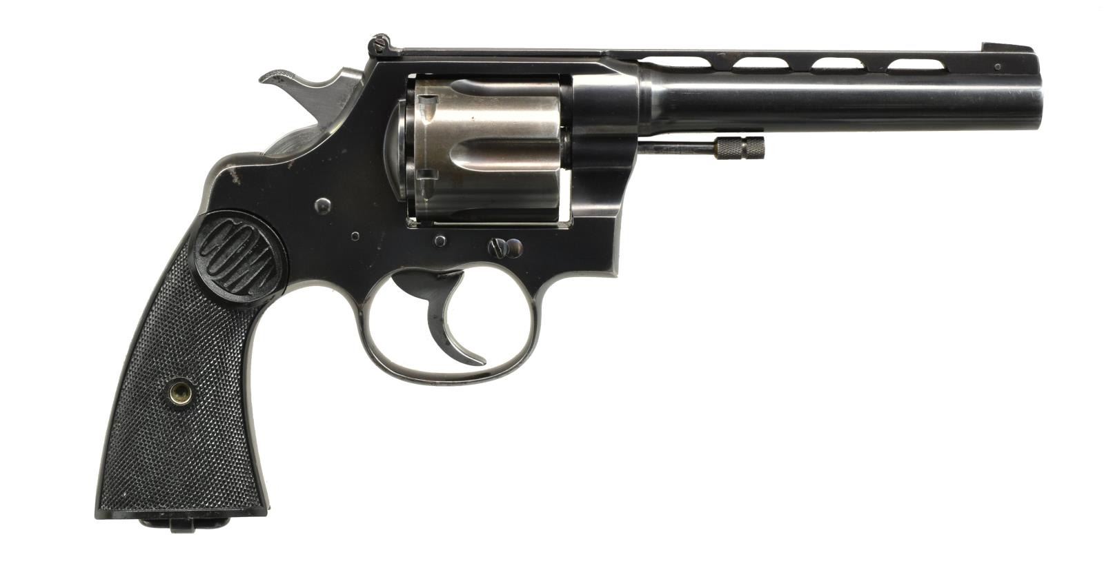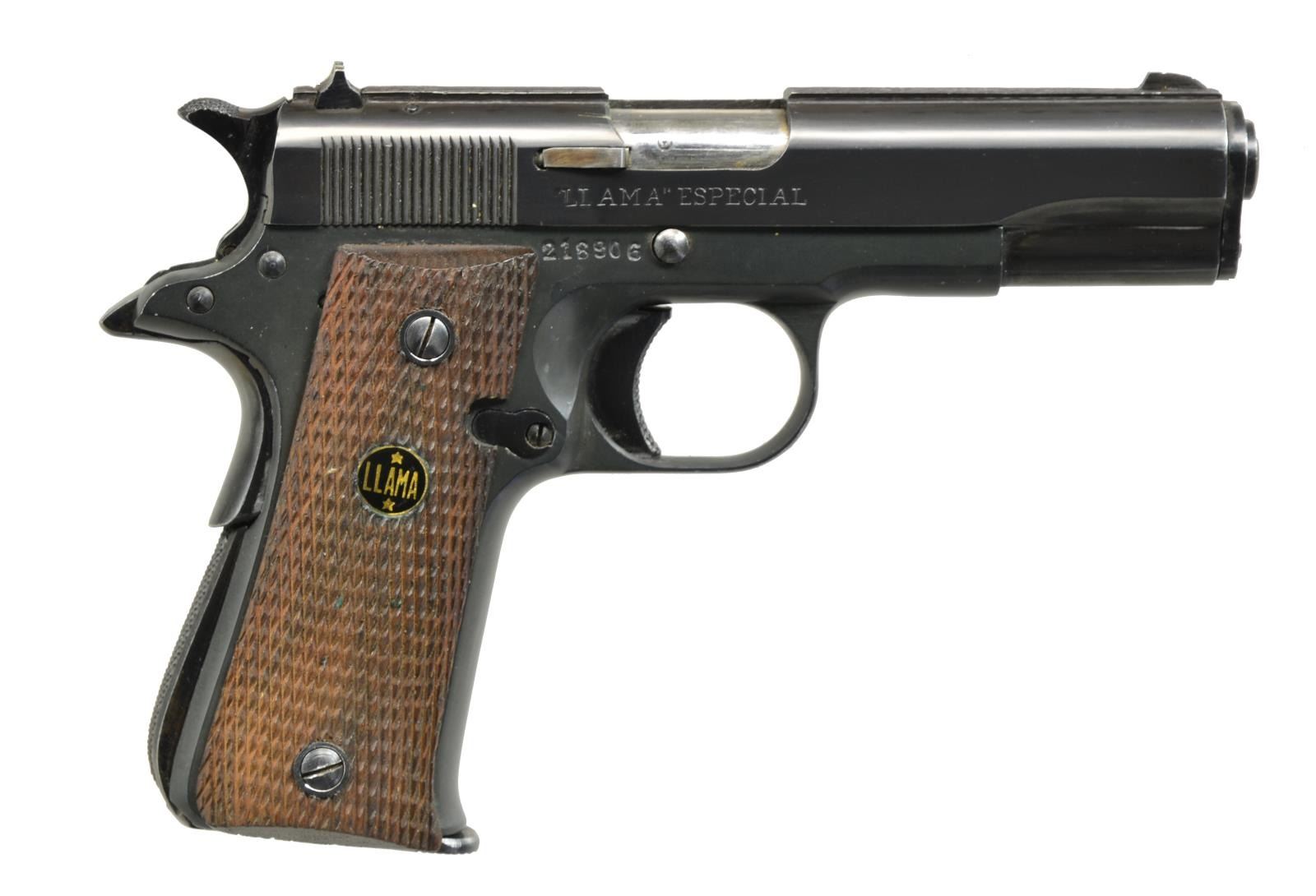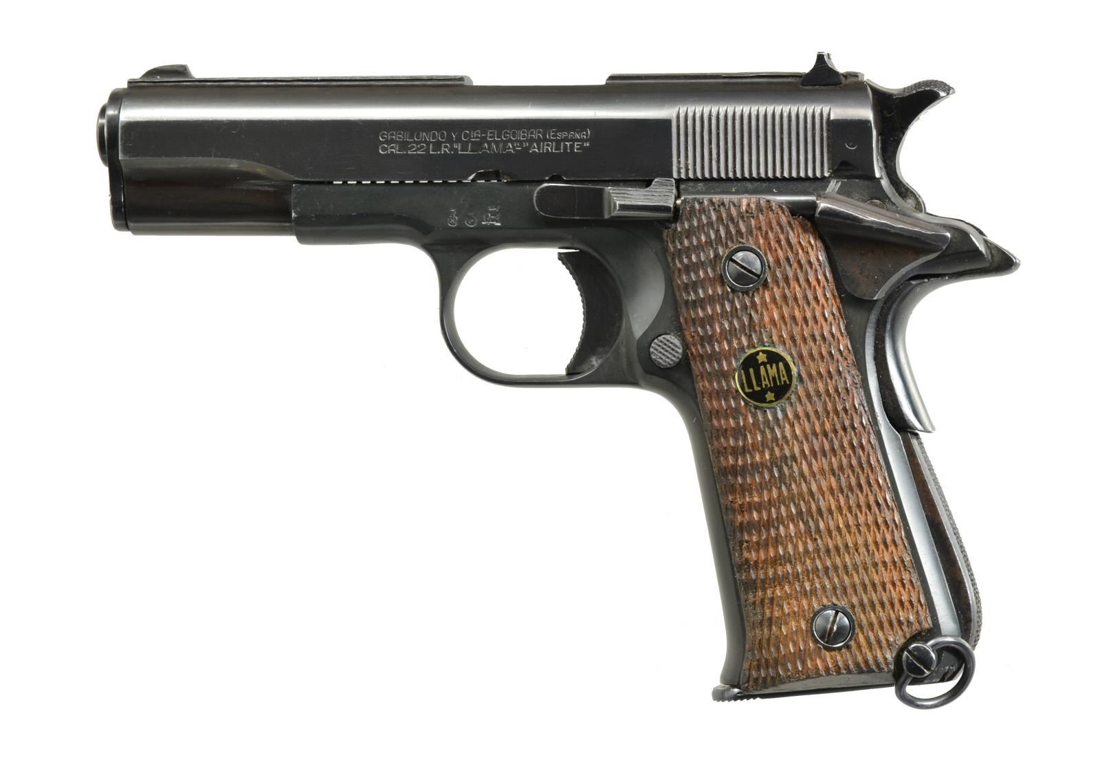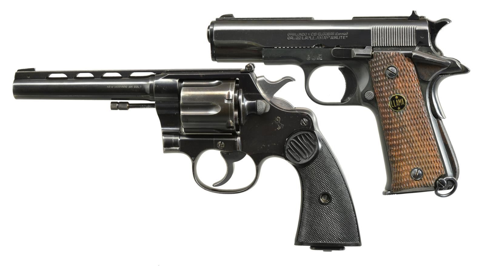 BOTH: cal. 22 LR. 1) LLAMA AIRLITE. S# 218906. Bbl. 3 3/4". Blued steel slide w/ "AIRLITE" on left side & "ESPECIAL" on right. Raised grooved solid rib w/ drift adj. rear sight. Alloy frame w/ lanyard loop at bottom left rear. Checkered walnut grips w/ Llama medallions. Scaled down version of Colt Model 1911 A-1. Date code of D-1 (1958). MAGS: 1 factory 10 rd. CONDITION: very good overall w/ slight high point thinning on slide. Near excellent frame, grips & bore. (20-2140/NW). 2) COLT NEW SERVICE. S# 329023. Bbl. 5 1/2". Mfg. 1929 w/ bbl. marked "45 COLT". Aftermarket black plastic replacement checkered Colt logo grips. Bbl. sleeved for 22 LR plus cyl. chambers have secured inserts along w/ modified extractor. Replacement firing pin for RF along w/ corresponding slotted bushing in frame. Raised VR w/ wide grooves on top secured at front w/ pin through sight blade & soldered to top strap at rear. 3/8" wide over bbl. & 1/2" over frame. Rear of frame has sight, adj. for windage by 2 opposing screws. Lanyard swivel on butt. CONDITION: good to very good overall appearance w/ high point & use wear along w/ occasional spots of peppery oxidation. Very good appearing grips; somewhat loose due to locating pins & pulled through escutcheon on left grip. Grip straps hand worn to void of finish. Clean hammer & trigger w/ traces of prior pitting. Lightly damaged screw heads. Bbl. liner originally match crowned to bbl. but has crept ahead about .015" leaving protrusion at front & recess at rear. Near excellent bore. (20-2148/NW). BOTH CURIO. $500-750.
