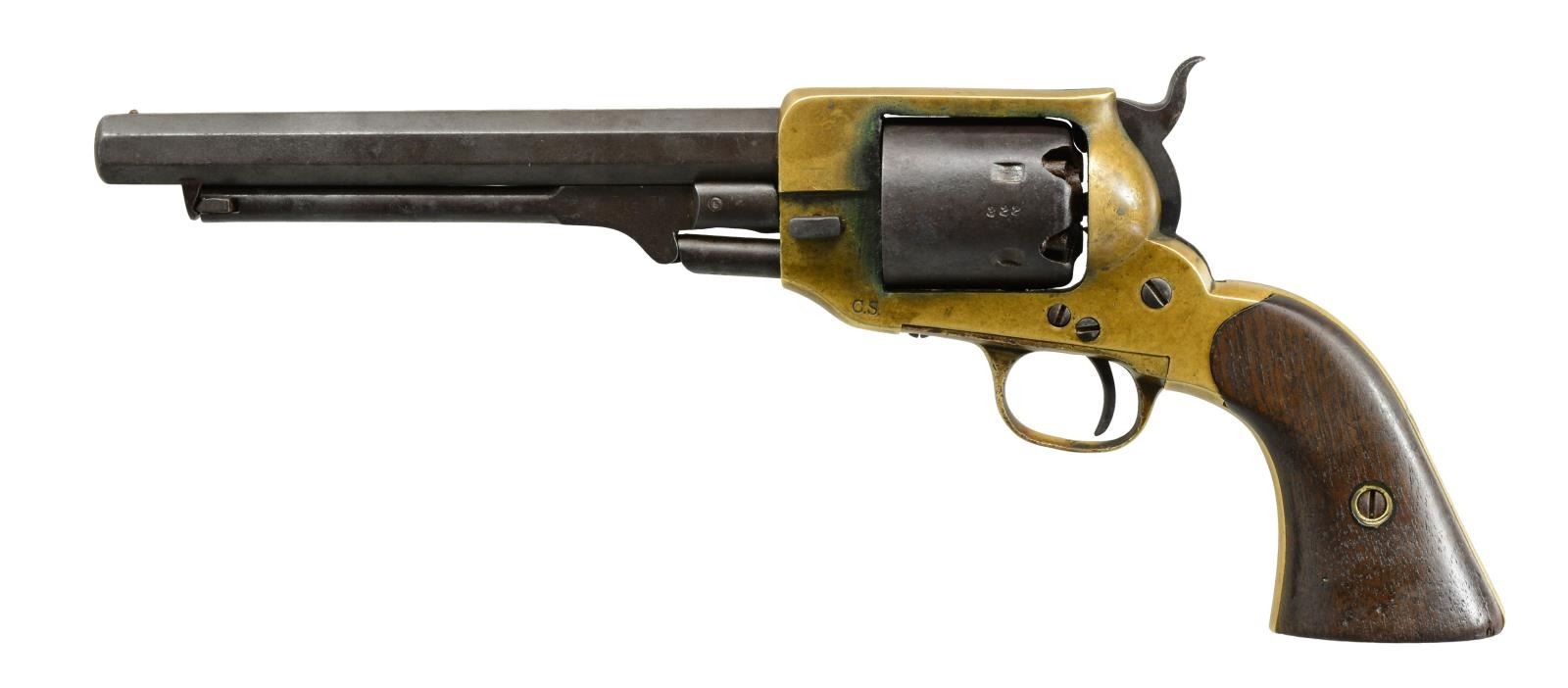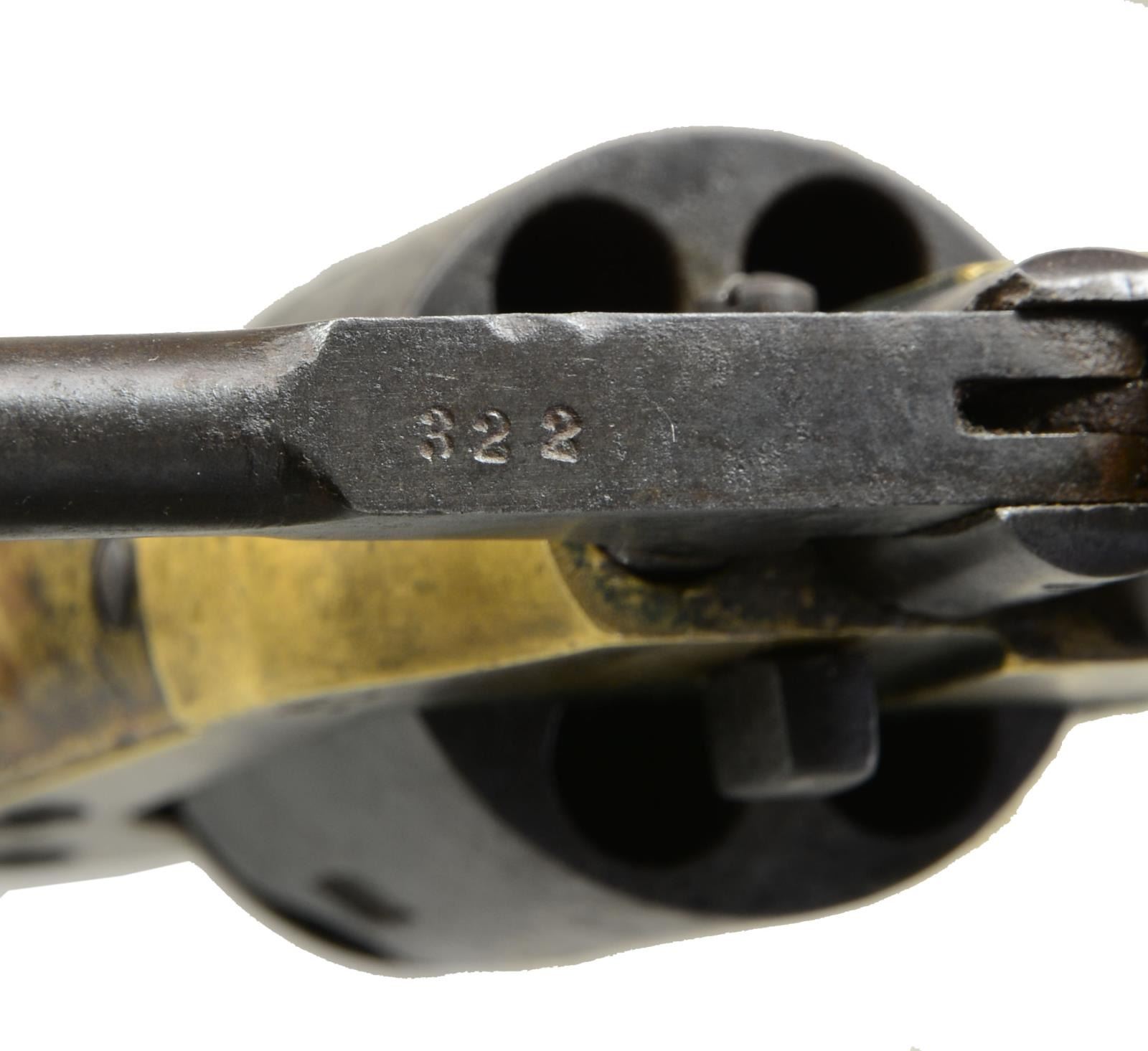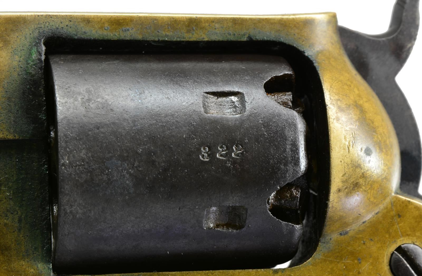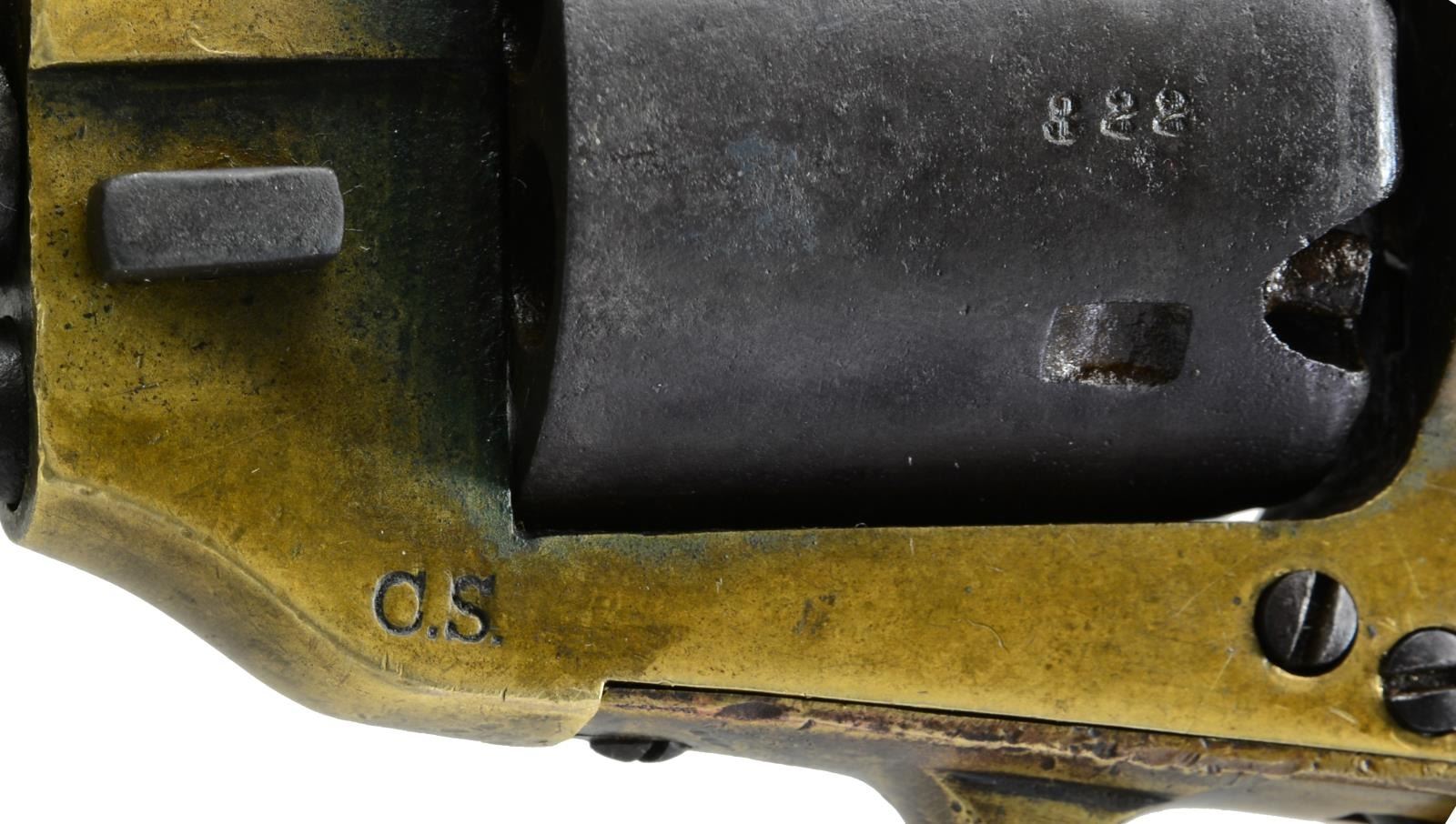 REVOLVER CARRIED BY JOHN D. GRADY, 5th ALABAMA CAVALRY. Cal. .36. S# 322. Bbl. 7" Octagonal bbl. This is the newest serial number added to database & was just recently discovered in Gadsden, Alabama. “J. D. GRADY” is nicely scratched on bottom of grip strap. John D. Grady (1843-1895) was born, raised & died in Chambers County, Alabama. He enlisted in Co. A, Hilliard’s Alabama Legion July 7, 1862 & by December this unit became Co. A, 5th Alabama Cavalry. This revolver bears the rare “triumphant” of markings found on Spillers, “SPILLER & BURR” on barrel., “C.S.” on frame & numbered cylinder. Serial number 322 is a number listed as being issued in June 1864 to Macon MSK. We know that this gun however was made in Atlanta Georgia in 1863 originally. It must have had a field failure after its 1863 issue, sent to Macon for repair and reissue. There is “W” inspection mark stamped in bottom of right grip seen on other known Macon Armory issued revolvers. UNATTACHED ACCESSORIES: there is a current updated article on Spiller & Burr accompanying lot w/ gun listed by serial number in the Macon Armory memorandum book accompanying lot. CONDITION: very good overall. When gun was originally discovered, it was missing trigger guard, thumb bolt screw, right grip rear toe was broken & hammer spur was broken. These issues were all addressed by expert antique firearm restorer & trigger guard was replaced with an original from a Civil War Whitney navy which Spillers are modeled after. All matching numbers with exception of trigger guard which has Whitney serial number. Traces of original finish on cylinder and bottom of barrel. Brass has a mixed mustard patina with areas of verdigris near face of cylinder. Iron overall has brown patina. Mechanics are crisp with well-defined rifled bore. Restoration report & photos of revolver when found are available upon request. Regardless of the minor professional restoration, this is a superior example of the most difficult to find complete of all CS primary revolvers & this is among the handful identified to Confederate who carried it. PROVENANCE: Gadsden, Alabama family. (01-18012/JS). ANTIQUE. $25,000-30,000.
