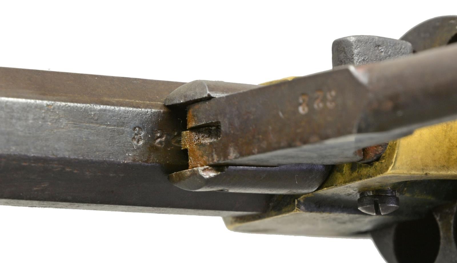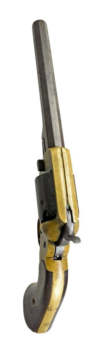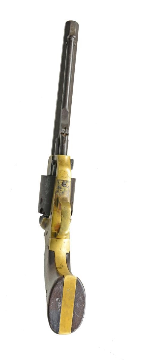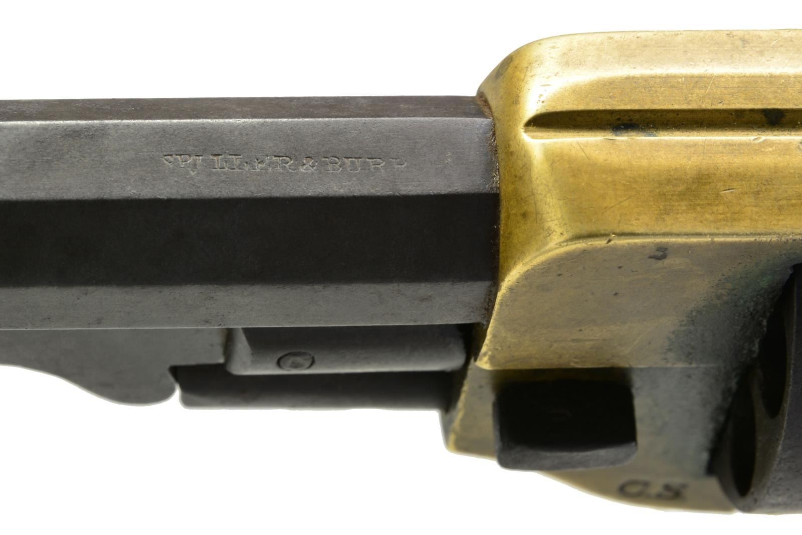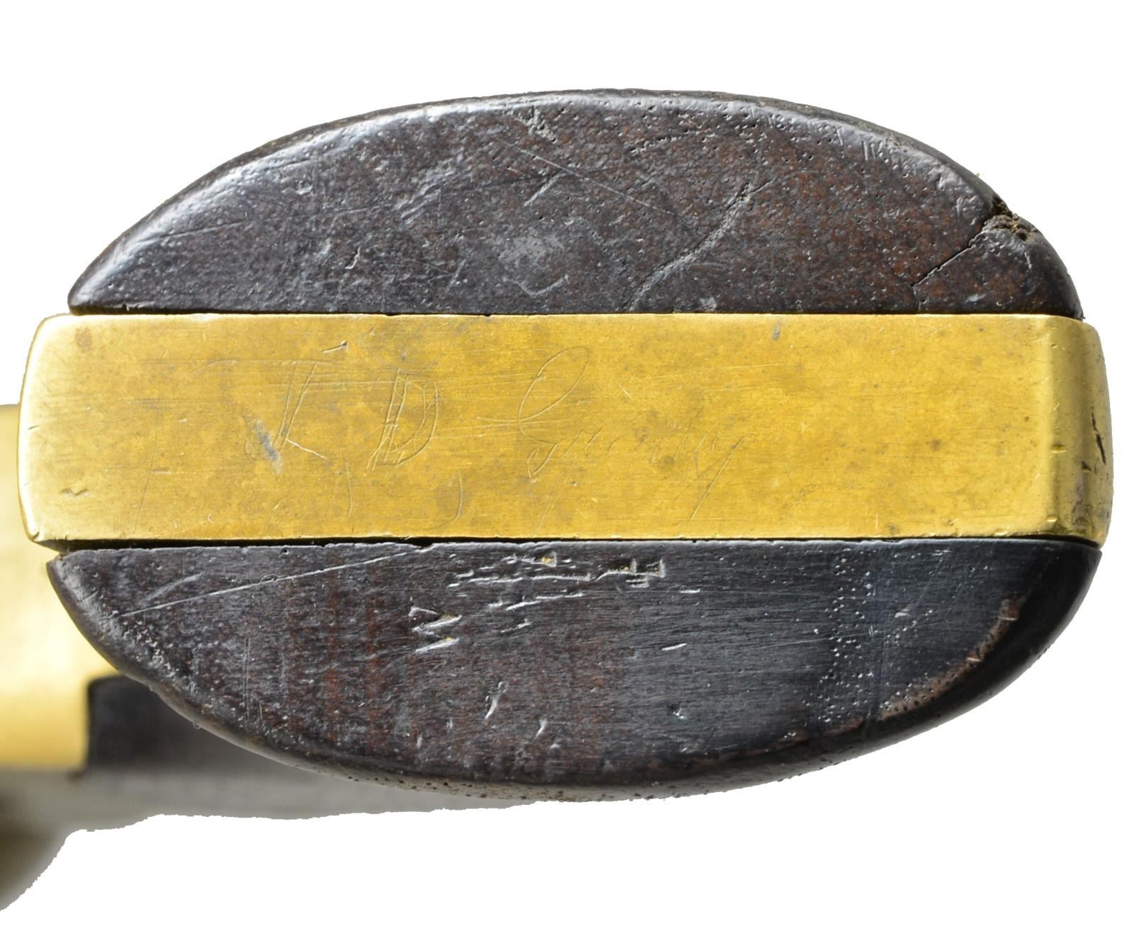 REVOLVER CARRIED BY JOHN D. GRADY, 5th ALABAMA CAVALRY. Cal. .36. S# 322. Bbl. 7" Octagonal bbl. This is the newest serial number added to database & was just recently discovered in Gadsden, Alabama. “J. D. GRADY” is nicely scratched on bottom of grip strap. John D. Grady (1843-1895) was born, raised & died in Chambers County, Alabama. He enlisted in Co. A, Hilliard’s Alabama Legion July 7, 1862 & by December this unit became Co. A, 5th Alabama Cavalry. This revolver bears the rare “triumphant” of markings found on Spillers, “SPILLER & BURR” on barrel., “C.S.” on frame & numbered cylinder. Serial number 322 is a number listed as being issued in June 1864 to Macon MSK. We know that this gun however was made in Atlanta Georgia in 1863 originally. It must have had a field failure after its 1863 issue, sent to Macon for repair and reissue. There is “W” inspection mark stamped in bottom of right grip seen on other known Macon Armory issued revolvers. UNATTACHED ACCESSORIES: there is a current updated article on Spiller & Burr accompanying lot w/ gun listed by serial number in the Macon Armory memorandum book accompanying lot. CONDITION: very good overall. When gun was originally discovered, it was missing trigger guard, thumb bolt screw, right grip rear toe was broken & hammer spur was broken. These issues were all addressed by expert antique firearm restorer & trigger guard was replaced with an original from a Civil War Whitney navy which Spillers are modeled after. All matching numbers with exception of trigger guard which has Whitney serial number. Traces of original finish on cylinder and bottom of barrel. Brass has a mixed mustard patina with areas of verdigris near face of cylinder. Iron overall has brown patina. Mechanics are crisp with well-defined rifled bore. Restoration report & photos of revolver when found are available upon request. Regardless of the minor professional restoration, this is a superior example of the most difficult to find complete of all CS primary revolvers & this is among the handful identified to Confederate who carried it. PROVENANCE: Gadsden, Alabama family. (01-18012/JS). ANTIQUE. $25,000-30,000.