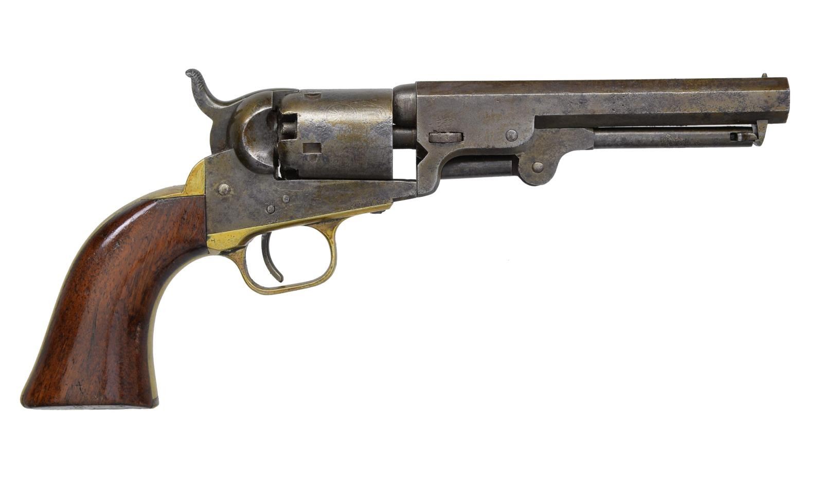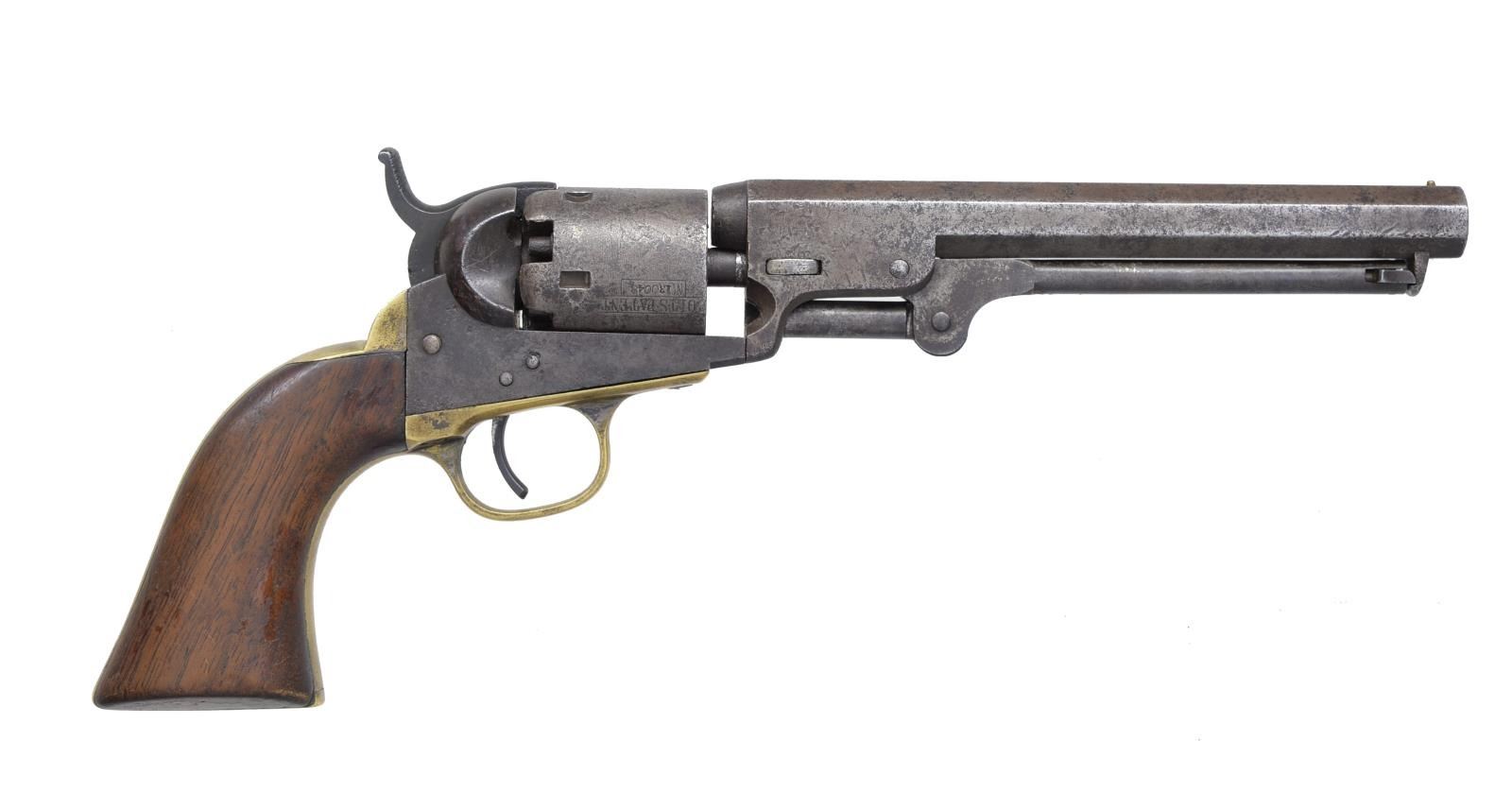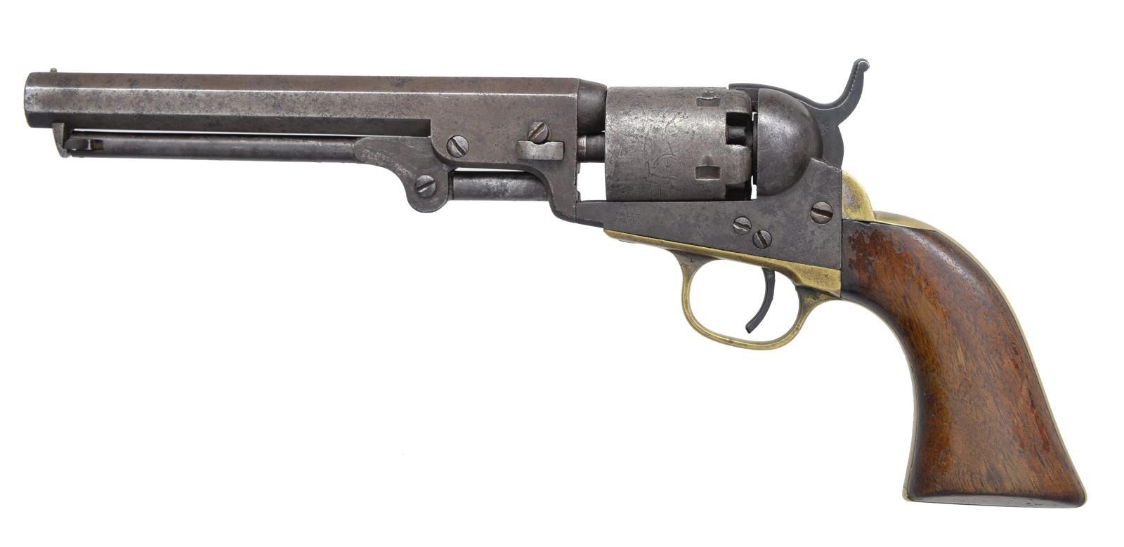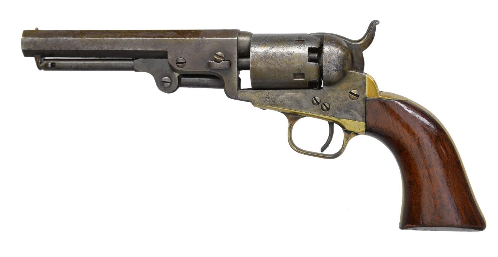 Cal. 31. S# 46858, 5” & S# 130048, 6”. This is a nice honest pair of Colt model 1849 pocket revolvers w/ the desirable longer bbls. popular among Civil War soldiers both North & South. Both are in standard configuration w/ 5 shot cylinders w/ rolled “stagecoach holdup” scene, 2-line bracketed New York addresses. CONDITION: both guns are good overall, all matching serial numbers & discernible markings. Both are overall mottled gray patinas w/ staining & pitting, brass cleaned on both guns. Both guns are mechanically functional though both a bit sloppy, bores have good discernible rifling. PROVENANCE: Collection of Roger Ballard. (01-18719; 01-18720/JS). BOTH ANTIQUE. $1,500-2,000.