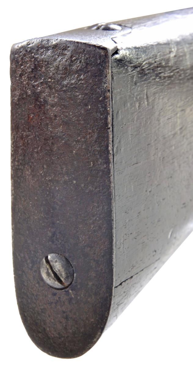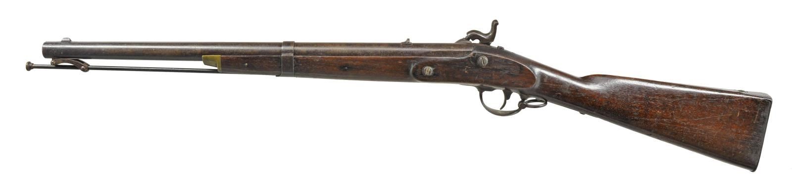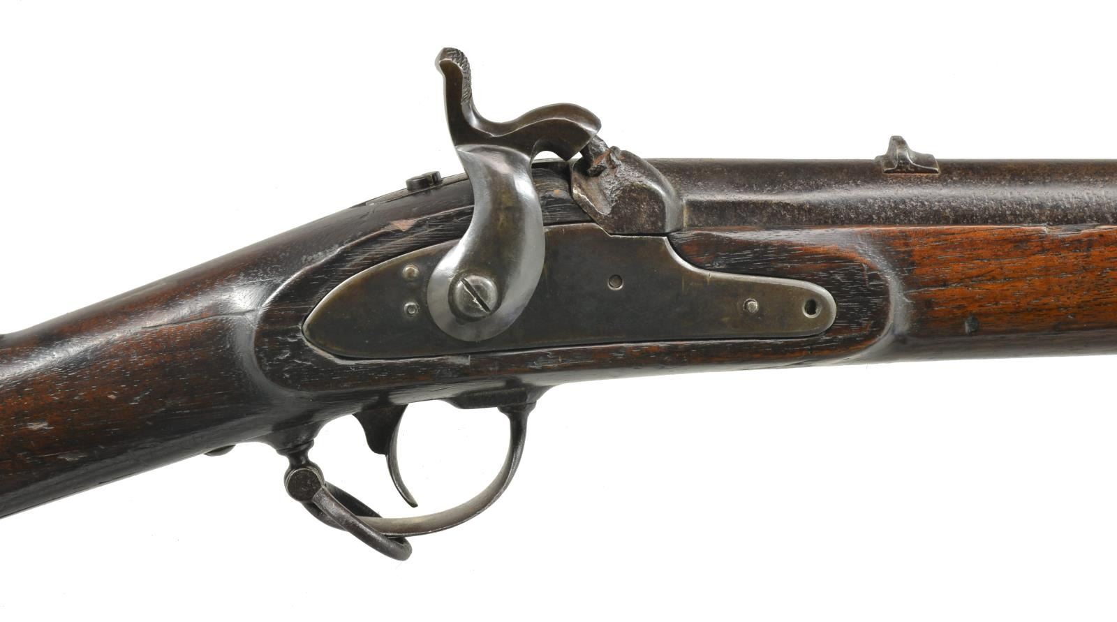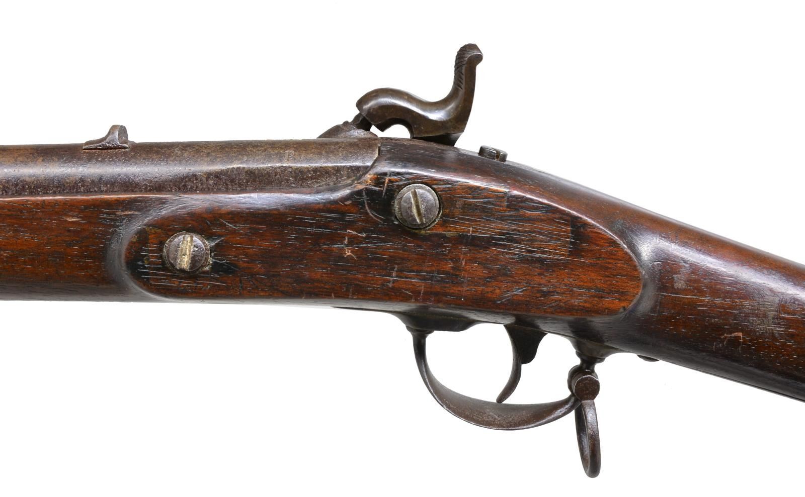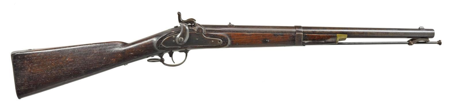Cal. 58. S# E 65. Round 22" bbl. surcharged “CSA / P”. This carbine is a copy of the US Model 1855 made at Pittsylvania Court House, Virginia in small quantities. These carbines typically come w/ pewter nose caps, & sometimes early numbers w/ brass nose caps, such as this one. Gun is serial numbered internally on bottom of bbl. "E 44" w/ matching “E 44” on stock rear of trigger guard. These guns typically saw very hard use w/ no discernible markings & poor stocks. This example has seen little honest use but well cared for & has "CSA / P" stamped on breech, though “CSA” is weak. Long mistakenly referred to as D. C. Hodgkins carbines & so listed in the early texts. Murphy & Madaus in their definitive 2002 text "Confederate Carbines & Musketoons", dedicate a chapter to this manufacturer which is found in provenance. CONDITION: good to very good overall, iron has overall brown patina w/ pitting especially at breech mostly obscuring “CSA” though “P” is well discerned. The lock is not numbered other than Roman numerals & is probably replaced though it fits well, lock refinished. Stock has inset repair opposite lock, otherwise stock has hand worn patina & superior condition to most Bilharz w/ sharp edges. Mechanically fine w/ good rifled bore. (01-18464/JS). ANTIQUE. $8,000-14,000.