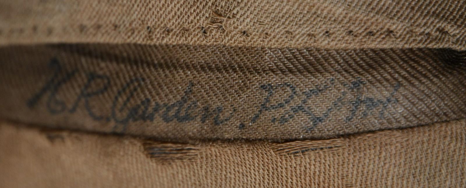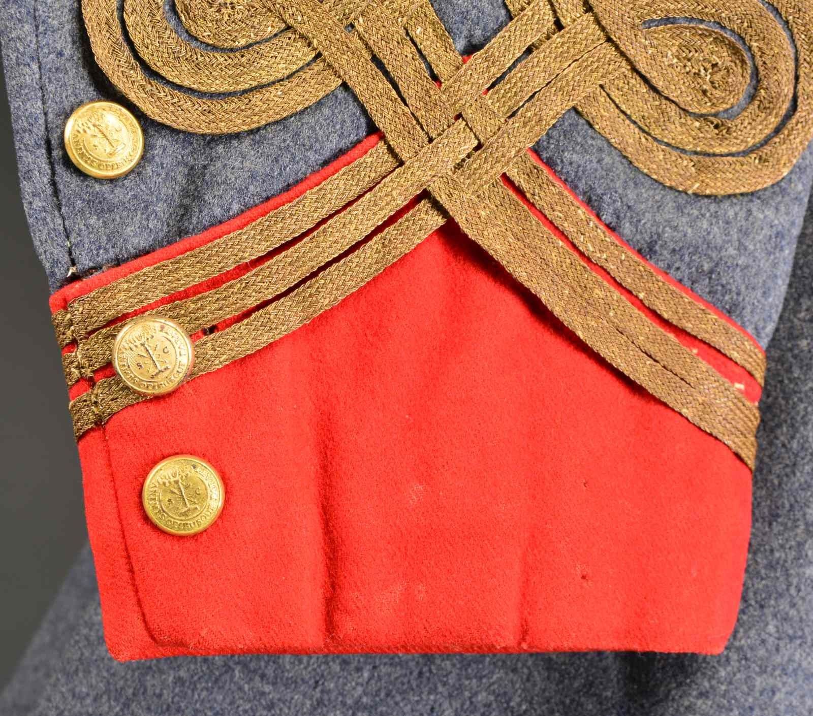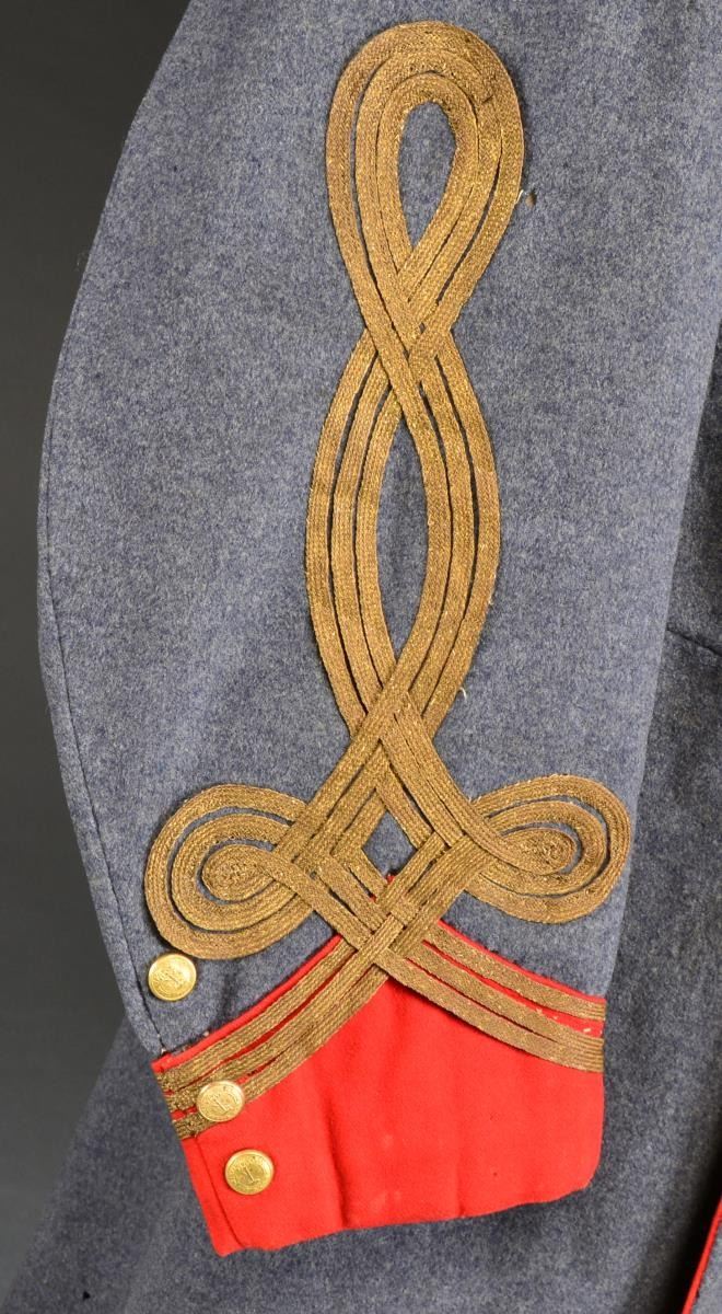 GARDEN, PALMETTO LIGHT ARTILLERY. Hugh Richardson Garden (1840-1910) entered the war April 9, 1861 as an infantryman but by early ’62 had organized & recruited his own company of 150 men to be officially known as the Palmetto Light Artillery. He fought in most major actions of the Army in Northern Virginia: Blackburn’s Ford VA (July 18, 1861), 1st Bull Run VA (July 21, 1861), Rappahannock Station VA (August 23, 1862), 2nd Bull Run VA (August 28-30, 1862), South Mountain VA (Sept. 14, 1862), Sharpsburg VA (Sept. 17, 1862), Fredericksburg VA (Dec. 13, 1862), Gettysburg PA (July 1-3, 1863), Bristoe Campaign (Oct. 9-22, 1863), Mine Run Campaign VA (Nov.-Dec. 1863), The Wilderness VA (May 5-6, 1864), Spotsylvania Court House Va (May 8-21, 1864), North Anna VA (May 23-26, 1864), Cold Harbor VA (June. 1-3, 1864), Petersburg Siege VA (June 1864-Apr. 1865) & Appomattox Court House VA (Apr. 9, 1865). Garden has a long illustrious biography prior to and after the Civil War, he was among the Southern elite and member of the South Carolina aristocracy. After the Civil War Capt. Garden practiced law and later in New York City was active in the newly founded New York chapter of Confederate Veterans. A file accompanies this lot with more in depth biography. This double breasted frock coat is trimmed with red collar, cuffs and edging plus 23 SC state seal buttons. The coat is identified in contemporary ink “H. R. Garden P. L. Art.” (Palmetto Light Artillery) on the inside of the right tail pocket. The original large coat buttons on this frock are back marked “Horstmann Bros. & Allien / NY”, the cuff buttons are Scovill, and these buttons postdate the war, the coat definitely has the style & materials consistent w/ wartime production including large bulbous sleeves 7 3/4” at elbows tapering to 4 3/4” at cuffs. The waist is not cut as narrow as usually seen war time and the tails are slightly shorter than usually seen war time. 3 Braids of quatrefoil on sleeve are consistent with war time production with red cuffs though 3 braids generally represent Colonel. The regulation red faced collar has no rank insignia but it is bordered with bullion trim braid. This is a very difficult coat to date, it has every appearance of being war time with minor tailoring differences as noted and the post war buttons could be later changes. Regardless, this is a stunning artillery frock coat worn by Capt. Hugh Richardson Garden. UNATTACHED ACCESSORIES: large file telling of Garden’s war record. Also accompanied by a Fonda Thomsen/Textile Preservation Association letter of authenticity. One highlight of Garden’s service was July 3, 1863 when one of his guns and four from the Washington Artillery were the only guns accompanying General Pickett in his famous infantry charge. Garden’s 12 lb. howitzer was disabled in the attack and Capt. Garden personally led a team to recover the gun. CONDITION: very good overall with light mothing, good colors, brown cotton lining attached, white sleeve lining with ticking intact and tight. Signature on tail pocket dark and easily discerned. (02-13595/JS). $20,000-30,000.