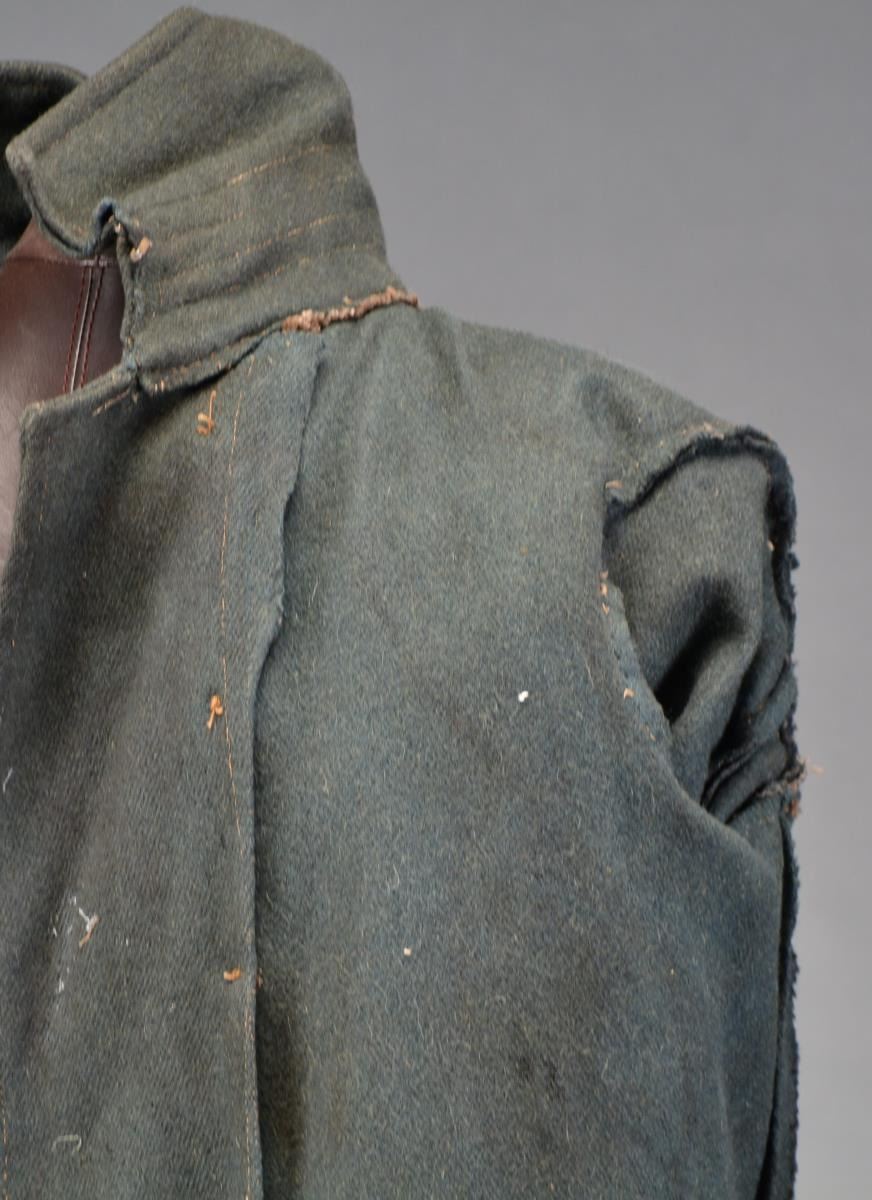 This is a rare & possibly unique example of Confederate ingenuity of repurposing regulation Union dbl. breasted overcoat by over dyeing, removing lining & cuffs, changing buttons to Georgia state seals & hard rubber. There is little reason for use of cloth covered Georgia state seal buttons other than to a Confederate soldier. Les Jensen wrote a good 2 page letter that describes & explains his conclusions as to possibility of Confederate usage; “Overcoat, double breasted, made of wool kersey, 2/2 twill, originally sky blue but dyed a dark color, probably black. This was a Federal mounted pattern overcoat, w/ a four-piece body & two-piece sleeves, double breasted w/ a stand & fall collar. It once had the length mounted cape which theoretically extended to the cuffs, but it has been cut off at 19” long at the front. The two top buttons are large size George state seals (GA 203 A.1.), one of which is back marked “W.C. MINTZER PHILA 1861.” The remaining buttons are hard rubber, black, back marked “N.R. Co GOODYEAR’s P=T. 1851”. Every indication that this is an original Civil War Federal mounted overcoat which has been over-dyed, the cuffs removed, the cape cut down, the lining removed & the buttons changed. The original body & sleeve lining is missing, as is the interlining from the collar & any stiffening that was in the button fails. The buttons are of the period, but it is difficult to tell when they were added. Certainly, there is contemporary Civil War evidence for a Confederate practice of dying captured Federal overcoats. At least one contract, for a firm in Richmond exists for “scouring & dyeing” captured clothing. William E. Doster’s “Lincoln & Episodes of the Civil War” (1915), p. 93 notes a Captain Charles Powell, CSA captured near Dumfries, VA in early 1863; “He wore, when captured a dark overcoat, which he said was taken at Dumfries from one of our soldiers. It was originally light blue, like all the soldiers’ overcoats, but was colored by the use of a butternut dye, at a factory in Gordonsville, where this change from federal to Confederate went on.” The overcoat used by the famous TN scout & martyr, Sam Davis, was variously described as Federal, Federal dyed black, homemade, butternut dyed, etc., & was supposedly dyed by his mother. It survives the Tennessee State Museum in Nashville.” UNATTACHED ACCESSORIES: Les Jensen report of authenticity accompanies. CONDITION: very good overall, supple & sound. (02-13605/JS). $4,000-6,000.