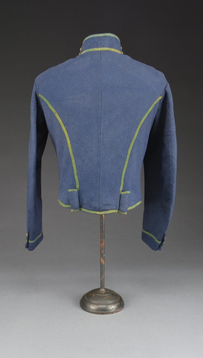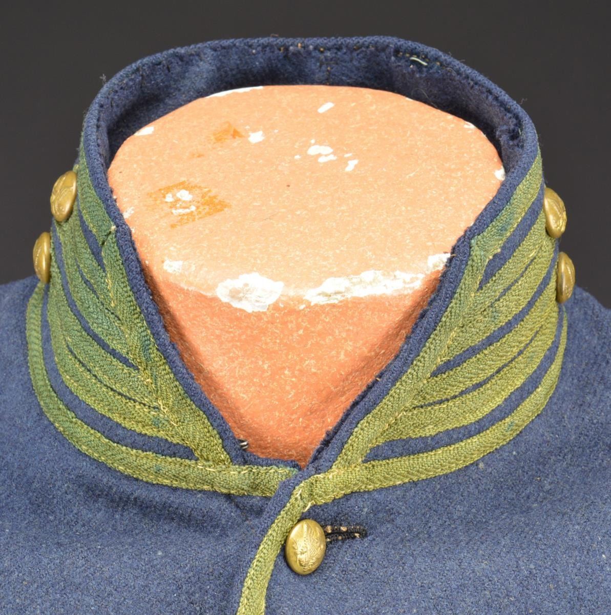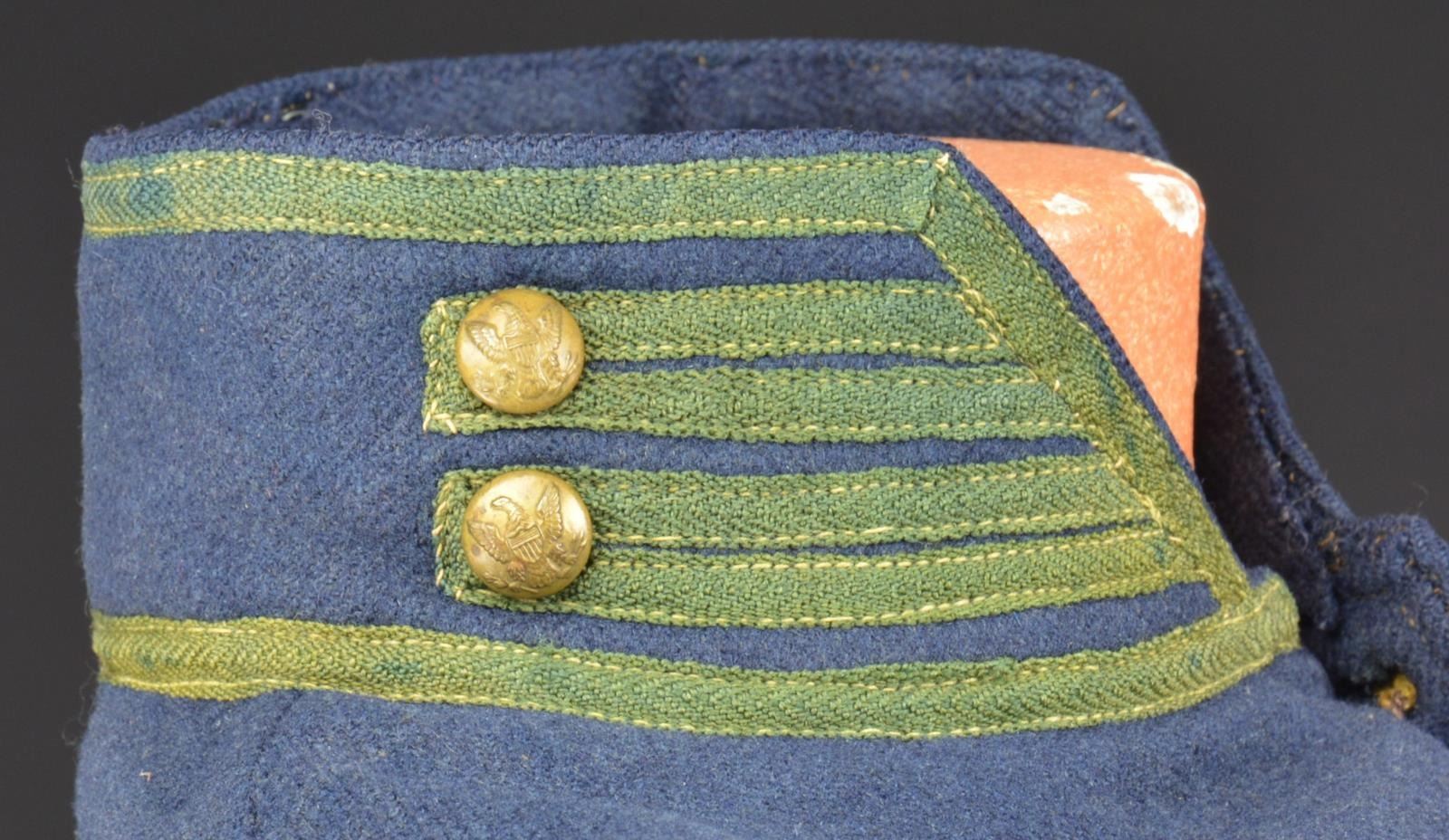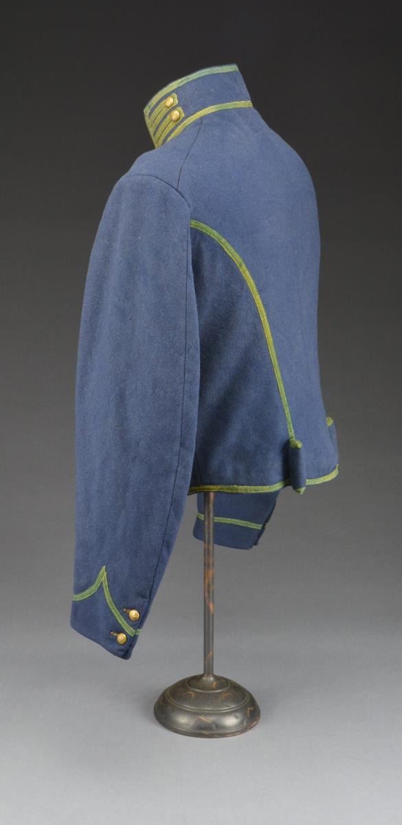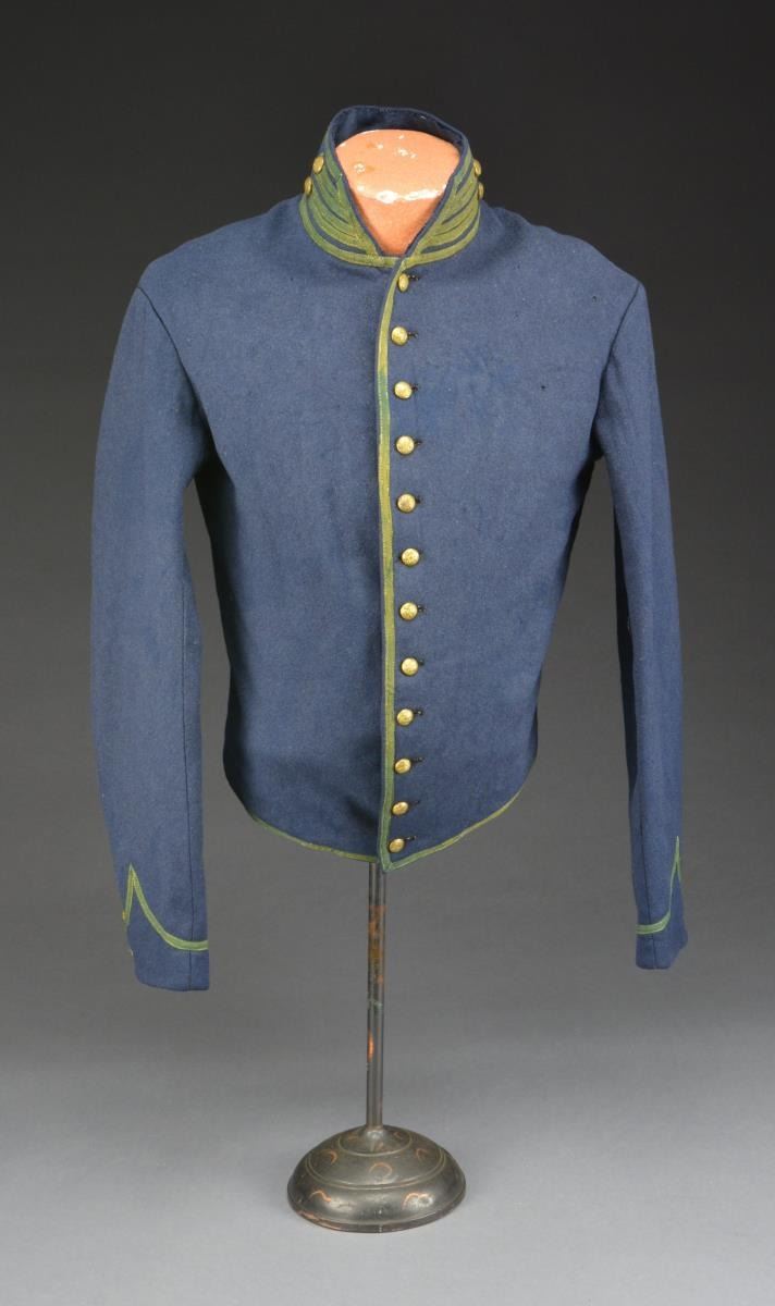 PERIOD U.S. MOUNTED RIFLEMAN'S SHELL JACKET. This jacket is one of the true rarities of uniform collecting. These uniforms were originally authorized for the US Mounted Rifle Regiments. They were used by the Mounted Rifles until August 3, 1861 when the Mounted Rifles became the 3rd US Cavalry & were issued yellow trimmed shell jackets. The remaining green trimmed shell jackets were issued to & used by the 1st & 2nd New York Mounted Rifle Regiments during the Civil War until mid 1863 when the 1st & 2nd New York Mounted Rifles were issued 2 button sack coats. This jacket has a dark blue body w/ a rich green trim. There are 11 period small eagle buttons down the front, 2 on each collar & 2 on each cuff. Both pillows on the lower back are intact. Lining is a light blue material which seems to be of cotton & wool. The right sleeve has a size “3” stamp along w/ a manufacturer’s mark that reads, “JOHN BOYLAN NEWARK N.J.” in a rectangle. Sleeves are lined w/ white cotton. UNATTACHED ACCESSORIES: binder of photos & paperwork collected by consignor. CONDITION: jacket has obviously been worn but is surprisingly solid & free of all but minor moth damage. The lining is threadbare in many areas but is quite solid throughout. Sleeve linings are complete w/ minor staining. (02-14671/BF). $7,000-13,000.