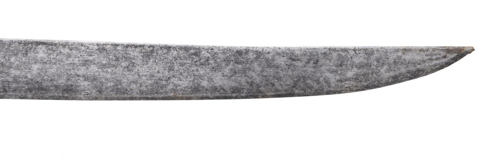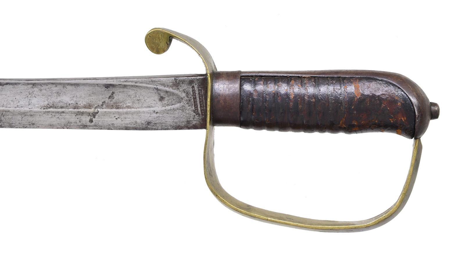 Overall length: 42". Blade length: 36". This Confederate saber represents one of the most difficult Confederate cavalry sabers to acquire. Sharp & Hamilton worked in Nashville, TN on the Franklin Turnpike and produced arms for the Confederacy. Sharp & Hamilton rented a building and equipment from A.W. Putnam and the firm was known locally as the Tennessee Plow Works or Putnam’s Plow Factory. After a devastating fire, the building was rebuilt and the company was reformed as the more familiar Nashville Plow Works. This saber represents a product of Sharp & Hamilton prior to the catastrophic fire. Unlike many examples, this saber is marked, “SHARP & HAMILTON” and “NASHVILLE TENN”. Blade has a single unstopped fuller and is marked on the ricasso in a cartouche like stamp, “NASHVILLE TENN / SHARP & HAMILTON”. Cast brass guard with solid teardrop quillon. Iron backstrap and ferrule with leather grip. Iron scabbard with iron throat and drag. Brass ring mounts with iron suspension rings. Scabbard has a wide leaded seam running the length of the scabbard. CONDITION: blade has a medium gray mottled patina. The marks at the ricasso can be easily read. Hilt is undamaged. Leather is only slightly flaked. Scabbard is exceptionally solid and even retains a portion of leather hanging strap through the top ring. (02-14529/BF). $15,000-18,000.