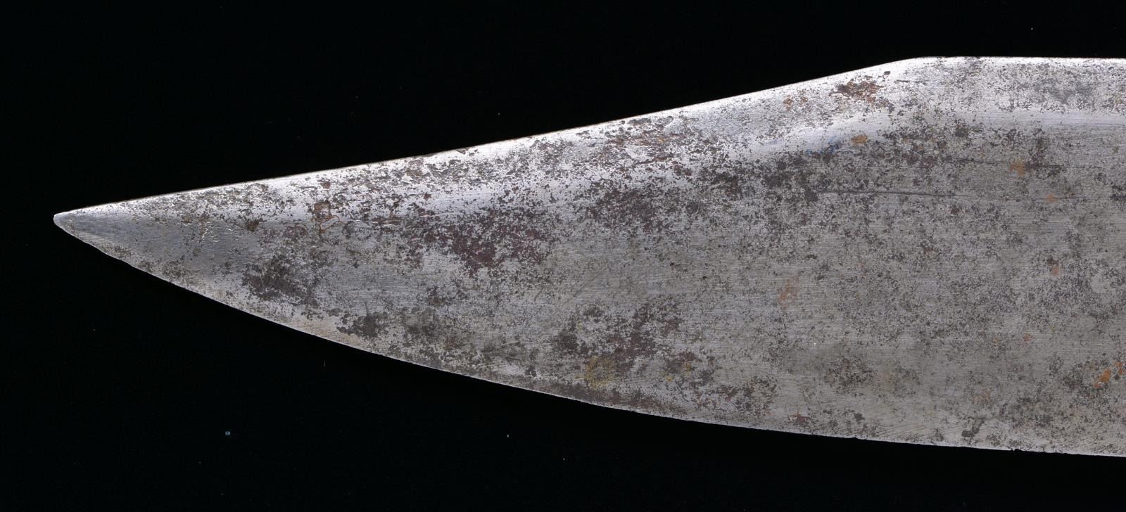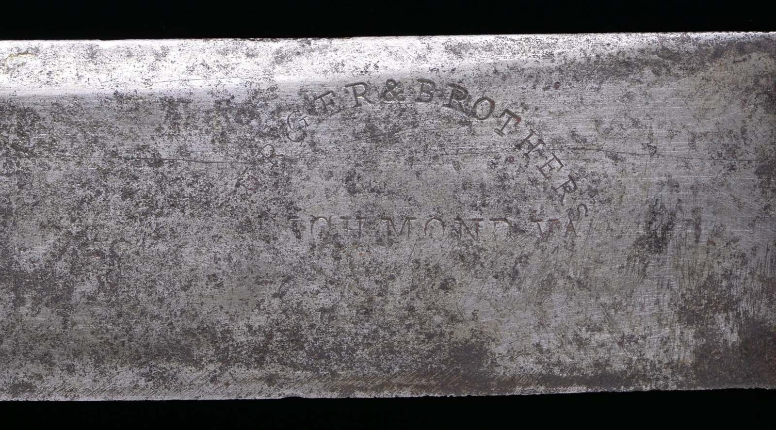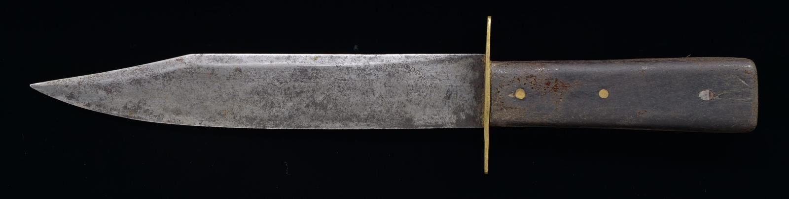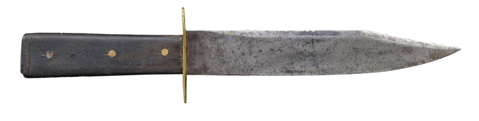 15” Overall, 9.5” clip point blade, 1 5/8” wide, .2” thick, 3.5” brass rounded ends cross guard. Knife is maker marked: “BURGER & BROTHERS” in arc above “RICHMOND VA” in larger separate straight die. As noted in “Confederate Bowie Knives” by Melton, Phillips, & Sexton “Burger & Bros, "camp" bowie is the most seldom encountered variety today, not because it was made in few numbers, but because of an extremely high attrition rate from postwar use. This size knife was handy for just about anything…” This variety of “RICHMOND VA” marking was not available when the book was published, but it is absolutely original. The blade exhibits a spine bevel that extends link the blade almost to guard which is only seen by this particular manufacturer. The flat wood slab grips are retained by 2 brass & one iron pin, which is different than the rounded slab seen most often. CONDITION: very good overall, blade is overall gray w/ scattered staining & light pitting, marking is mostly discernible though the 1st letter in each line is weak. Cross guard has been cleaned & has a light mustard patina, wood grips are well fit w/ remnants of varnish. (02-14526/JS). $8,000-12,000.
