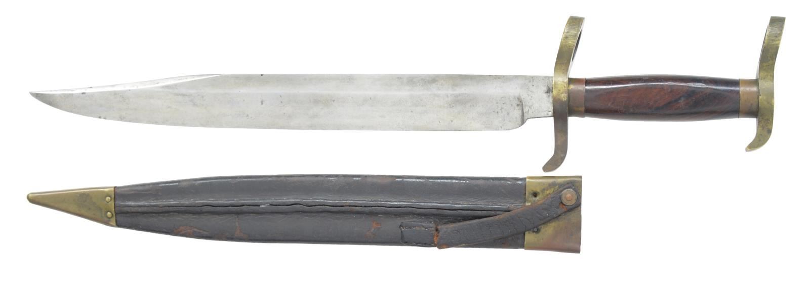 OF COOK & BROTHER OF NEW ORLEANS. This is a very fine example of a classic Confederate bowie made w/ 2 unfinished brass muzzle rings, well finished rosewood grip, 12 1/2” clip point blade & original brass mounted sheath. Norm Flayderman in his monumental text “The Bowie Knife” “the only mention of the term “Bowie-Bayonet” in literature leading up to the Civil War is made by U.S. admiral John Dahlgren who coined the term for his knife used on a navy rifle". His lesser known brother Confederate General Charles Dahlgren notes in early war telegrams that he wishes “Bowie knives put on guns, Cook in New Orleans can do it” & in a second telegram a few days later he wishes the bowie knives not get put on guns. This explains the reason for such variation in the “muzzle rings” or lack of muzzle rings plus filed muzzle rings. Rosewood is never seen on Confederate weapons w/ the exception of this genre of bowie. New Orleans is well known however for the use of rosewood, antebellum bowies & surgical tools. The use of “punch marks” & pins to secure scabbard mts. is also seen in marked Cook cutlass scabbards. It would be difficult to find a better complete example of this Confederate bowie. CONDITION: very good to fine overall; blade is gray/bright w/ light staining, brass mts. to grip & sheath have mixed dark mustard patina, leather sheath body is sound & solid retaining most of its original finish w/ scuffing & chipping, original 4” sewn belt loop is complete but broken at one end, sheath mts. are punched & pinned; missing 4 pins. (02-13591/JS). $3,000-4,000.