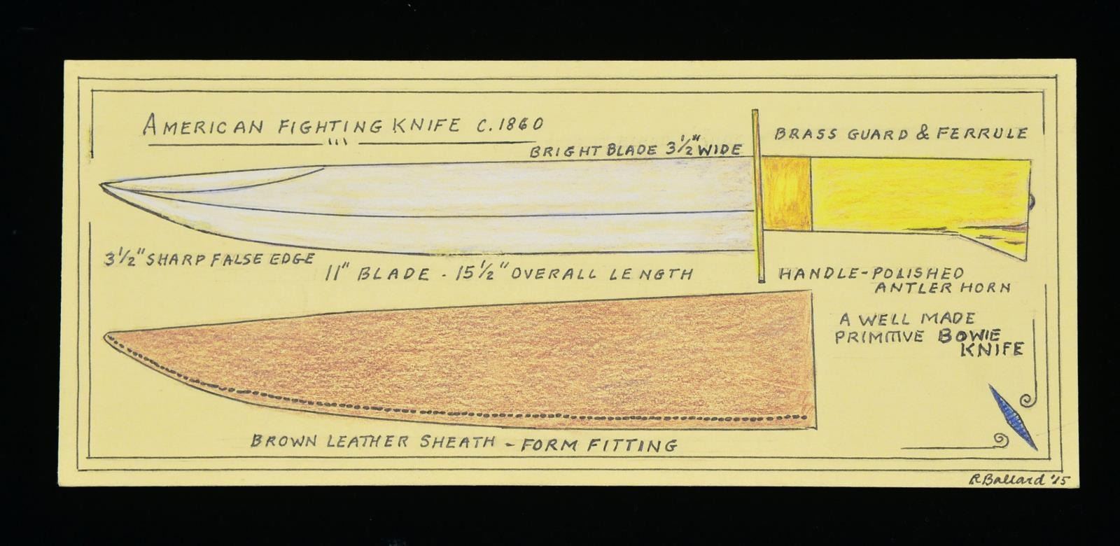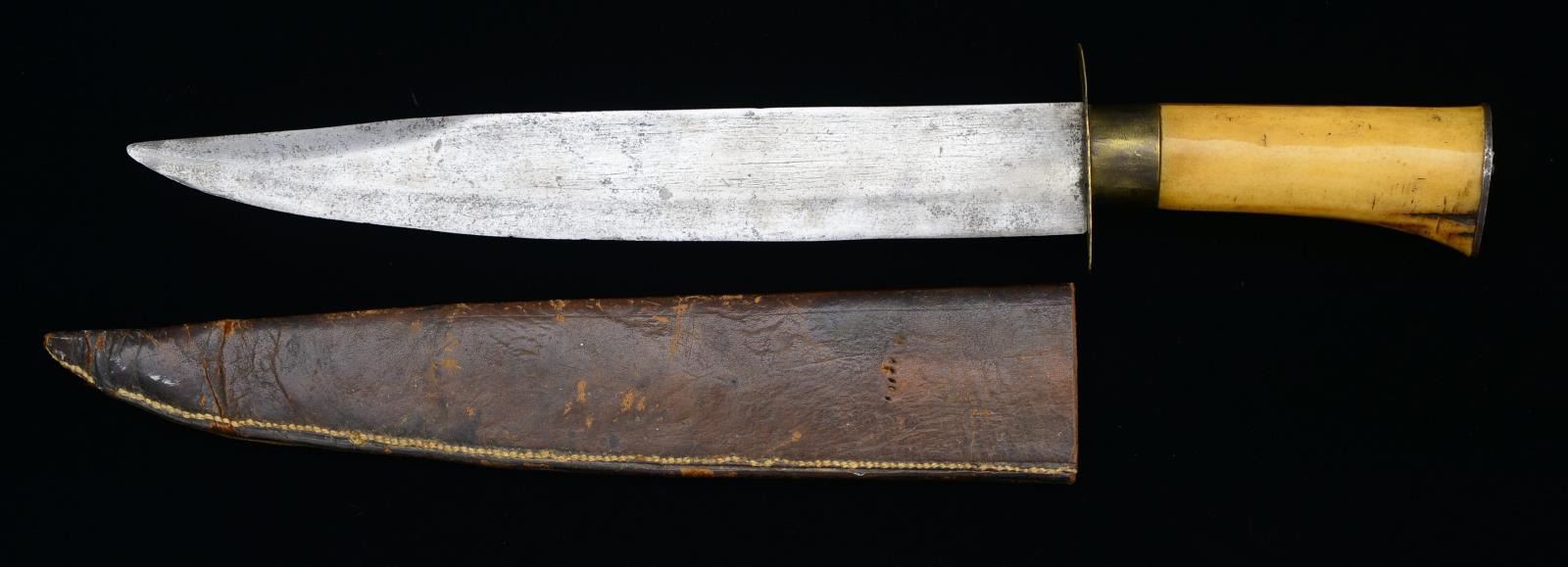 15.5" Overall, 11” clip point blade, 3.5” sharp & false edge, polished bone grip w/ brass ferrule & lozenge -shaped cross guard, well fit brown leather sheath. UNATTACHED ACCESSORIES: accompanied by hand-drawn card by Mr. Ballard. CONDITION: very good overall, blade is overall gray/bright w/ staining & light pitting, carved bone grip w/ 2 carved flats at top has hand worn patina, she is missing some belt loop w/ bins & folds near tip. PROVENANCE: Collection of Roger Ballard. (02-14714/JS). $800-1,200.