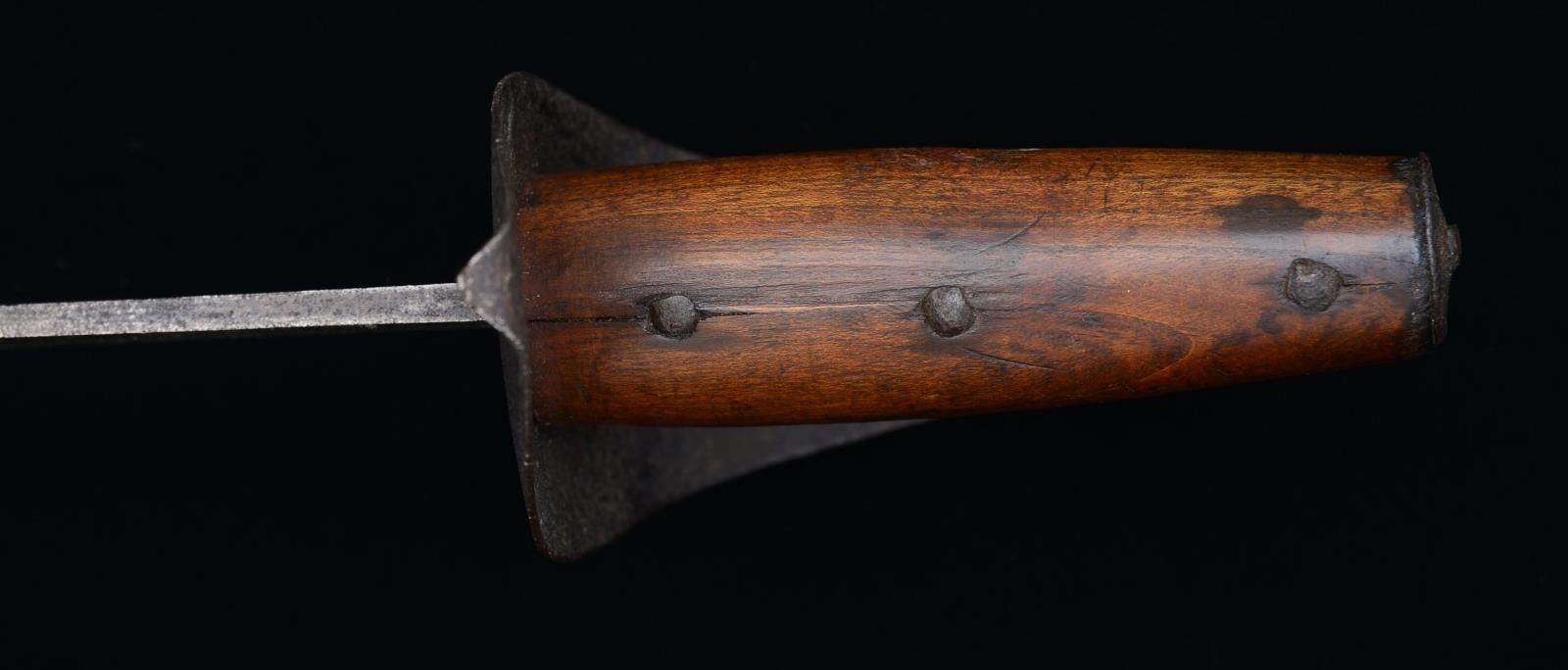 Typical American wood handled cutlass. 31" Overall. 26.5" single fullered Solingen blade w/ a “running wolf” cypher stamped on either side. UNATTACHED ACCESSORIES: collector notes & correspondence. CONDITION: very good overall. PROVENANCE: From the Collection of John "Tim" Breth Jr. (02-13827/JS). $1,200-1,500.
