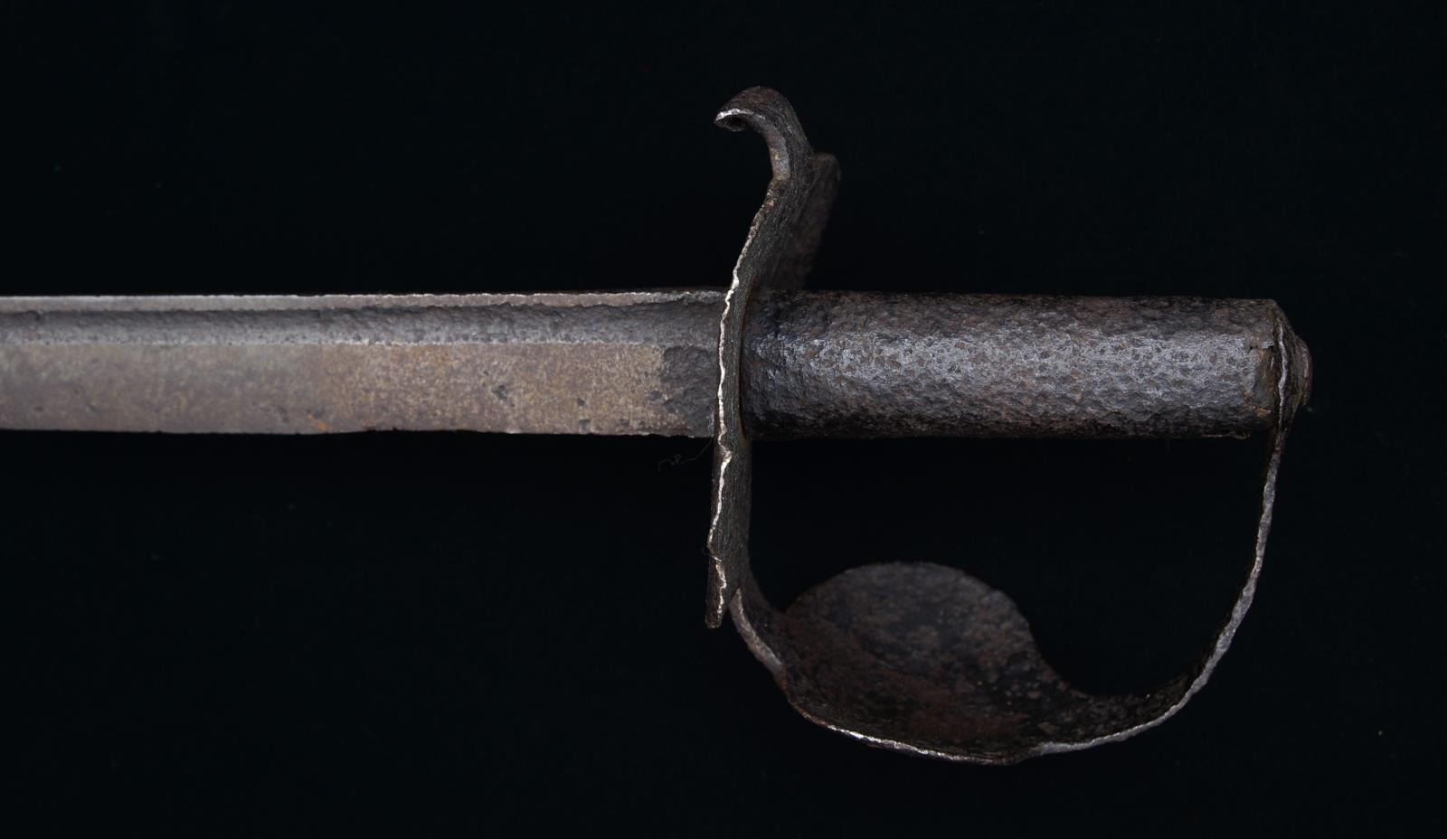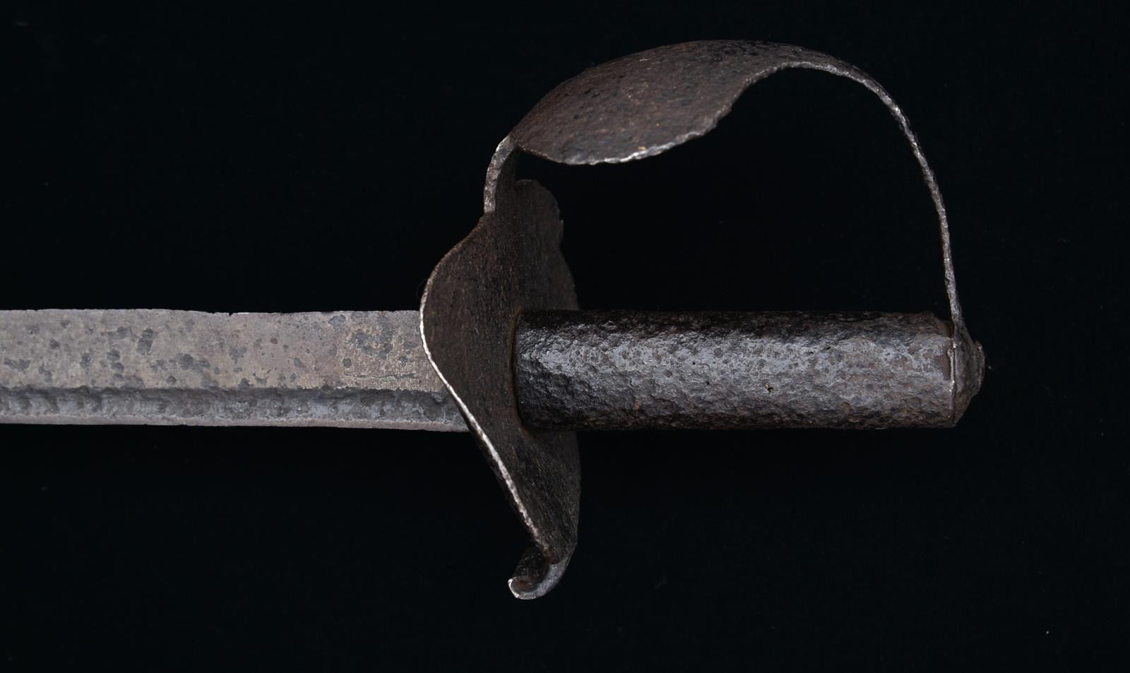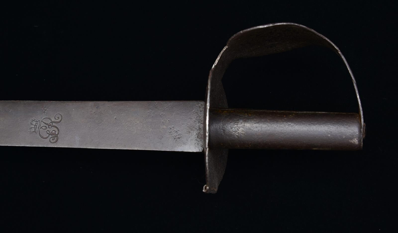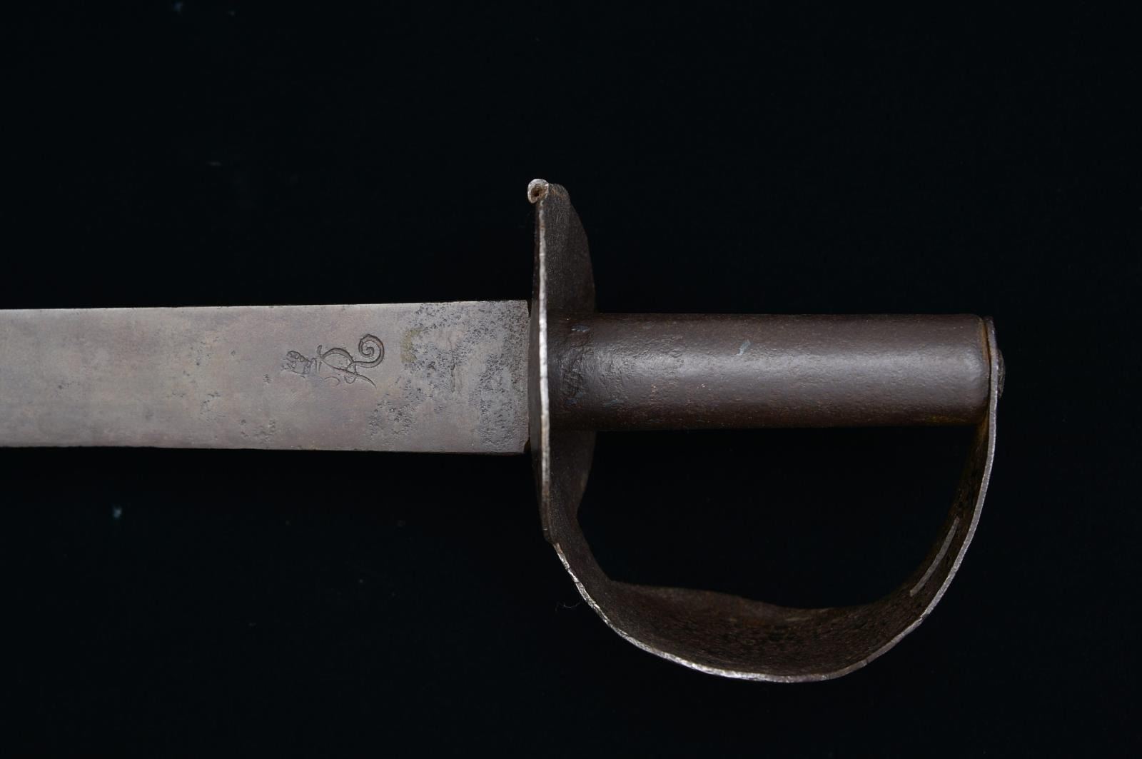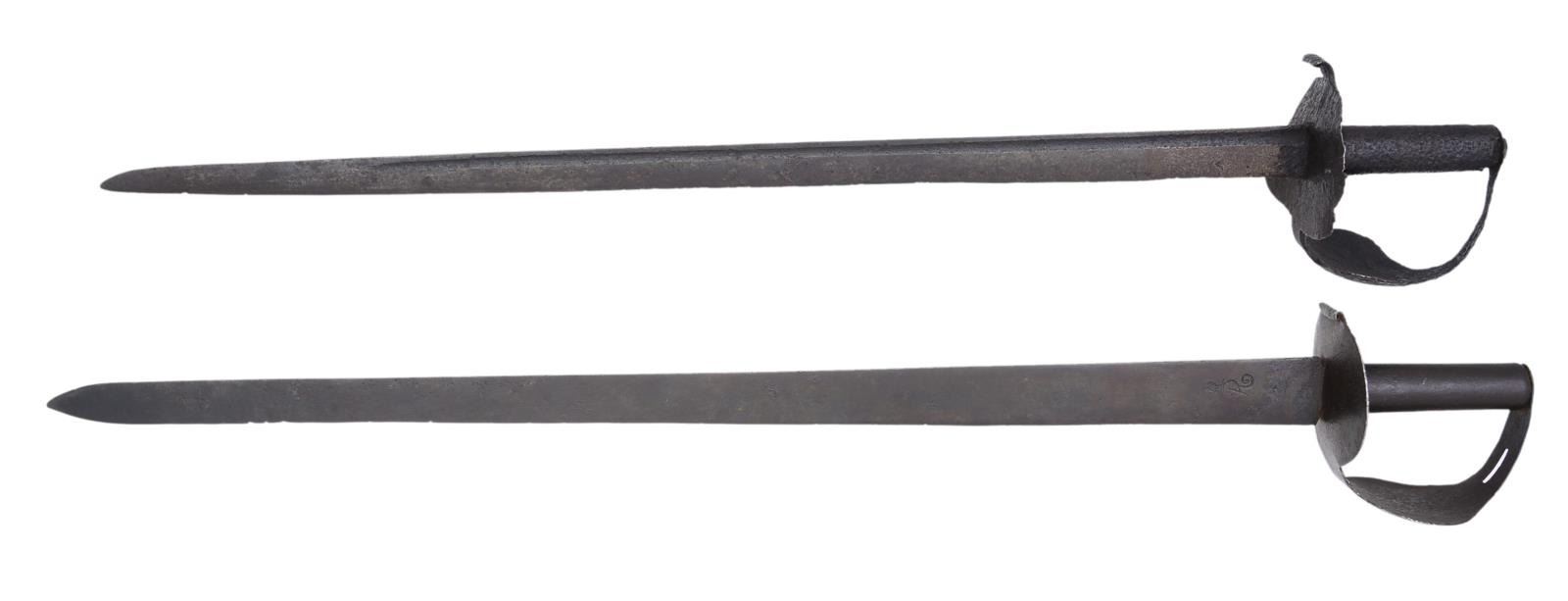 1) Regulation “figure 8” or “double disc” British Naval cutlass 1775-1790, 33 1/2" overall, 29 1/2" flat blade w/ crown over GR cipher on both sides. Lapped sheet iron handle & iron guard. CONDITION: good to very good overall w/ dark iron patina w/ pitting. 2) Relic American copy of British Naval cutlass above, 32" overall, 28" single fuller blade. CONDITION: good for a relic heavy iron patina, pitted overall. PROVENANCE: From the Collection of John "Tim" Breth Jr. (02-13822; 02-13825/JS). $800-1,200.