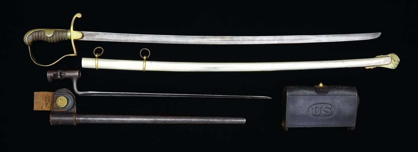 MCKEEVER CARTRIDGE BOX. 1) M1872. Overall length: 35”. Blade length: 29”. Unmarked blade has a single wide fuller. Gilded brass hilt. Wire wrapped sharkskin grip. Gilded brass mounted, plated scabbard. CONDITION: blade has a medium gray mottled patina w/ areas of cleaned pitting. Tip has been reshaped. Hilt shows only traces of original gilding & is a bit misshaped. Grip shows moderate wear. Scabbard shows overall light wear. 2) 45-70 BAYONET. Overall length: 21 1/4". Bayonet has a blued finish & is stamped, “US” on the flat. Scabbard has a leather belt attachment w/ a brass “US” button. CONDITION: bayonet retains nearly all of its blued finish. Scabbard shows moderate wear. Belt loop has lost most of its finish. 3) MCKEEVER CARTRIDGE BOX. Black leather box w/ “US” in oval impressed on the front. Box contains 20 shell casings for a 45-70 rifle. CONDITION: box shows moderate wear overall. (02-14700/BF). $200-300.