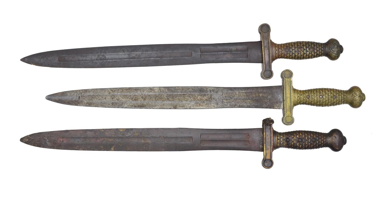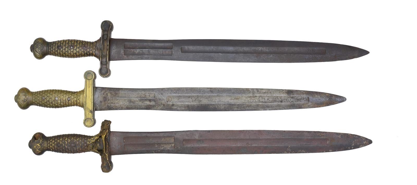 1) 1833 Dated. CONDITION: good-very good overall blade has gray patina w/ discernible makers mark & date, hilt has dark olive colored patina, large debts on one side of cross guard where rack markings stamped. 2) No date discernible. CONDITION: good to very good overall, blade has brown patina under old silver paint, markings not discernible, hilt has medium mustard patina 3) Burned relic w/ eagles removed from pommel. CONDITION: poor to fair overall, blade has dark brown patina & fire scale, guard has eagles filed off & cross guard is partially melted & puddled. (02-14416/JS). $500-800.