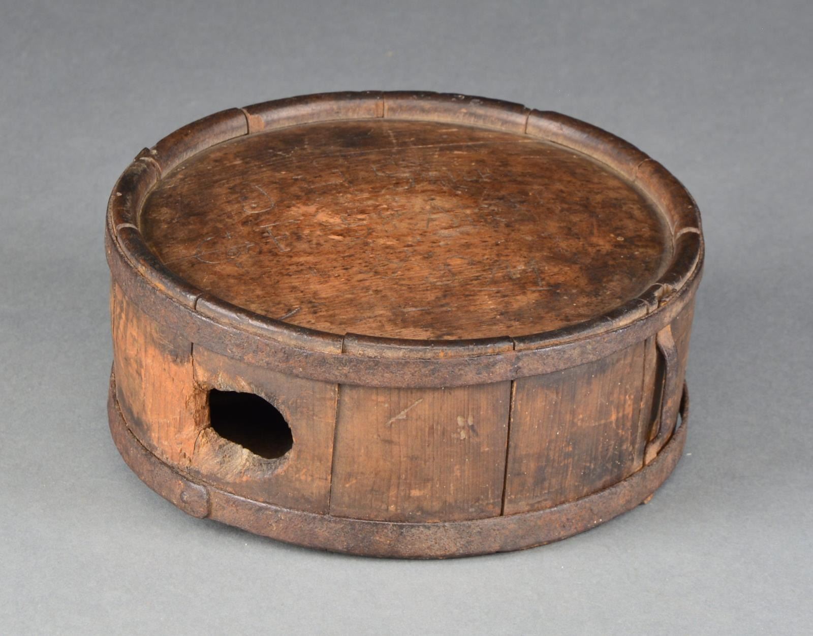 58TH ALA. Impeccably carved “J H SMITH / Co F 58 Ala.”. Canteens both North & South are often identified by soldiers scratching or carving names or initials; it’s always scarce though to find full name, company & regiment. It is interesting to note that there are also 2 other sets of initials carved into this canteen, by either previous or later owners which provenance identifies in the same regiment. The 58th AL was organized Tullahoma, TN in July 1863, this unit was consolidated from the 32ND AL among other units. James H. Smith originally enlisted at Choctaw, AL in May 1862. He was captured at the battle of Stones River January 1, 1863. We know he was released or escaped from prison in time to join the 58th as this canteen is so nicely carved. UNATTACHED ACCESSORIES: history of the 58th Alabama Infantry, taken from the American Civil War Research Database. CONDITION: sound w/ hand worn patina, iron bands & 2 remaining strap hooks have iron patina, spout hole has old gnawing & has extended size to whatever creature was making a home of this canteen. (02-13590/JS). $2,000-3,000.