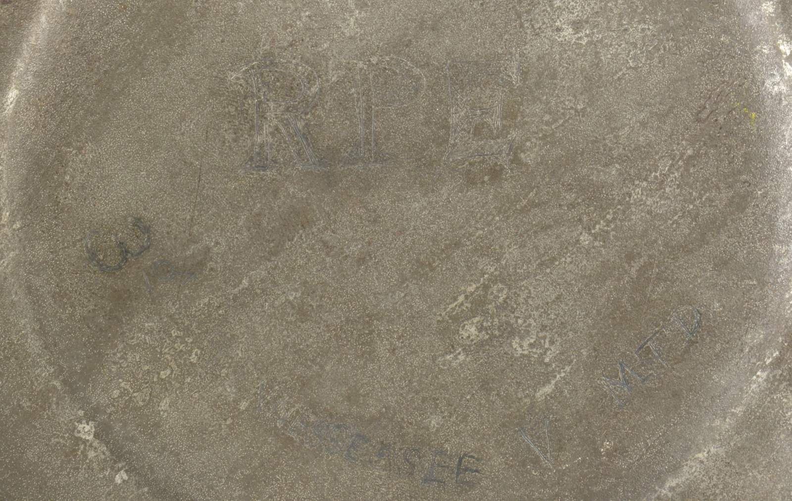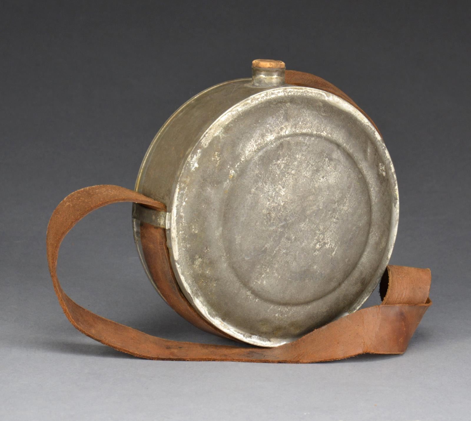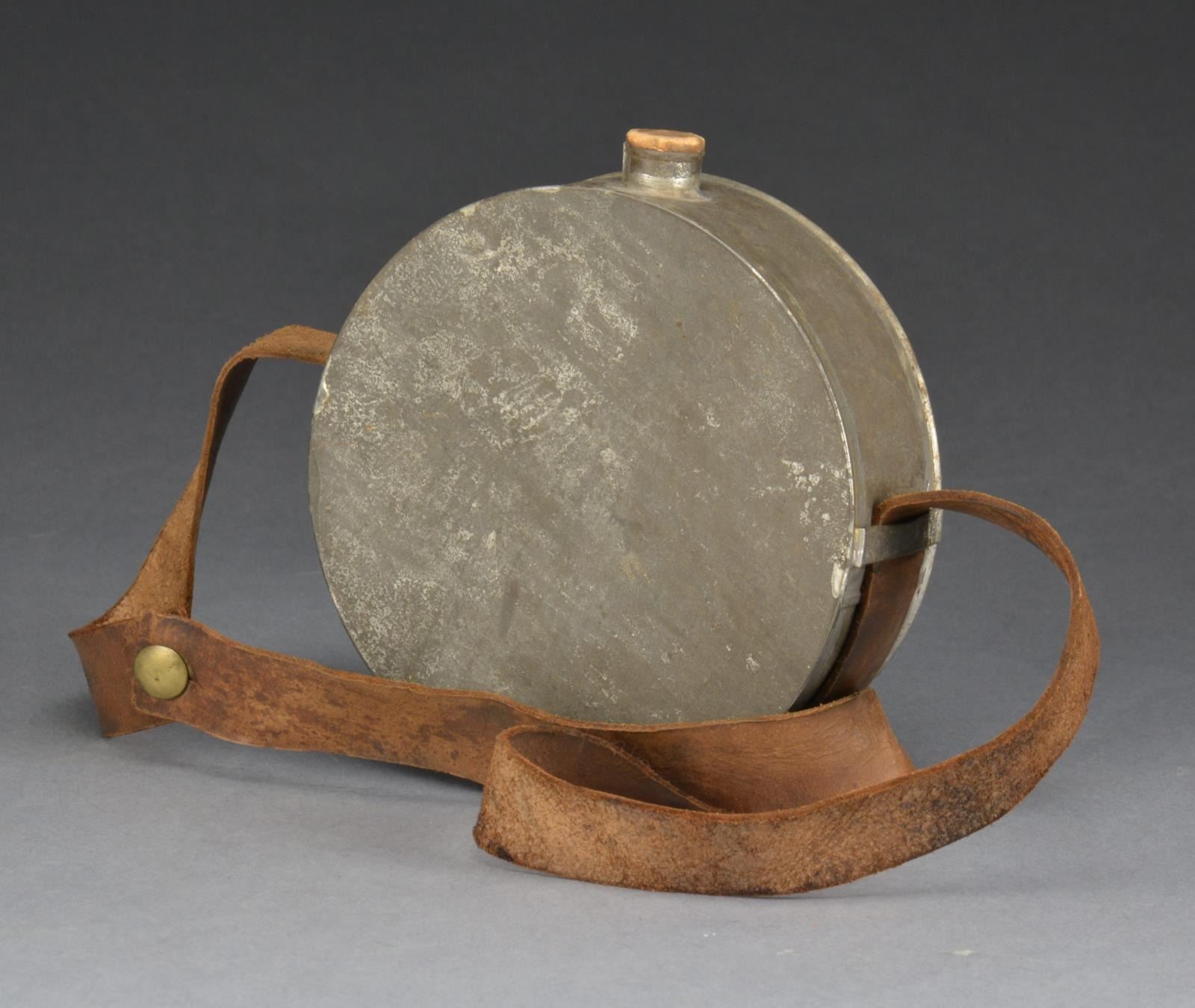 CANTEEN AND SLING. This fine regulation Confederate tin drum canteen belonged to Private Rederick Pierce Ennis of Company E of the 3rd Tennessee Cavalry. The canteen is hand engraved in a folky manner on the front, “R P E” over “3d TENNESSEE V MTD”. The canteen measures 6 3/4" in diameter & 2 3/4" deep and amazingly retains its original brown leather sling w/ brass button stud. Private R.P. Ennis was a member of the famous 3rd Tennessee Cavalry serving in Company E. They fought in many major battles as well as minor skirmishes under the command of General Nathan Bedford Forrest. Private Ennis also served for a time in Company A of the 24th Alabama Infantry. UNATTACHED ACCESSORIES: papers relating to the service of Pvt. Ennis along w/ the 3rd Tennessee Cavalry & the 24th Alabama Infantry. CONDITION: canteen has an overall gray patina. There are numerous sm. dents & dings particularly on the front face of the canteen. The engraving is a bit light but can be easily read w/ a strong raking light. Canteen appears to have the original cork. Leather carrying strap is dry but remains quite solid. PROVENANCE: From the Renowned Collection of Allen & Robin Wandling. (02-13999/BF). $1,500-2,500.
