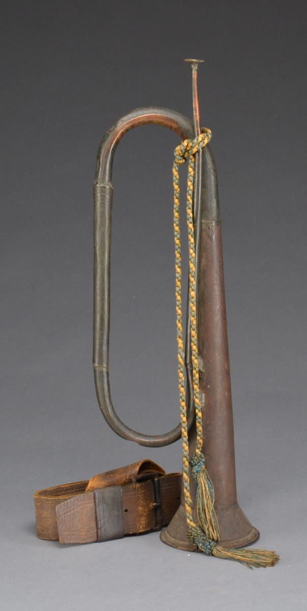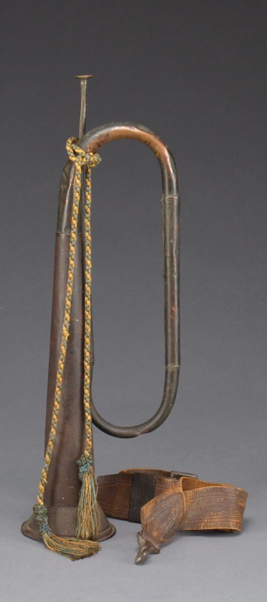 Originally from the Steve Mullinax collection. Wonderful locally made infantry horn or bugle that closely assimilates its regulation US cousin. Rarely are bugles seen w/ any Confederate association. This horn was in Steve Mullinax’s collection & sold from his estate. It originally came from an estate sale in Charlottesville, Virginia in 1987. I remember this horn hanging in Steve’s relic room surrounded by Confederate canteens w/ the same silk cord & tassels that was on it then. Horn measures 23" overall w/ a 4 1/2" bell. The loops & mouthpiece are made from soldered lapped over copper, the bell & last extension are made from soldered tin. Accompanying horn is another musical accessory being a over the shoulder belt w/ hook for snare drum, the drum is long gone but this rare Confederate leather accessory remained in Steve’s estate. CONDITION: good to very good overall, horn still plays well w/ scattered dents, dings & some newer solder joints between bell & loop. Copper has a deep olive/chocolate patina. Bell has iron patina. The leather drum sling is very good retaining all original stitching, iron snap hook is missing spring, roller buckle still has some japanned finish. (02-13843/JS). $2,000-3,000.