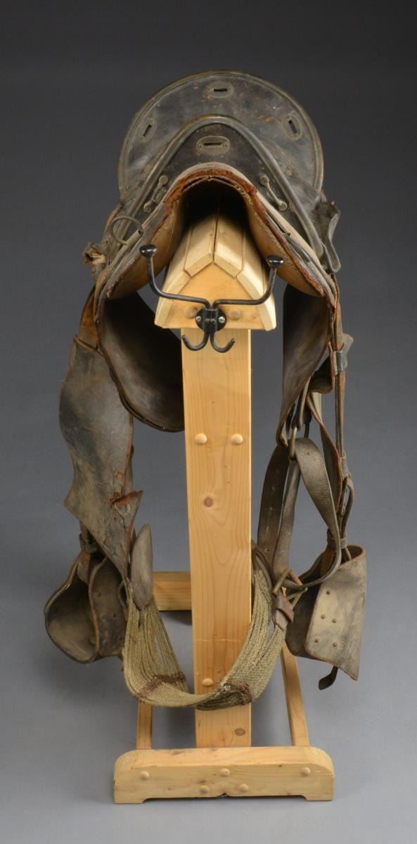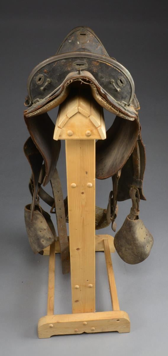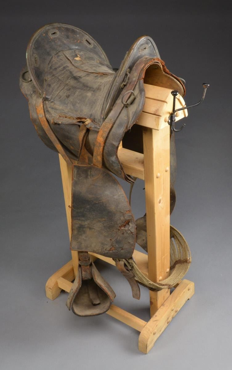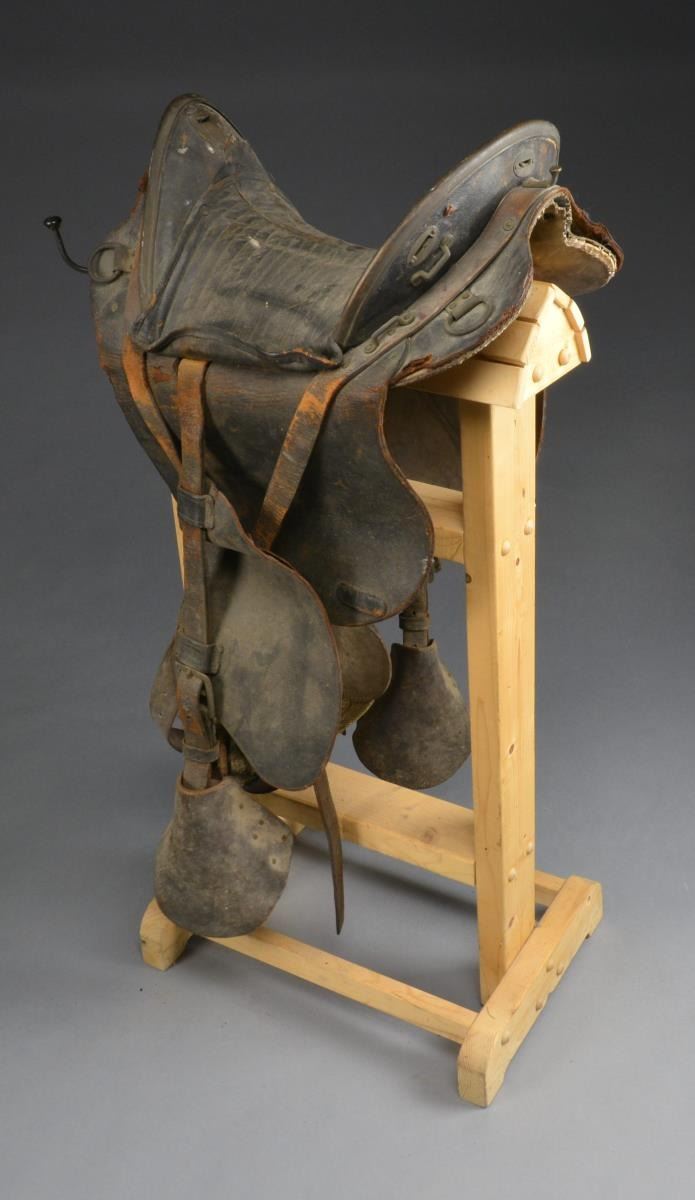 This classic brass trimmed high cantle saddle was invented by Thornton Grimsley in St. Louis about the time of the Mexican War. They were found to be quite comfortable by many notable officers who used them. There is an identified Grimsley saddle captured that belonged to Robert E. Lee. Saddle w/ all brass furniture measures 16” from pommel to cantle, padded quilted seat, still retains fenders, stirrups, & cinch. Saddle is “as found” & could use a good cleaning. CONDITION: fair, saddle is overall complete; leather dry, cracks, surface cracking & soiled. Brass furniture has dark uncleaned patina. (02-14177/JS). $1,000-2,000.