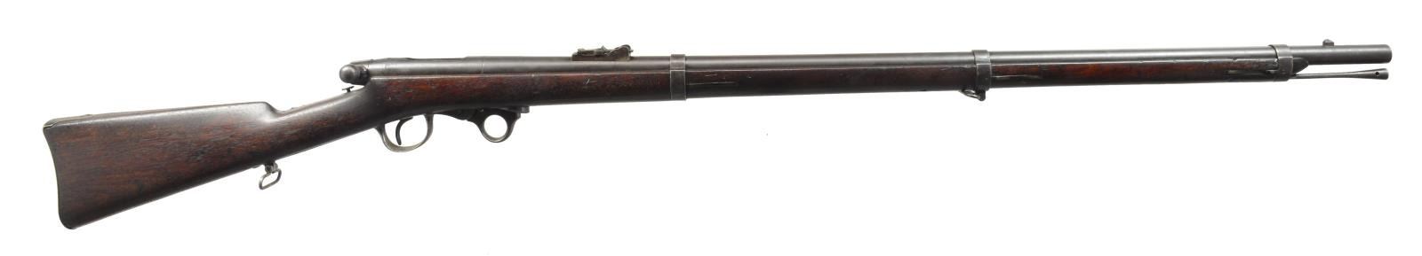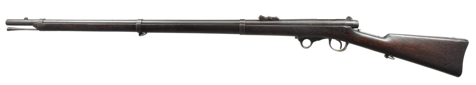 Cal. 53. NSN. Mfg. by AH Waters of Milbury, Mass. 1859-early 1860's, total of 1,500 mfg. for the US. Bbl. 35" rnd. w/ oval bore. Barleycorn front sight & graduated leaf military rear sight. Unusual underhammer action w/ turn bolt loading. Straight grip walnut stock is held by 3 bands has sling swivels & steel musket buttplate. Trumpet tipped iron ramrod. Wood & metal show no government inspection marks. CONDITION: blued finish is fading to even brown patina. Stock has darkened appearance showing scattered scratches & marks. Bore is generally bright w/ darkness in oval bore polishing marks. (01-18278/DS). ANTIQUE. $1,000-1,500.