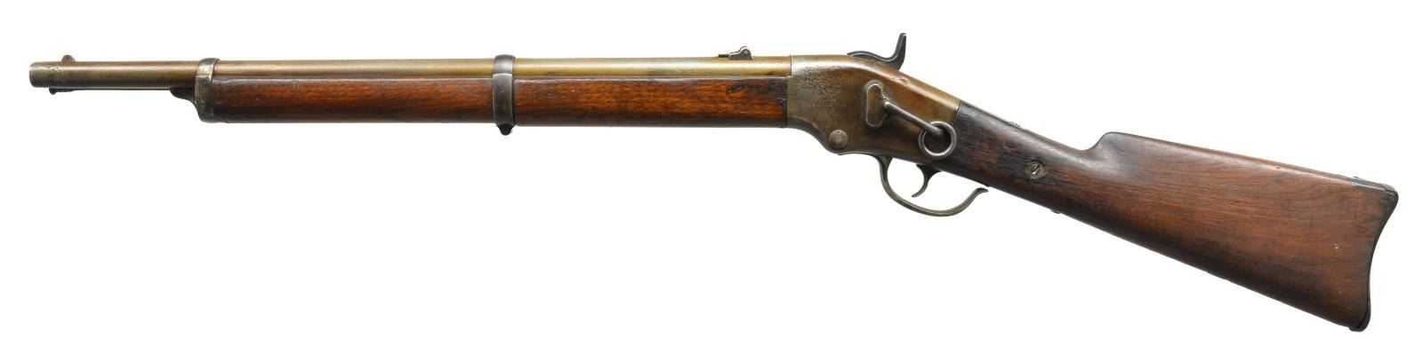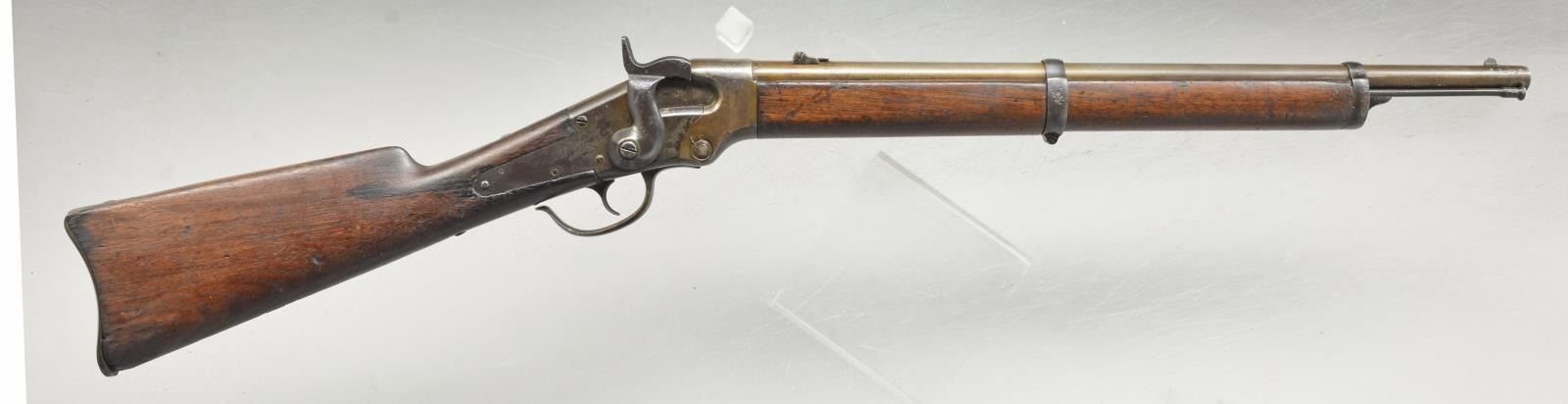 Cal. 50 RF. NSN. Bbl. measures 20 1/2". The Ball repeating carbine is one of the scarcest carbines of the Civil War era. The contract for producing these weapons was signed w/ Lamson & Co. of Windsor, VT in 1864. Delivery of a scant 1,002 carbines was made in May of 1865 thus rendering them too late for service during the Civil War. They likely saw use during the reconstruction period & are generally included in any study or collection of Civil War arms due to their pre-Appomattox contract date. The Ball repeating carbine was a 7 shot repeating, 50 cal. weapon utilizing a self-contained cartridge. It featured a side loading breech mechanism utilizing a lever action trigger guard which when actuated would allow a soldier to insert seven 50 cal. rimfire cartridges into the tubular magazine. The bbl. has a front sight & a sm. folding rear sight. The left side of the receiver is marked, “E.G. LAMSON & CO WINDSOR, VT. U.S. BALL’S PATENT JUNE 23, 1863 MAR 15, 1864”. The hammer & loading port are on the right side of the receiver. Iron trigger guard/lever, buttplate, bbl. bands & ramrod. Matching original wooden stock & forend. CONDITION: bbl. has a well faded plum brown finish. Receiver & other metal parts have areas of original finish, particularly in protected areas. There is notable pitting opposite the loading port. The stock shows expected dents/dings & has a sm. loss at the toe. Very good bore w/ strong rifling. (01-18777/BF). ANTIQUE. $2,000-3,000.
