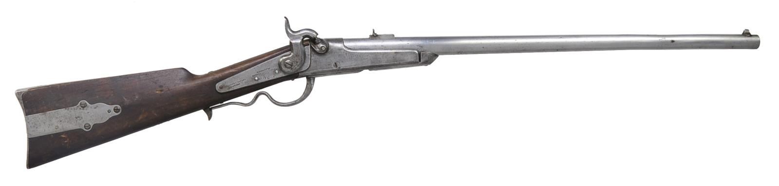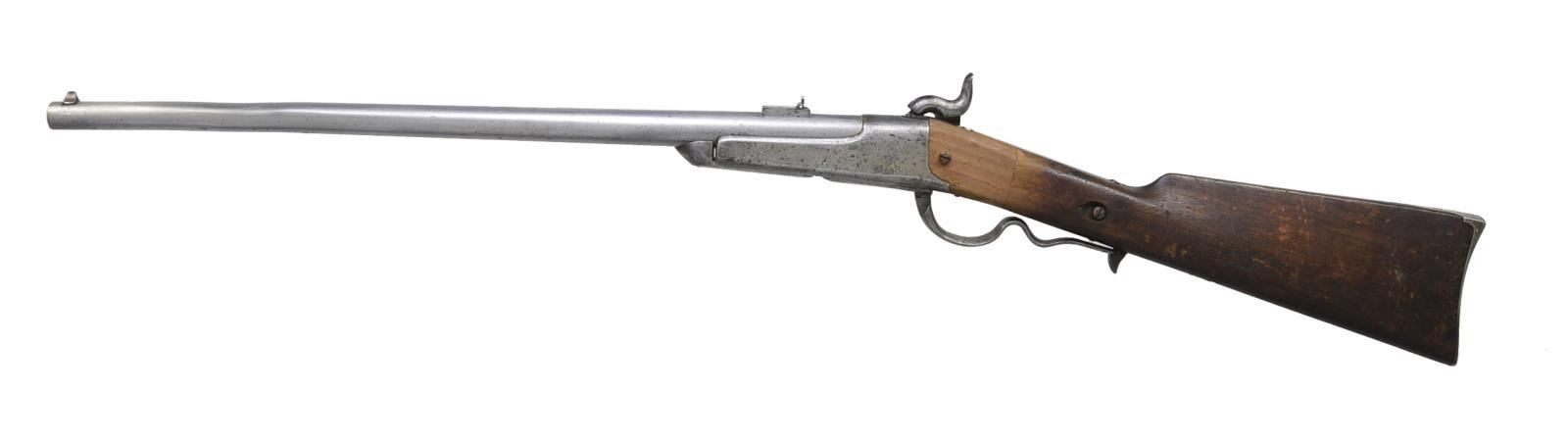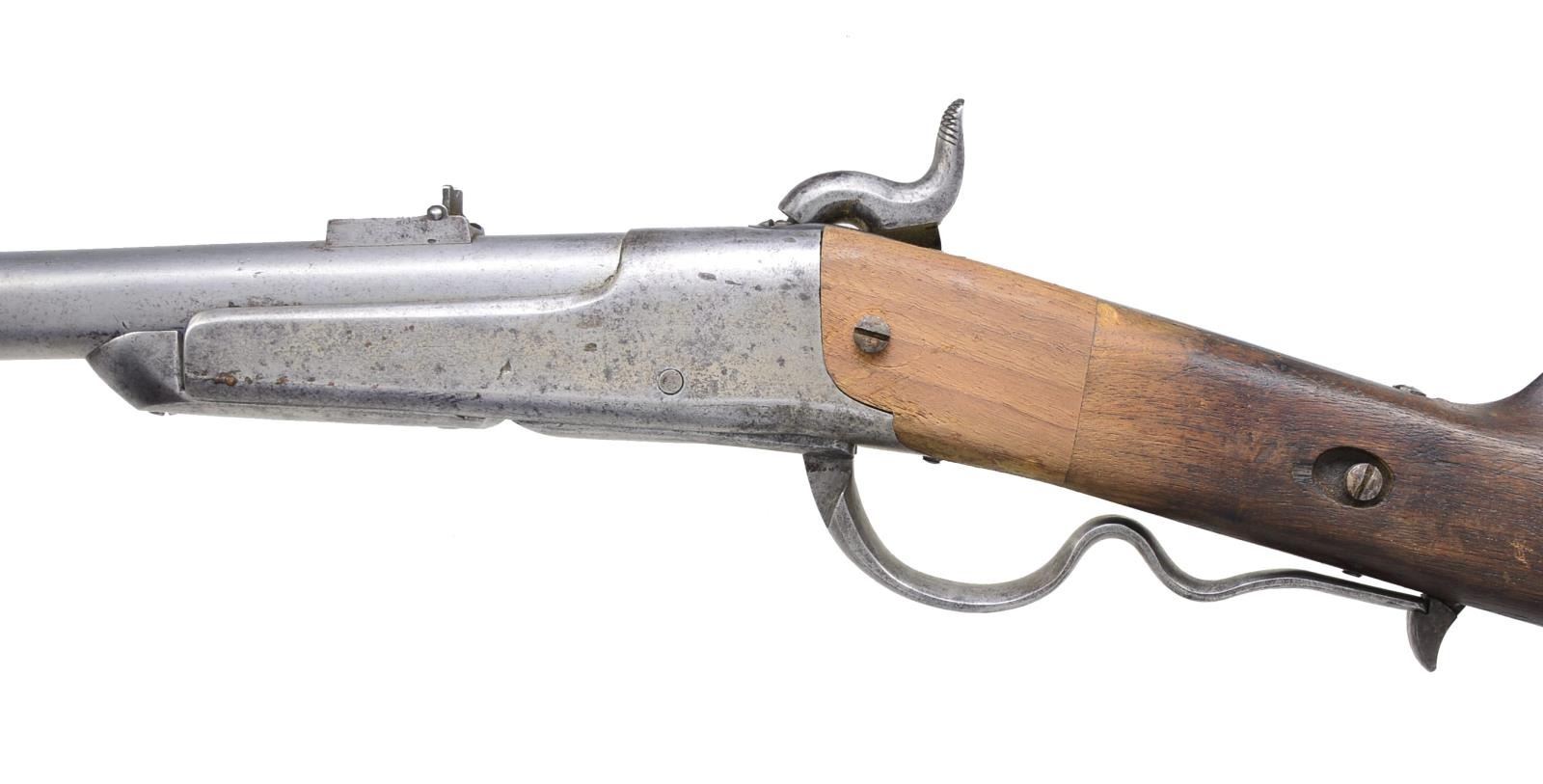 PERCUSSION CARBINE. Cal. 50. S# 11520. Bbl. 22 1/4" rnd. w/ blade front sight & single leaf rear sight. Lever operated action, bbl. slides forward on frame & tips downward for loading. Walnut stock w/ iron patchbox & carbine buttplate. CONDITION: gray metal is partially polished showing evidence of vigorous cleaning & remaining pitting. Right side of stock behind action has 2 1/2" added wood repair. Balance of wood has dark worn appearance showing dents & handling marks. Top tang is a replacement. Pitted bore w/ partially intact rifling having a severe dent 4 1/2" - 6 1/4" from muzzle. (01-18365/DS). ANTIQUE. $500-800.