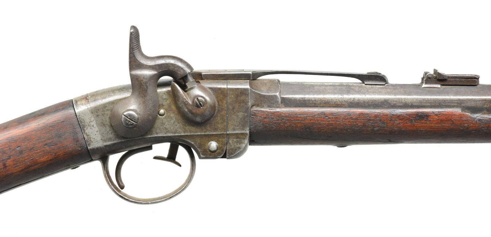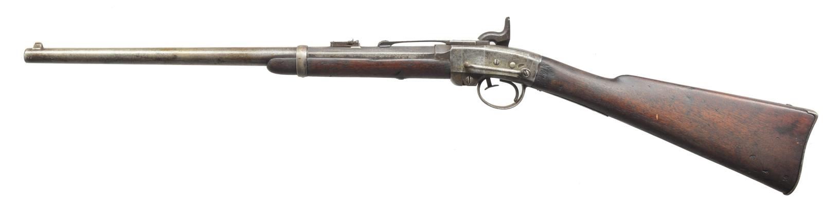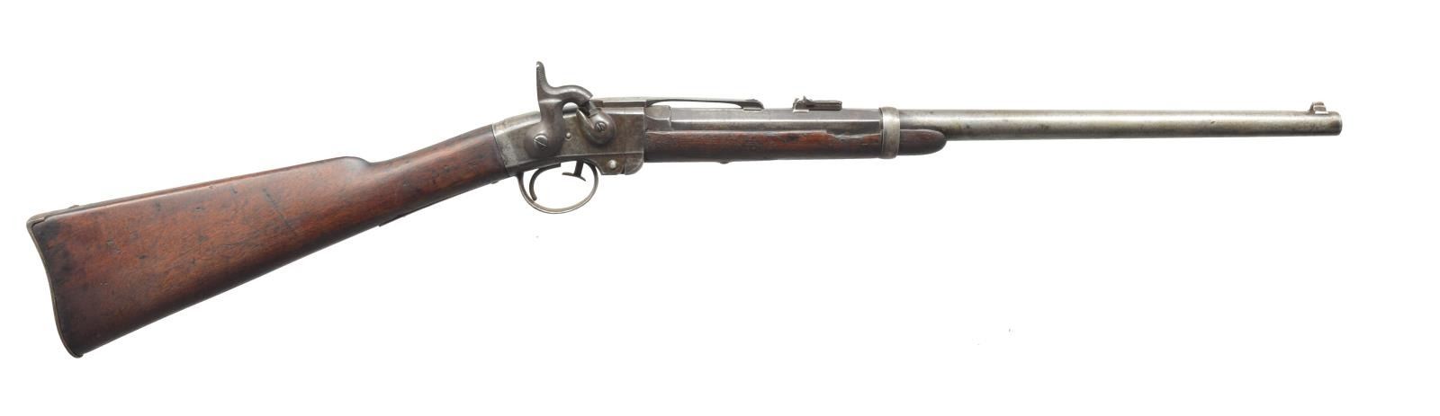 SRC. Cal. 50. S# 15090. Bbl. 21 5/8" rnd. w/ oct. shank. Blade front sight w/ graduated leaf rear sight. Action is activated by a brass push rod that allows bbl. to pivot downward for loading. Left side of action has saddle ring bar. Band fastened walnut forearm & straight grip stock w/ steel carbine buttplate. CONDITION: metal is fading to a mottled gray brown. Heavily sanded wood has dark worn appearance w/ dents, chips & handling marks. Bbl. is loose at hinge. Bore retains intact rifling showing spots of pitting. Action has weak spring tension. (01-18201/DS). ANTIQUE. $700-1,000.