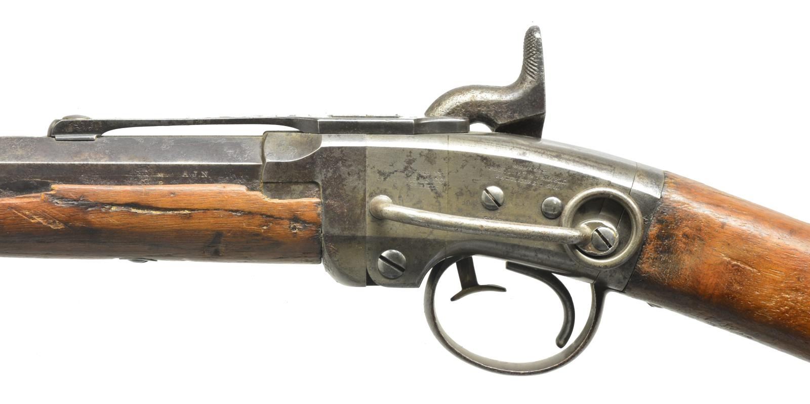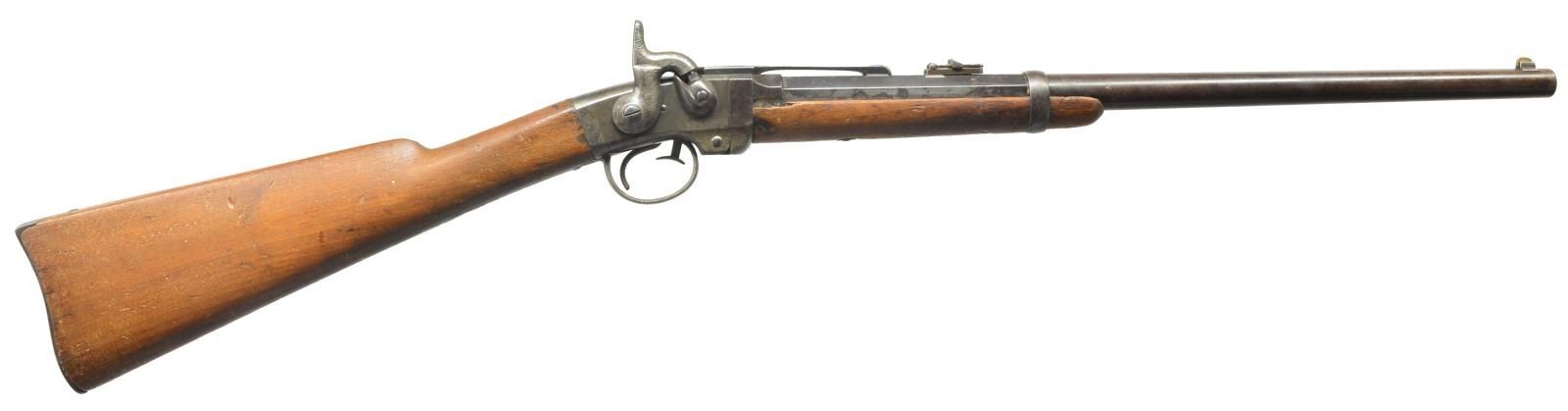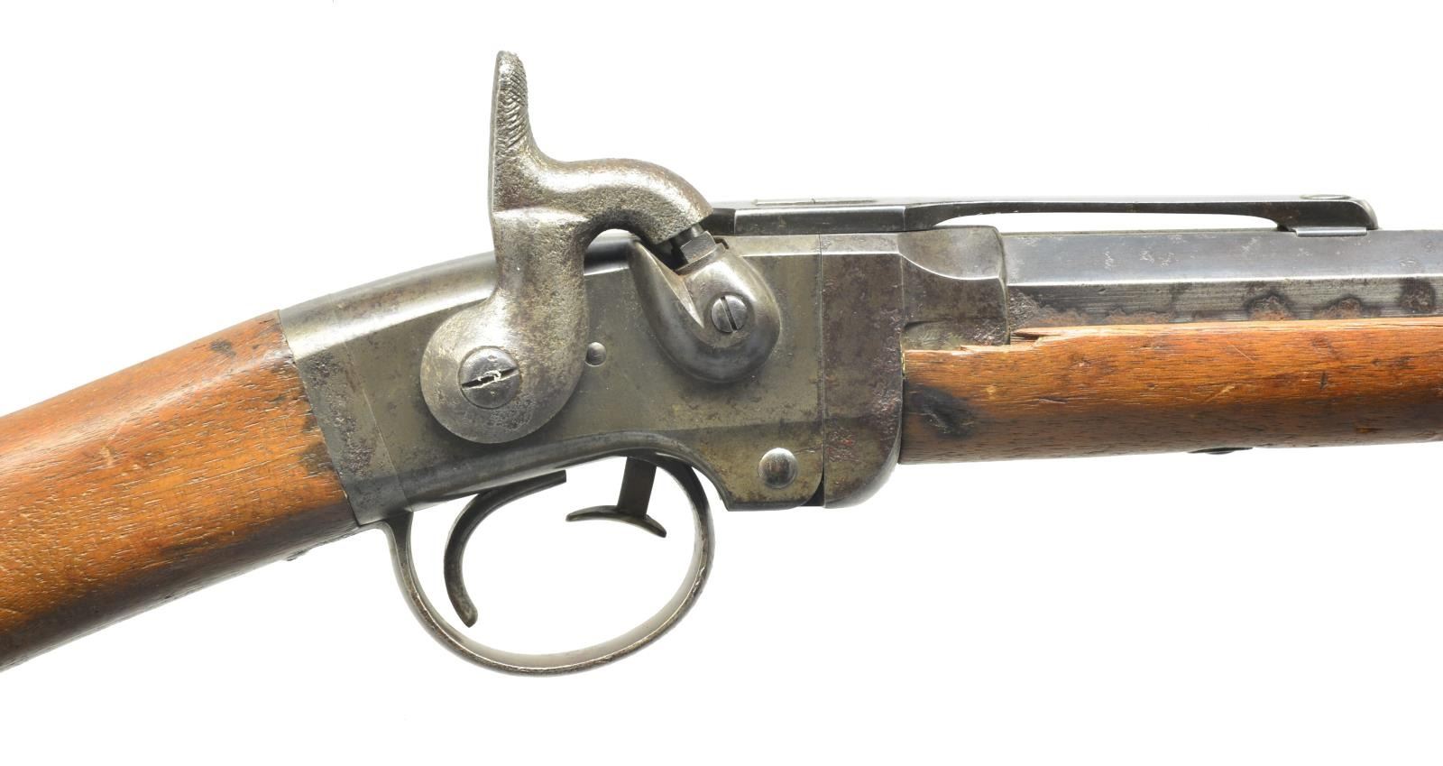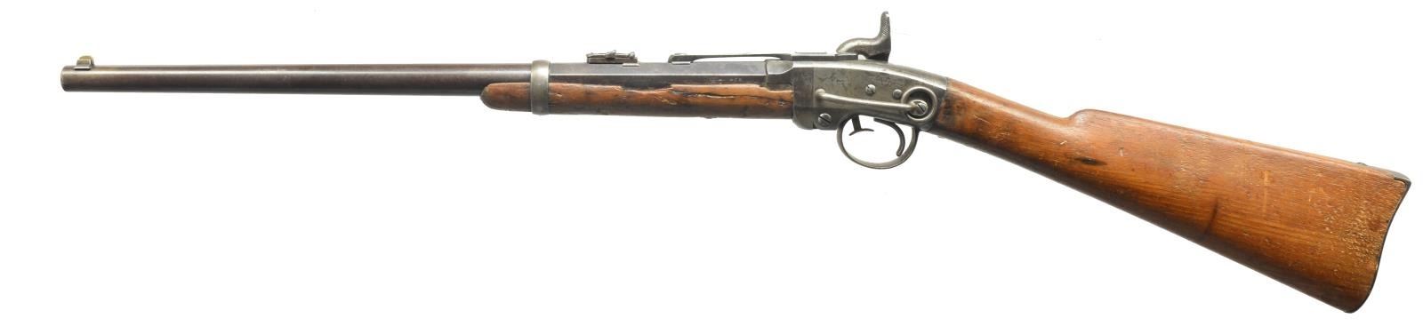 SRC. Cal. 50. S# 21087. Bbl. 21 5/8" rnd. w/ oct. shank. Blade front sight w/ graduated leaf rear sight. Action is activated by a brass push rod that allows bbl. to pivot downward for loading. Left side of action has saddle ring & bar. Band fastened walnut forearm & straight grip stock w/ steel carbine buttplate. CONDITION: bbl. & action retain sm. amounts of blue & case color finish fading to brown showing scattered pitting & corrosion. Forearm is broken & chipped along both sides of bbl. channel. Stock shows wear & handling marks w/ cracks extending from action. Lower tang screw is missing. Bore retains intact rifling w/ scattered pitting. (01-18274/DS). ANTIQUE. $700-1,000.