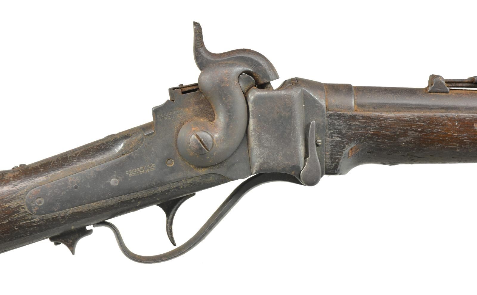 Cal. 52. S# 67936. Bbl. 22" w/ blade front sight & Lawrence patent rear sight. Action has Maynard primer feed on left w/ saddle ring & bar on left side. Band fastened walnut forearm & straight grip stock w/ steel carbine buttplate & steel patch box on right side. CONDITION: metal has dark crusty appearance w/ general pitting & surface corrosion. Stock & forearm have added finish over dark worn appearance w/ dents & handling marks. Stock has sm. cracks behind lock plate & around buttplate. Dark pitted bore. (01-18238/DS). ANTIQUE. $700-1,000.