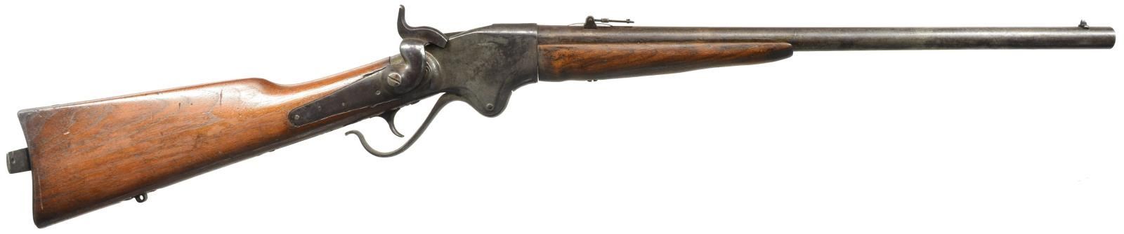 Cal. 52 RF (56-56). S# 8319. Bbl. shortened to 22 1/2" w/ blade front sight & graduated leaf rear sight. Lever action repeater w/ tubular mag. that loads through butt. Replacement walnut sporter forearm. Original walnut stock w/ steel buttplate having swivel loop in toeline. CONDITION: metal has faded to mottled gray brown showing pitting, corrosion & dents. Forearm has rough brown appearance. Stock has lightly worn finish showing dents & handling marks w/ chips around lock plate. Mag. tube is missing spring & follower. Action sticks in closed position. Lightly pitted bore. (01-18358/DS). ANTIQUE. $600-900.