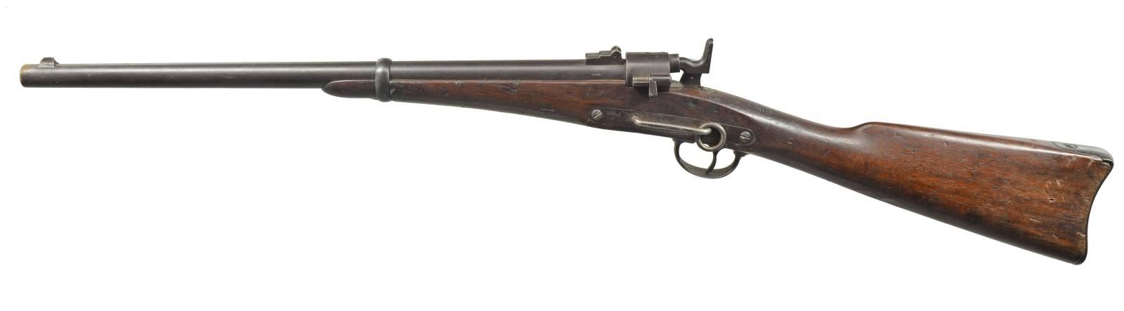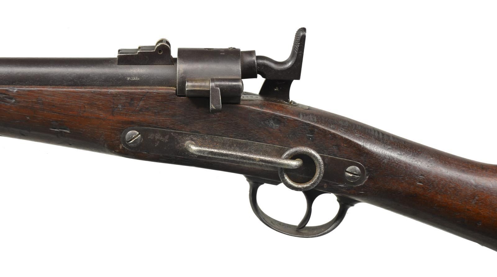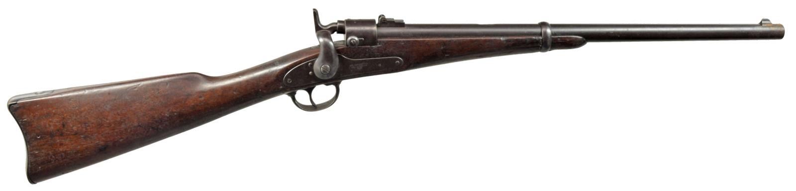 Cal. 52 RF. S# 11493. Bbl. 22" w/ blade front sight & 2 leaf rear sight. Action hood rotates to left for loading. Island mounted lock plate marked "JOSLYN FIRE ARMS Co / STONINGTON, CONN / 1864". Band fastened straight grip walnut stock w/ iron carbine buttplate. CONDITION: metal finish has faded to an even brown patina showing some very light pitting. Stock has dark aged appearance showing scattered dents & marks. Bore retains largely intact rifling showing pitting. (01-18199/DS). ANTIQUE. $1,000-1,500.
