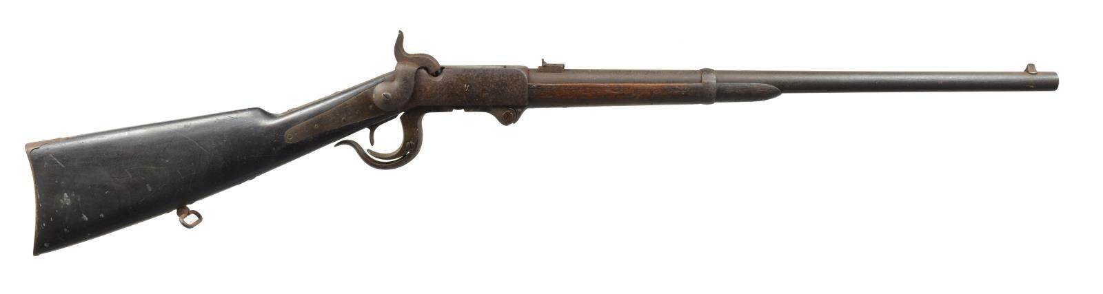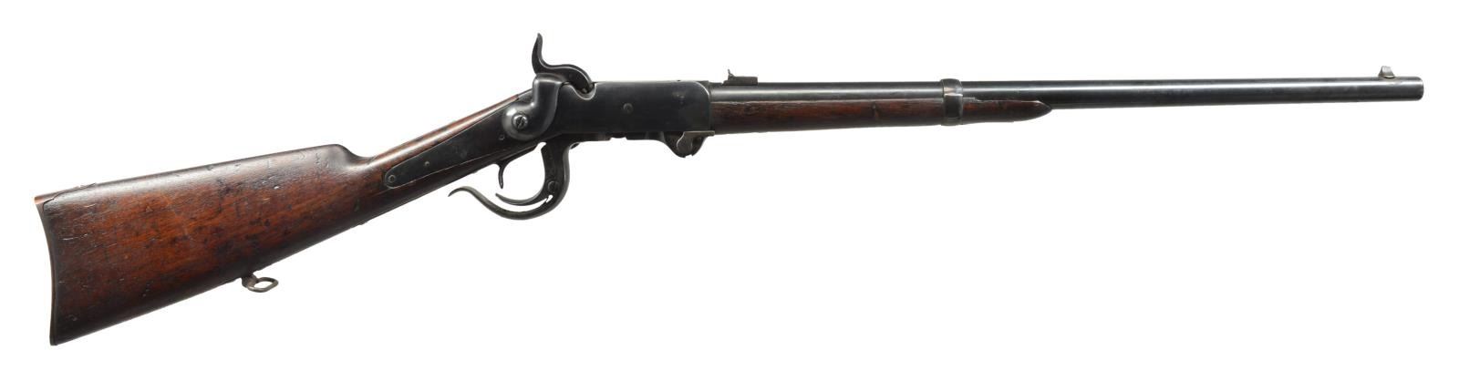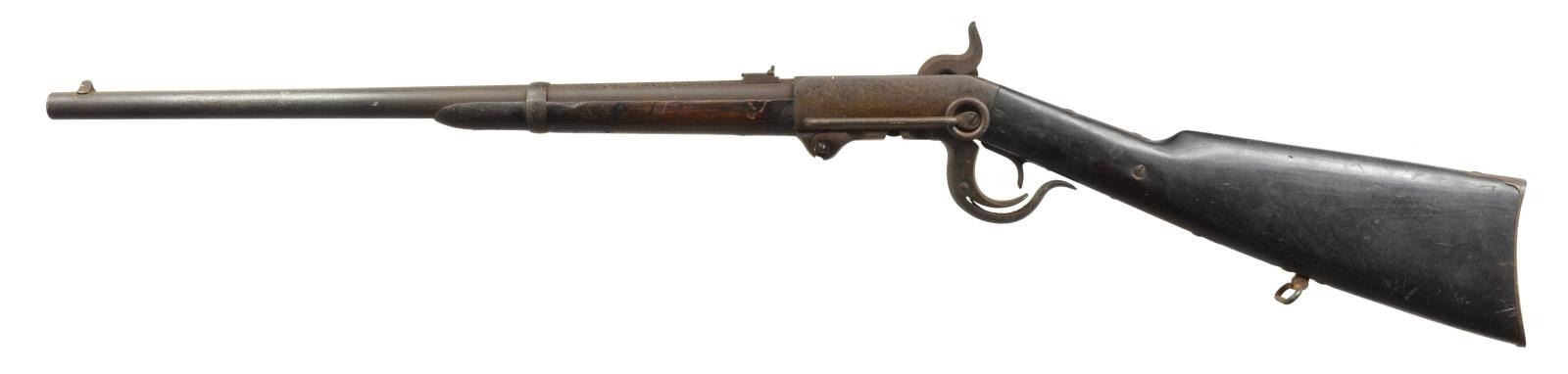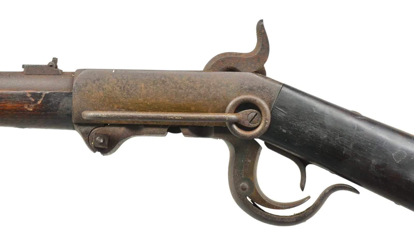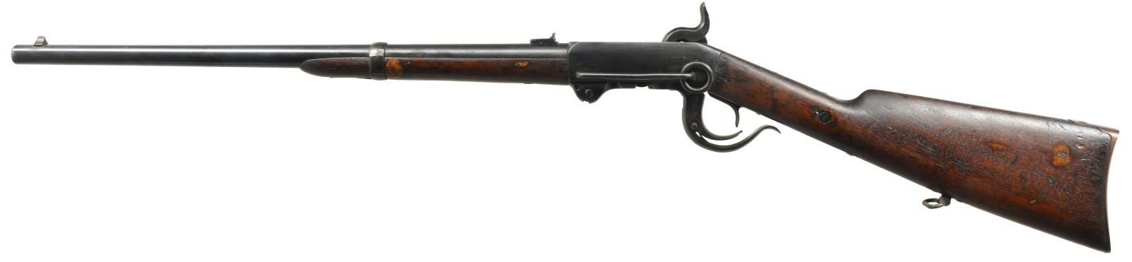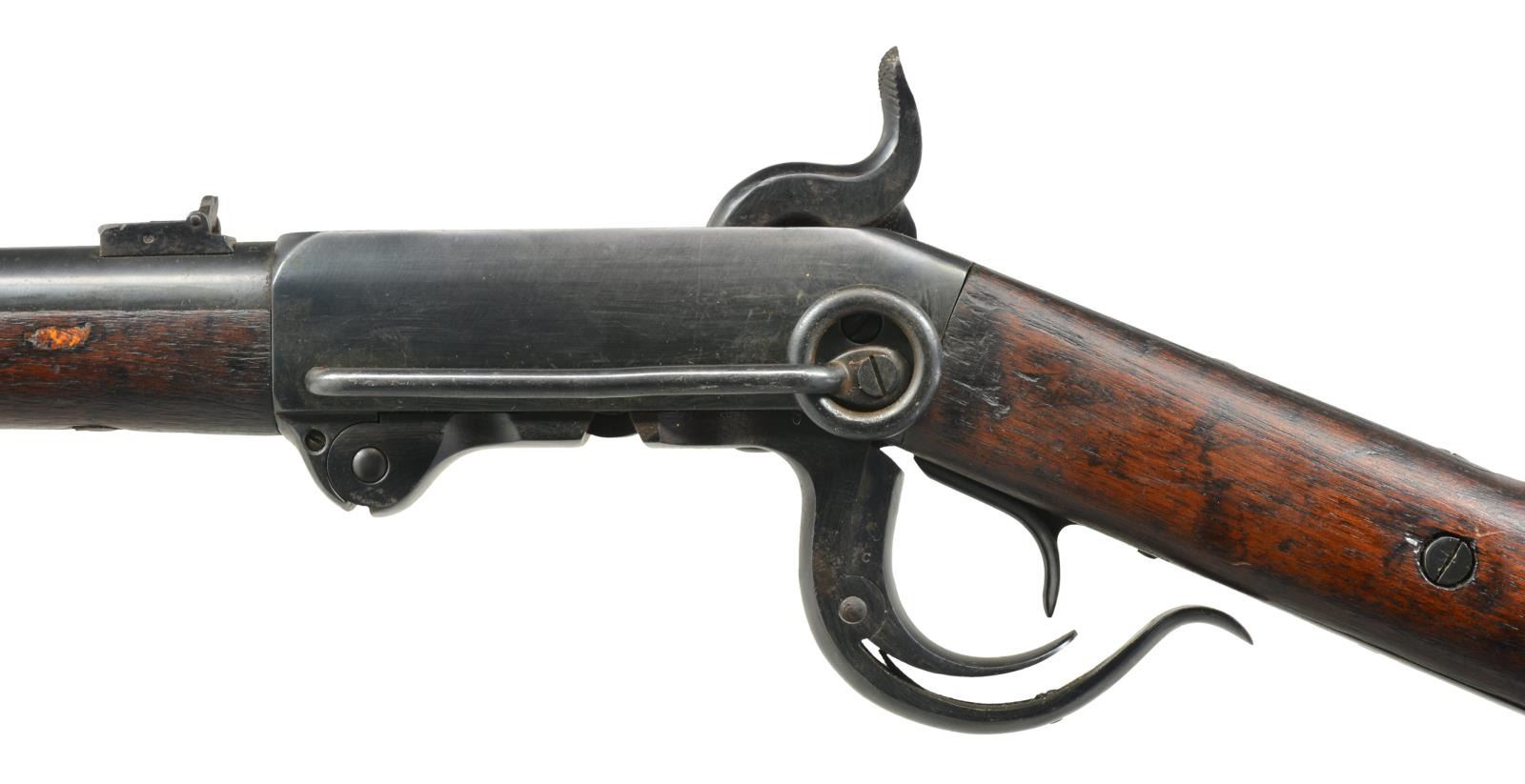 SRCS. ALL: cal. 54. Bbls. 21" rnd. Blade front sights w/ folding leaf rear sights. Actions are hinged at center of breech blocks w/ guide screws at right side of frames. Left sides have saddle ring & bar. Band fastened forearms & straight grip walnut stocks w/ sling swivels & steel carbine buttplates. 1) S# 11483. CONDITION: metal has dark patina w/ general rust & pitting. Wood has dark aged appearance w/ dents & marks. Action hinge screw is replaced w/ bolt. Dark pitted bore. (01-18240/DS). 2) S# 18683. CONDITION: metal is polished & reblued. Refinished wood w/ spots of plastic wood filler having sm. chips around action & buttplate. Pitted bore. (01-18380/DS). ALL ANTIQUE. $900-1,350.