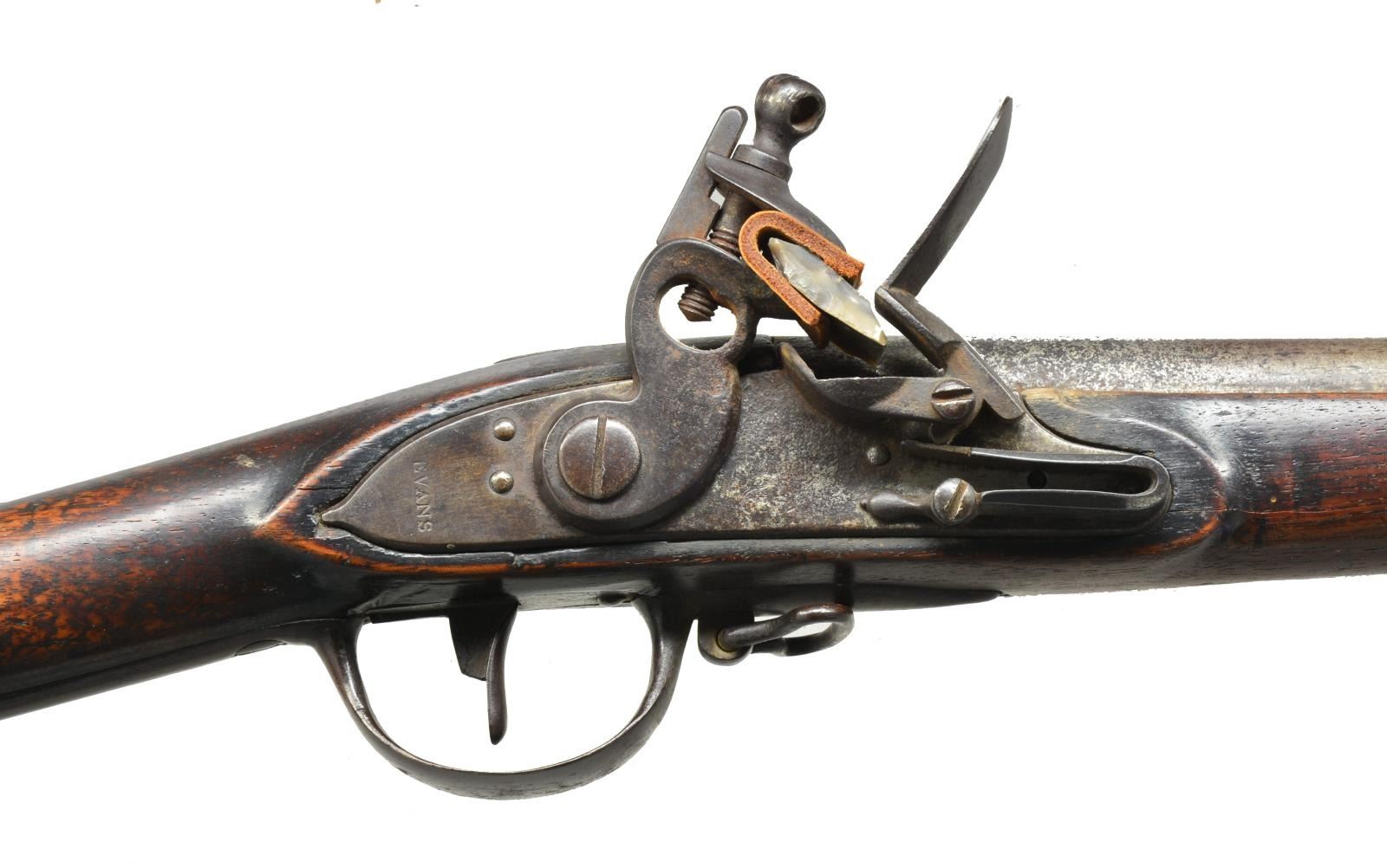 Cal. 69. NSN. 44 1/2" Bbl. Oval “Eagle CT” proof at rear. Slightly beveled flat plate lock w/ teat at rear is marked “EVANS” vertically & w/ eagle & U.S. (?) in front of reinforced cock. Frizzen spring has bulbous finial w/ teat. American walnut stock of Harper’s Ferry pattern w/ dished comb is held by 3 bands retained by long springs. Inspector’s mark “MTW” between 2 “V”s is on left side behind sideplate. Bottom of stock behind trigger guard tang is stamped “KCE”(?). Musket is complete w/ sling loops, ramrod, & what appears to be its original bayonet. 16" Triangular blade has star proof at rear. Evans had a contract for 1,000 muskets. No record exists of deliveries. UNATTACHED ACCESSORIES: 16" bayonet. CONDITION: good. Metal parts w/ considerable cleaning over remaining overall light pitting. There are some scratches on left side of stock & a long sliver of wood separation left side of bbl. channel behind front band. Stock furniture remains mostly brown. Eagle U.S. mark is nearly obliterated at center of lock. Stock retains most of what appears to be its original finish w/ fine hand worn patina at normal points of wear. Mechanically good. Bayonet condition commensurate w/ musket. (01-18706/MGM). ANTIQUE. $1,500-2,000.