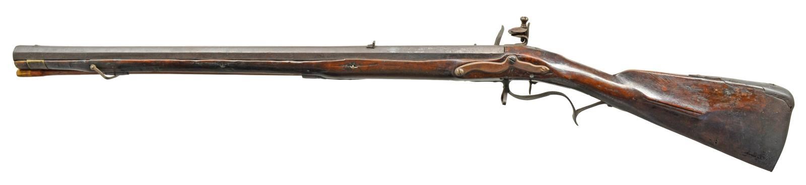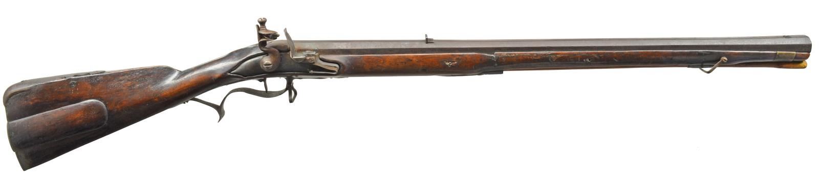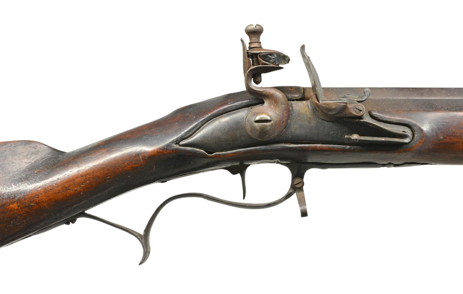 Cal. 70. NSN. 43 1/4" Overall. Bbl. 27 3/4" oct. swamped w/ dovetailed front & rear sights, iron mounted, the fan shaped finials on buttplate & trigger guard are reminiscent of some excavated from pre-revolution Indian sites. Stock is very plainly made w/ no decoration other than an incised line in the short cheekpiece. This rifle has undergone substantial restoration to the wood & is a reconversion from percussion, regardless a very rare American stocked mid 18th century Jaeger military rifle. CONDITION: good as restored, lock components are replaced as is sideplate & lock screws, sling swivels are replaced, both iron half hexagonal ramrod pipes appear original though there is wood restoration above & forward of front pipe which is mostly new as is brass band. Mechanics of new mechanism are excellent. The bore has discernible rifling although heavily worn from use. PROVENANCE: From the Collection of John "Tim" Breth Jr. (01-17795/JS). ANTIQUE. $1,200-1,500.