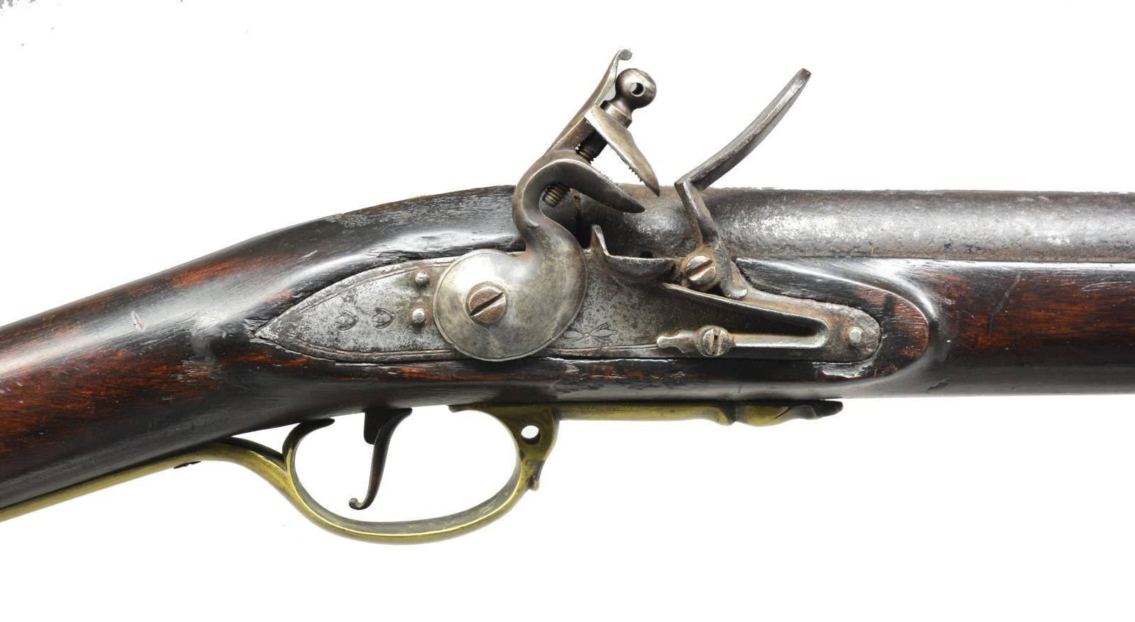 Cal. 78. NSN. Bbl. 42". 57 1/2" Overall. Interesting gun appears American restocked, utilizing a mix of commercial & military parts including: bbl., trigger guard, ramrod, pipes appear from short land pattern British musket. British military proofs on top of bbl. as well as military style buttplate. Lock plate appears commercial. Sideplate appears Dutch. CONDITION: good to very good overall; appears original & original flint. Top jaw & top jaw screw appear replaced. Stock is well fit, refinished w/ some well disguised insets in crack repairs. Threaded iron ramrod is reproduction. Bbl. & lock have iron patina w/ pitting especially at breech. Brass cleaned to a light mustard patina. Mechanically functions w/ smooth pitted bore. (01-18431/JS). ANTIQUE. $1,200-1,500.