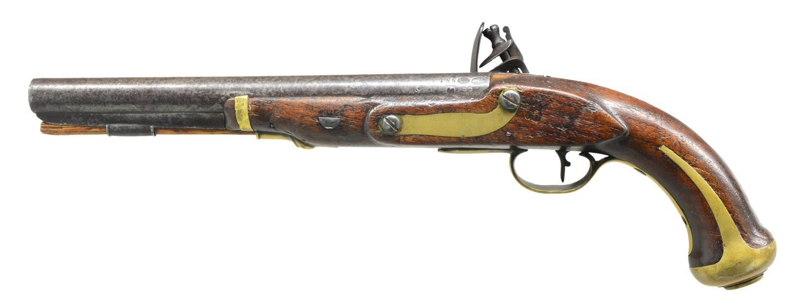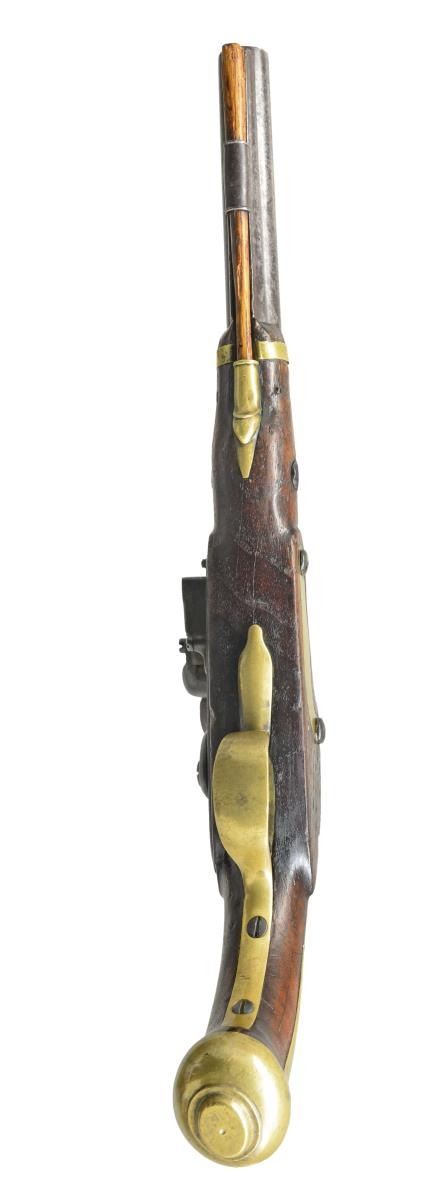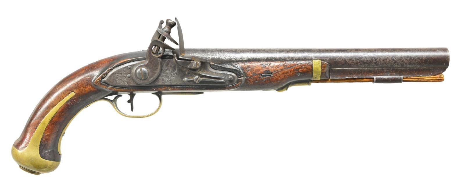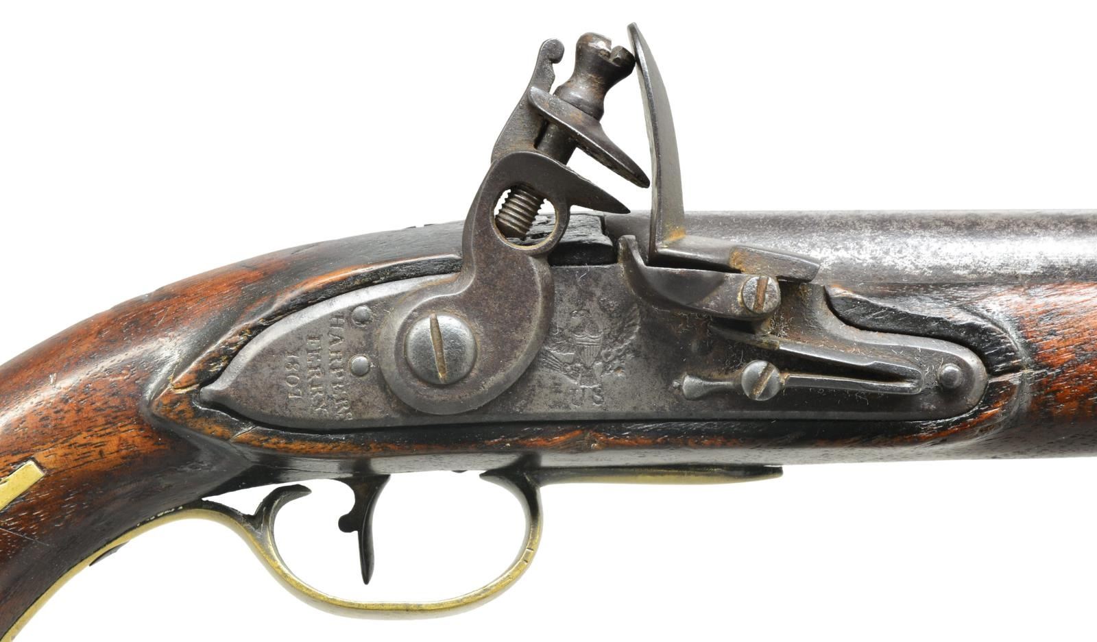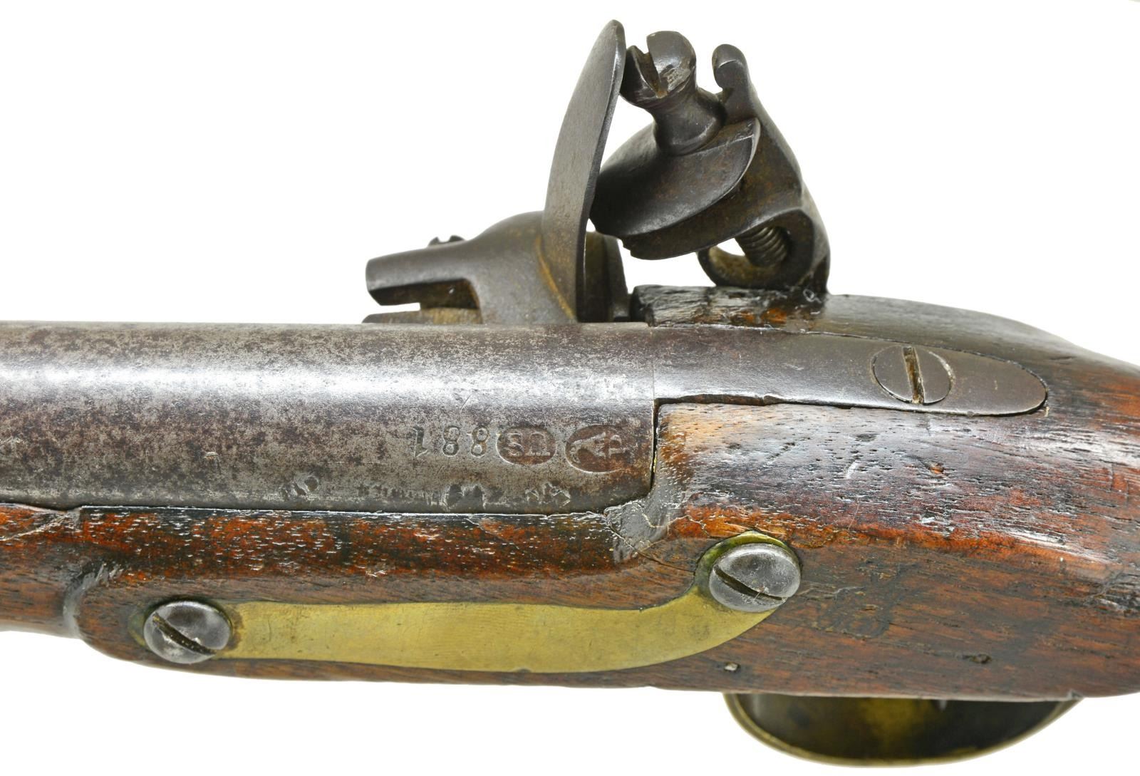 Cal. 54. S# 881. Bbl. measures 10”. The total production of this rare American flintlock pistol was 4,096. Of this number, approximately 2,580 were dated 1807. Bbl. is proofed on the left side w/ eagle head over “P” & “US” in an oval. The serial number “881” is stamped in front of the US proof. The model 1805 pistol was the first military handgun produced by the National Armory. It is believed that the guns were numbered & issued in pairs, therefore of the 4,096 pistols manufactured, the highest serial number would be 2,048 as each pistol in a pair was numbered identically. Pistol is original flint w/ original lock intact. Lock features a spread winged American eagle over “US” in front of the cock and “HARPERS FERRY 1807” to the rear of the cock. Brass trigger guard, buttcap, side plate, nose band & entry thimble. There is an iron ramrod thimble housing a wooden ramrod below the iron rib under the bbl. A cartouche can still be seen on the stock just to the rear of the side plate. A wonderful opportunity to obtain one of the most prized & sought after of American military pistols. CONDITION: iron has a medium to dark gray mottled patina. Brass has been cleaned but has reacquired a light mustard patina. Lock holds both full & half cock & the action is very crisp. Wood is solid w/ a few minor dents & dings as would be expected in a military pistol that is over 200 years old. Bore is good showing minor oxidation. (01-18424/BF). ANTIQUE. $13,000-16,000.