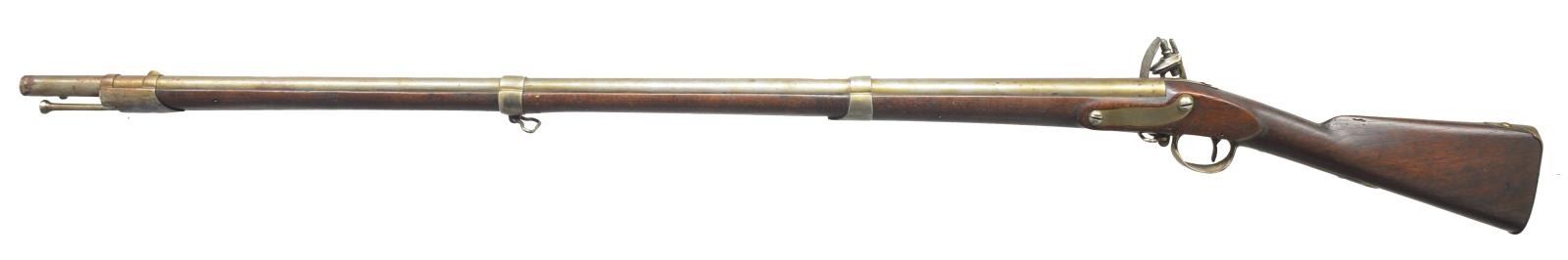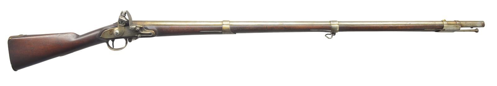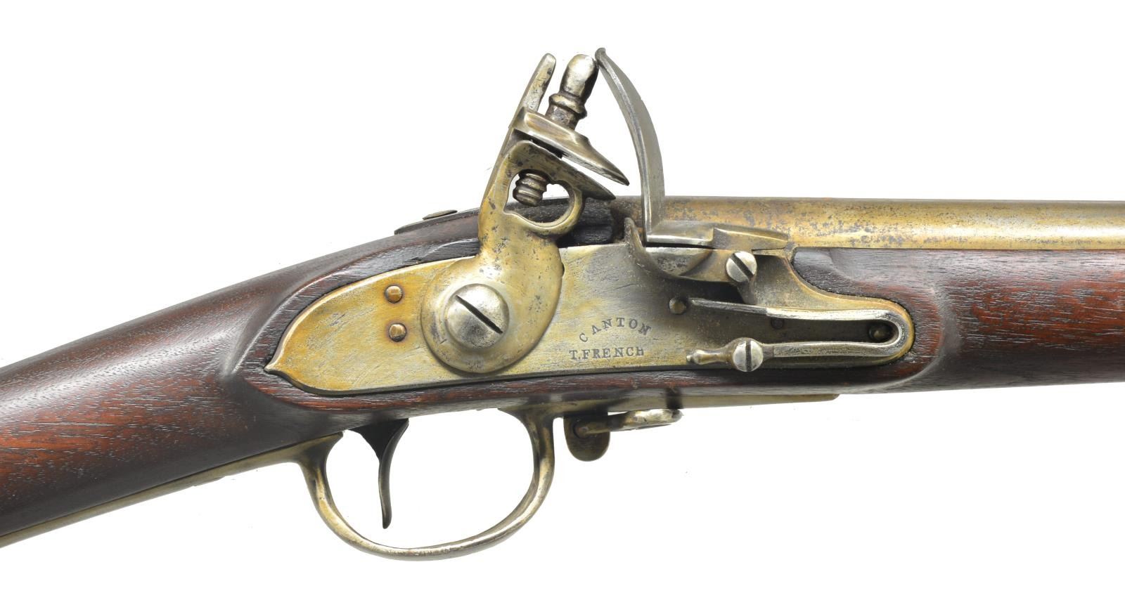 Cal. 69. NSN. Bbl. 44 1/8". Bbl. is proofed on the left side, “P P.G(in cartouche) M 1814”. Markings like this generally indicate issuance by the State of Massachusetts for the War of 1812. Lock is marked in front of the cock, “CANTON (in arc) T. FRENCH”. Iron trigger guard, buttplate, side plate, bbl. bands, nosecap & ramrod. Original stock. CONDITION: iron has been cleaned but has reacquired a pleasing gray patina. Lock markings are clear. Lock holds both full & half cock. Stock is amazingly crisp & relatively free of damage. Good but dirty bore. (01-18000/BF). ANTIQUE. $1,200-1,600.
