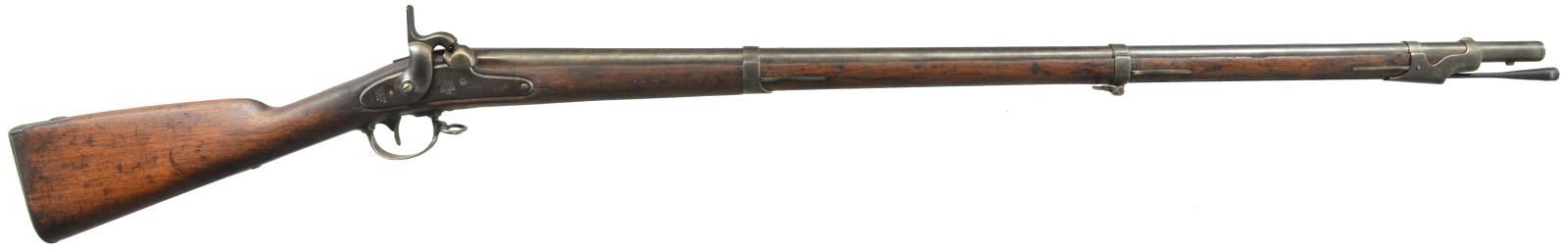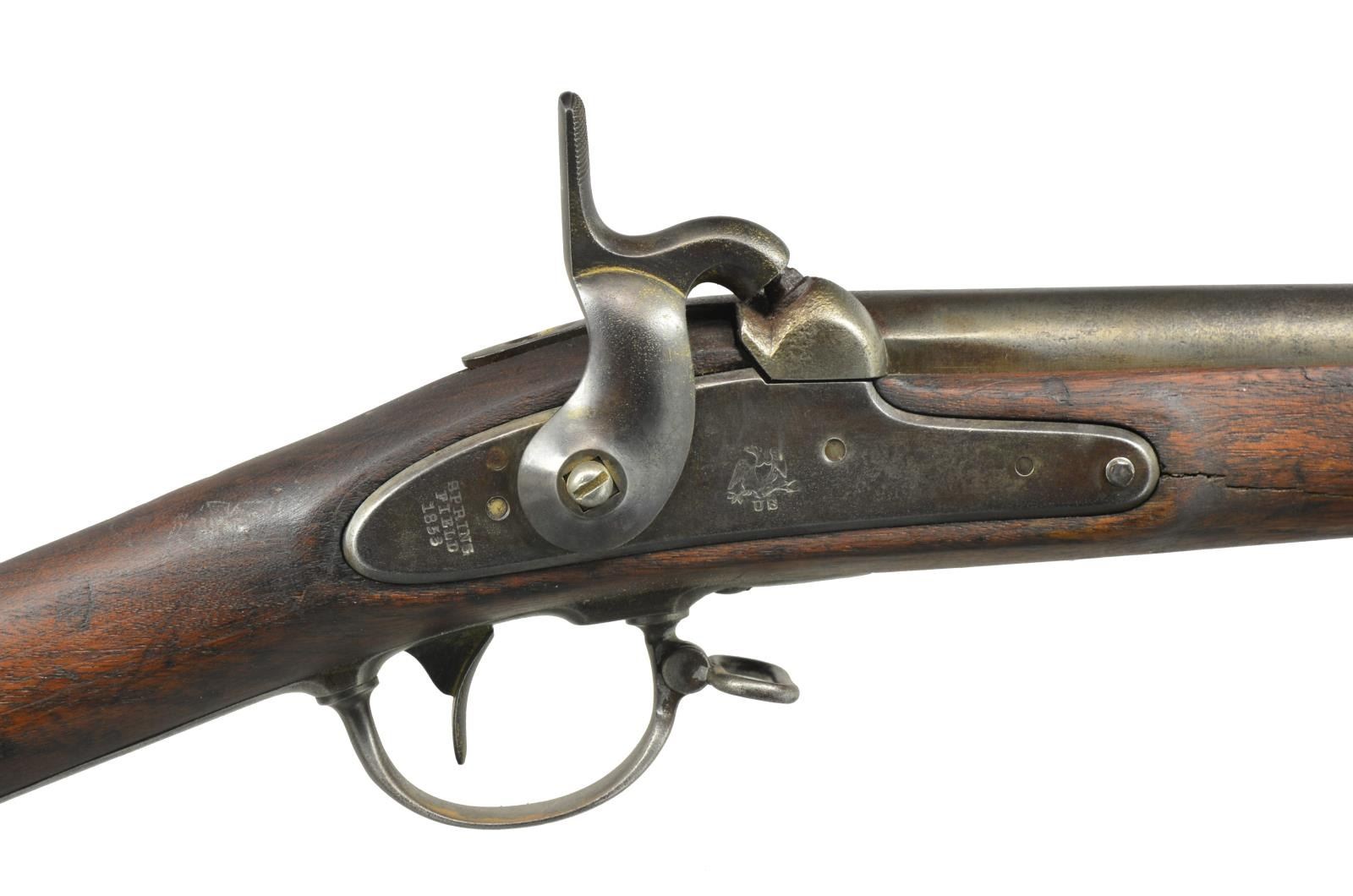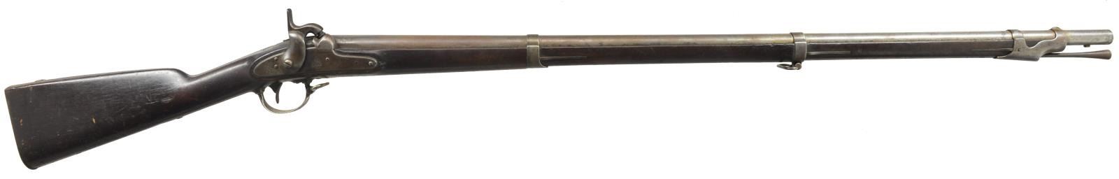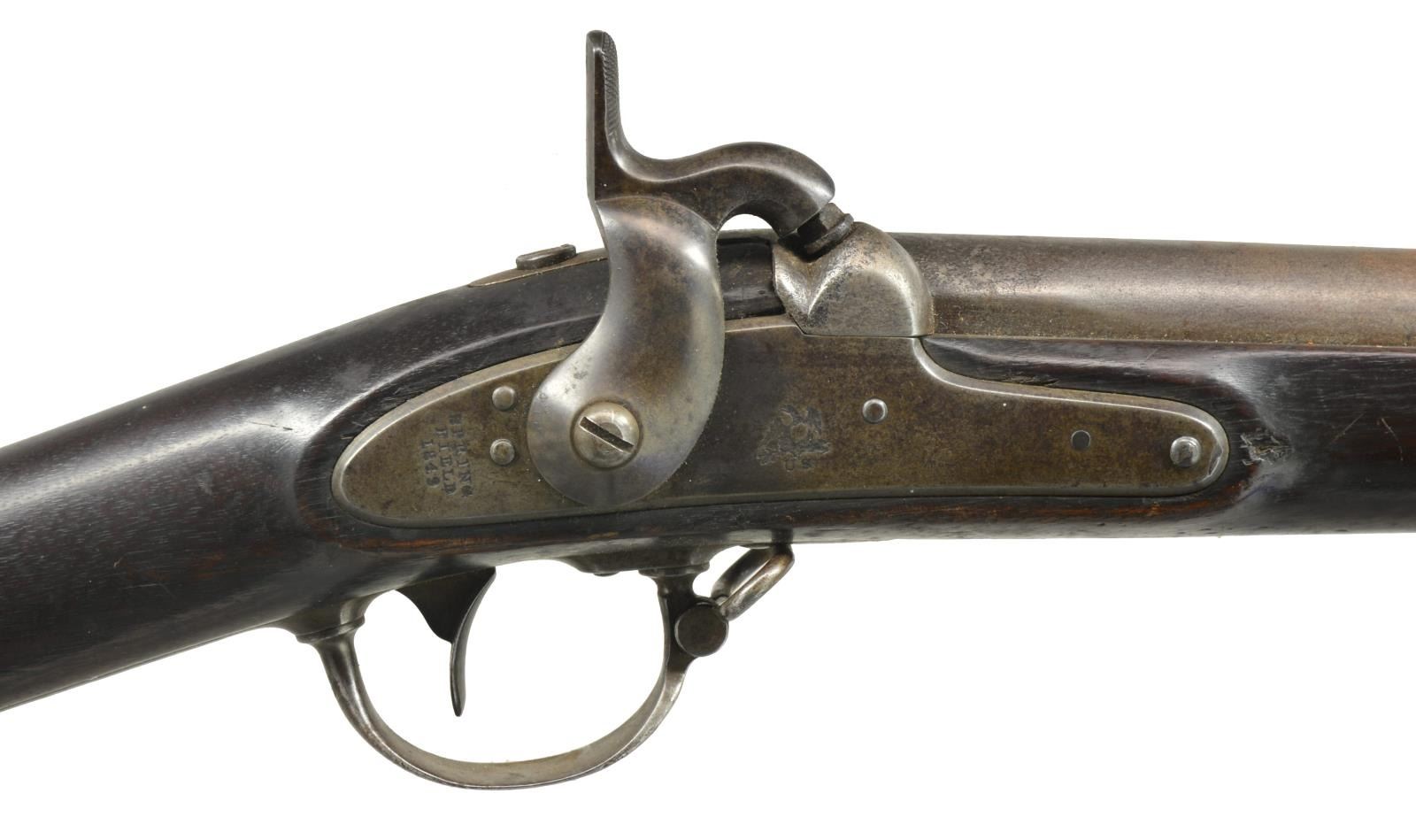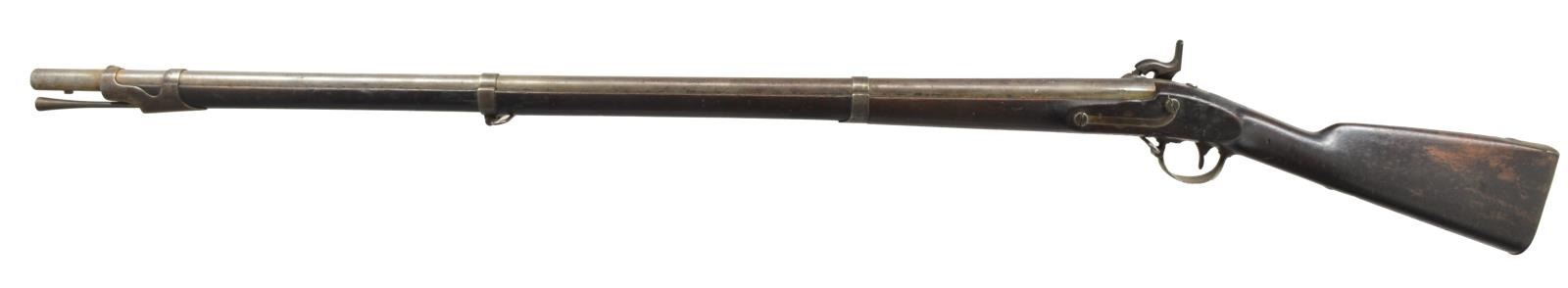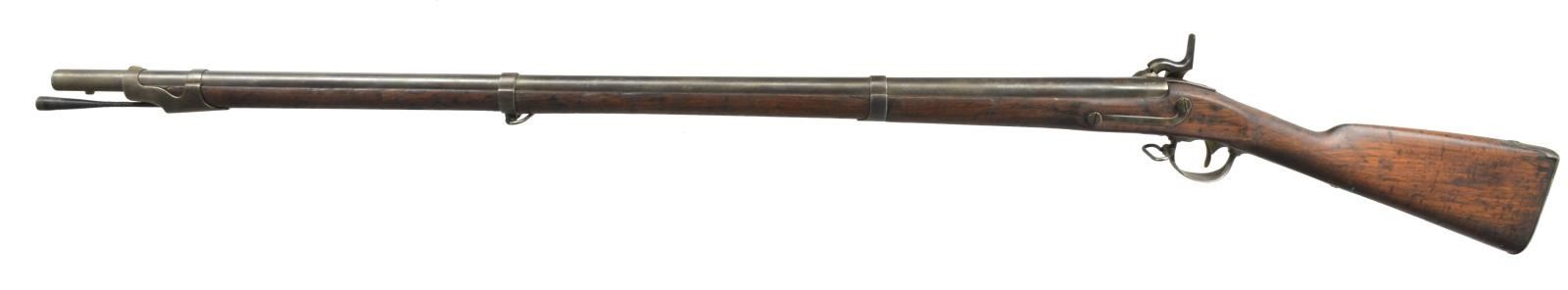 ALL: cal. 69. NSN. Bbls. 42" w/ blade front sights. 3 Band walnut stocks w/ iron fittings & tulip tipped ramrods. 1) 1849 Dated lock w/ 1852 dated bbl. Right side of butt has hand carved initials "TI". CONDITION: metal has cleaned gray appearance w/ pitting in breech area. Stock has dark worn appearance w/ dents, scratches & handling marks having sm. cracks & chips in lock & sideplate areas. Dark pitted bore. (01-18214/DS). 2) 1852 Dated lock. Bbl. date is illegible. CONDITION: heavily cleaned metal showing areas of pitting heaviest at breech & buttplate. Sanded & refinished stock showing heavy dents, gouges & handling marks. Stock is broken in forearm area forward of lock & sideplate. Tang screw is missing. Dark pitted bore. (01-18219/DS). ALL ANTIQUE. $700-1,000.