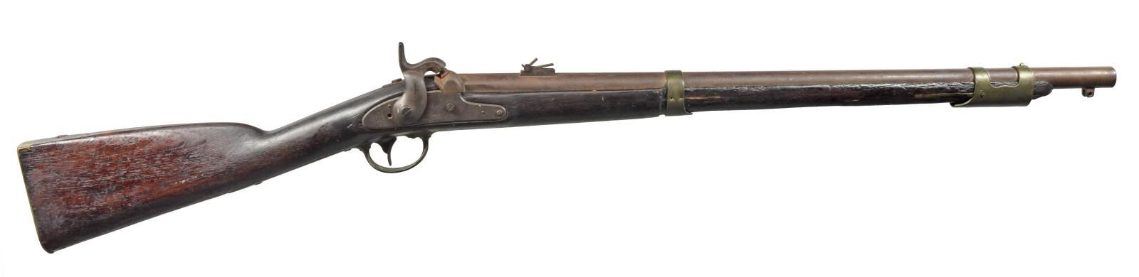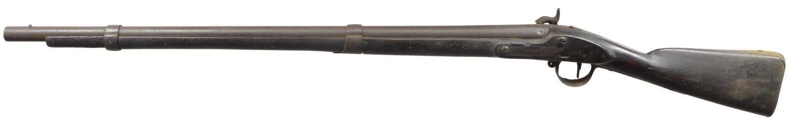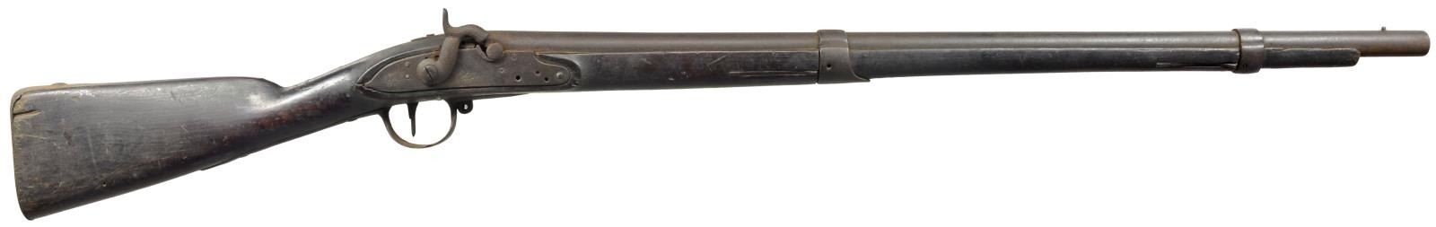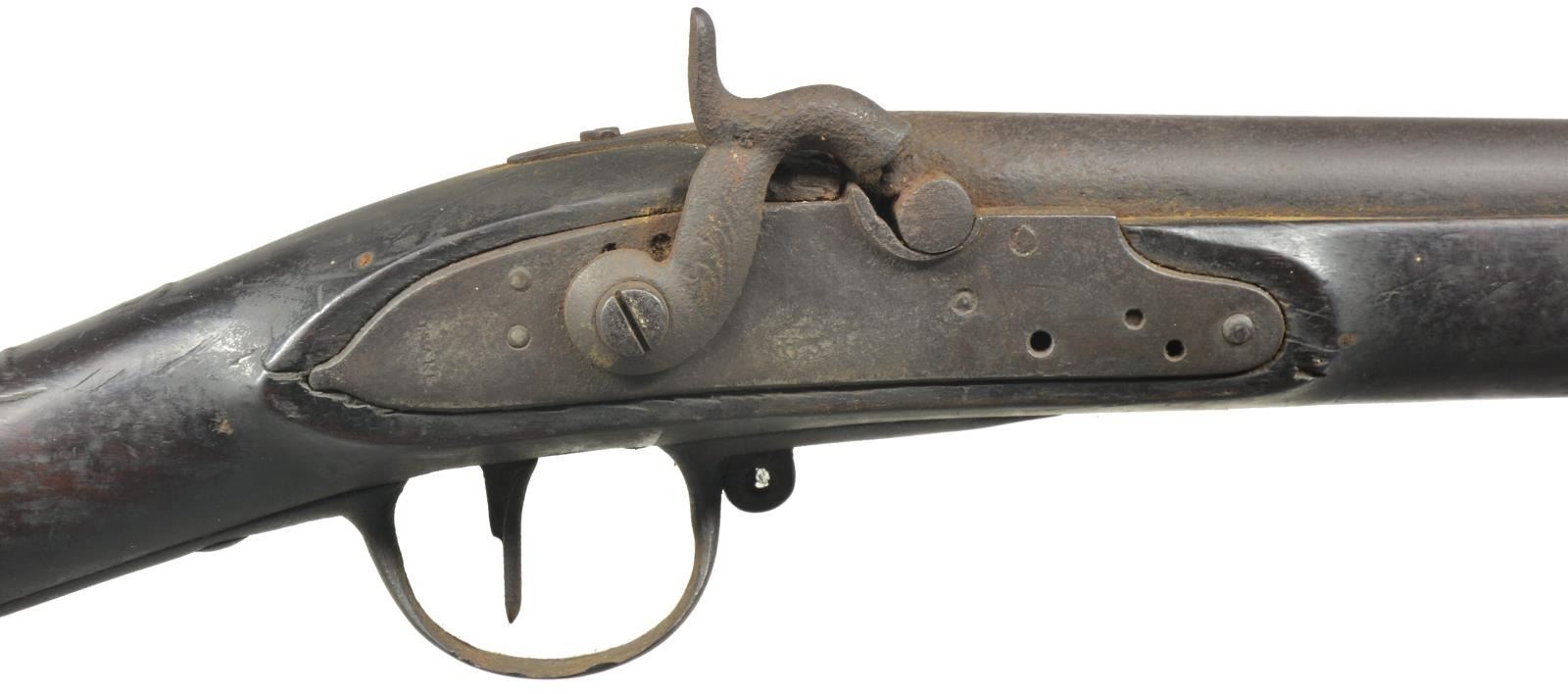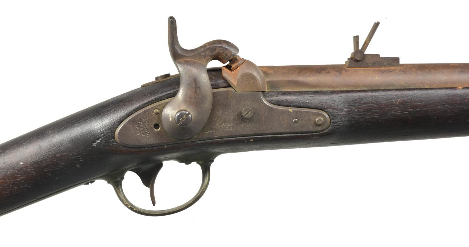 ALL: cal. 69. NSN. 1) SPRINGFIELD 1847 CAVALRY MUSKETOON. Bbl. 26" w/ 2 leaf rear sight & 1853 date. 1847 Dated lock. 2 Band walnut stock w/ brass fittings. Attachment base only for swivel ramrod. CONDITION: metal has faded to brown patina w/ rust in breech area. Refinished stock has dark worn appearance w/ dents & handling marks having cracks in buttplate, lock & side plate areas. Dark pitted bore. (01-18368/DS). 2) SPRINGFIELD 1847 ARTILLERY MUSKETOON. Bbl. 26" w/ right side bayonet lug. 1847 Dated lock. 2 Band walnut stock w/ tulip tipped ramrod. CONDITION: metal is heavily cleaned w/ general pitting. Lock is missing internal parts & does not function. Refinished stock w/ extensive epoxy repairs around buttplate & lock areas. Repairs around buttplate are chipping. Dark pitted bore. (01-18378/DS). 3) EVANS 1816 PERCUSSION CONVERSION. Bbl. shortened to 32" w/ French style side lug conversion. Walnut stock w/ iron fittings is shortened to 2 band configuration. Left ear of stock has clover shaped marked w/ initials "VJS" followed by number "2". CONDITION: metal has dark brown appearance w/ rust & pitting. Sporting style replacement hammer. Ramrod is missing. Stock has age darkened worn appearance w/ cracks, chips & handling marks. Dark pitted bore. (01-18381/DS). ALL ANTIQUE. $500-800.