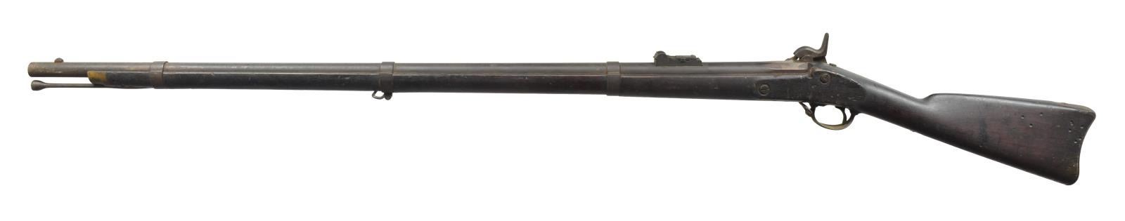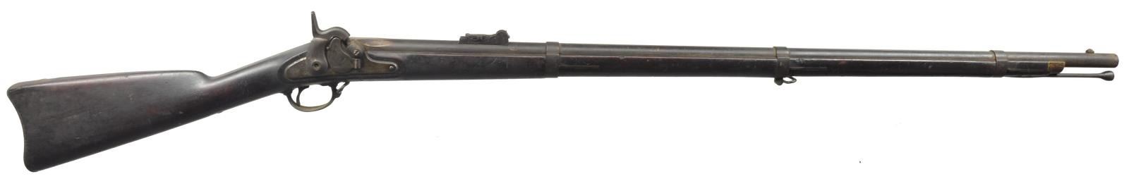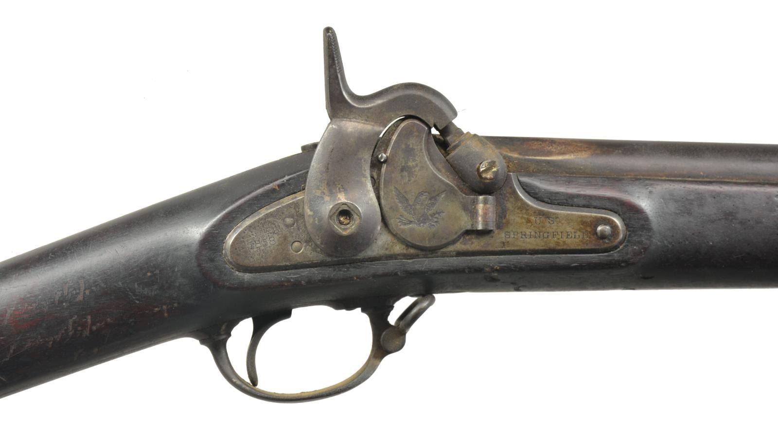 Cal. 58. NSN. Bbl. 40". Top flat at breech end is stamped "CO F / 9TH INF 105". Barleycorn front sight w/ graduated leaf rear sight. Springfield lock fitted w/ Maynard tape primer feed mechanism. Bbl. & lock are dated 1858. 3 Band walnut stock w/ iron fitting & tulip tipped ramrod. Left ear of stock has partially visible cartouches. CONDITION: bbl. has dark crusty appearance. Lock is partially cleaned w/ areas of dark appearance. Stock has dark aged appearance w/ scratches & marks having a series of sm. dents on left side w/ a crack extending from buttplate. Hammer will not hold in cocked position as sear is broken. Hammer screw is broken. Dark lightly pitted bore retaining largely intact rifling. (01-18342/DS). ANTIQUE. $700-1,100.