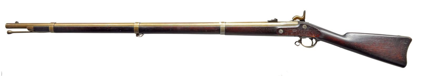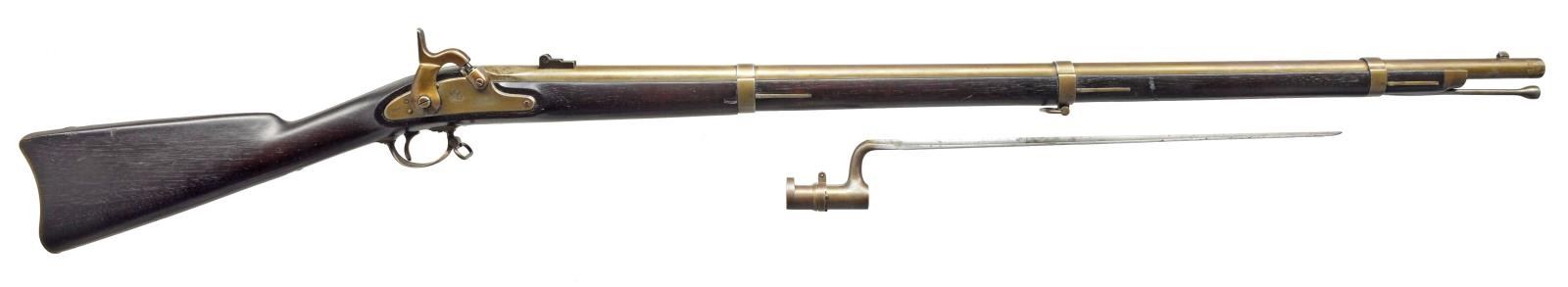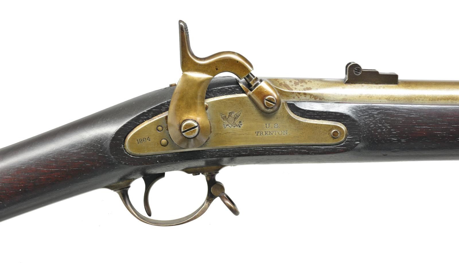 RIFLE MUSKET WITH BAYONET. Cal. .58. NSN. This is a well-preserved US Model 1861 contract rifle musket made by the Trenton Locomotive and Machine Company, Trenton New Jersey. Musket is in standard configuration w/ 40” bbl., leaf rear sight, 3 flat bbl. bands, buttplate & bayonet are both “US” surcharged. This is one of the last guns of their 11,000 contract made, no US government inspection marks on bbl. or wood, but crisp “NJ” cartouche showing New Jersey ownership & “S” stamped on left bbl. flat at breech. UNATTACHED ACCESSORIES: bayonet. CONDITION: fine overall, complete & original, iron which was bright & varnished, the varnish layer has discolored to a dingy mixed brown, still bright in protected areas, sharp edges & crisp markings. Stock is sound, well fit, sharp edges, sharp cartouche w/ scattered cosmetic blemishes. Action is crisp w/ bright shiny rifled bore. Attached bayonet is equally fine w/ staining on 18” blade. (01-18774/JS). ANTIQUE. $1,500-2,500.