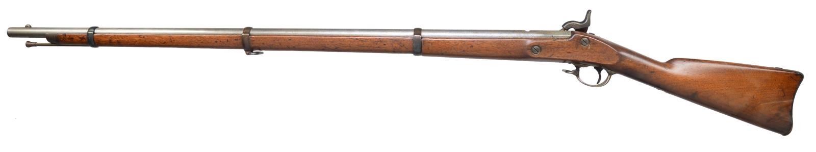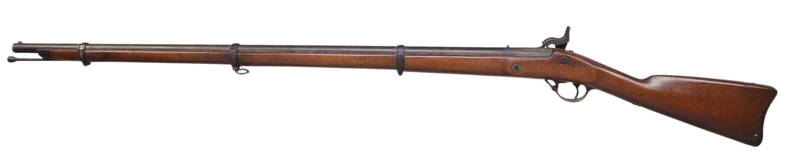 ALL: cal. 58. NSN. 1) SPRINGFIELD 1863 TYPE II. Bbl. 40" w/ barleycorn front sight, rear sight is removed. 1864 Dated lock. 3 Band walnut stock w/ iron fittings. Replacement iron ramrod. CONDITION: bbl. has cleaned gray finish showing pitting becoming heaviest in breech area. Bbl. bands, trigger guard, lock plate & buttplate have aftermarket heat colored finish. Sanded & refinished stock showing scratches, dents & marks. Dark rusty bore. (01-18213/DS). 2) SPRINGFIELD 1863. Bbl. 40" w/ barleycorn front sight w/ single leaf rear sight. 1864 Dated lock. 3 Band walnut stock w/ iron fittings & tulip tipped iron ramrod. Left side of stock by comb has hand carved initials "FL". CONDITION: bbl. has faded to smooth brown patina. Lock plate has gray appearance. Hammer retains 50% light & faded case colors. Age darkened stock shows heavy wear w/ numerous dents & marks having chips & crack around rear lockplate screw. Dark pitted bore. (01-18252/DS). 3) BRIDESBURG 1861. 1863 Style bbl. shortened to 39" w/ blade front sight & replacement fixed V notch rear sight. 1864 Dated lock marked "U.S. / BRIDSBURG". 3 Band walnut stock w/ iron fittings & tulip tipped ramrod. Left ear of stock has hand carved marking "MxHxW". CONDITION: metal has dark mottled patina showing corrosion & rust that becomes heavy in breech area. Heavily sanded refinished stock showing scratches & marks. Dark pitted bore. (01-18354/DS). ALL ANTIQUE. $700-1,000.