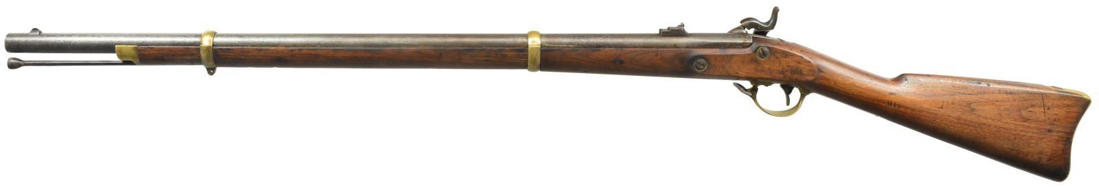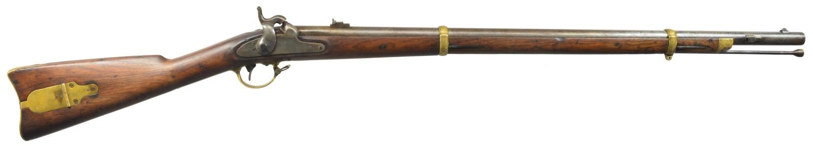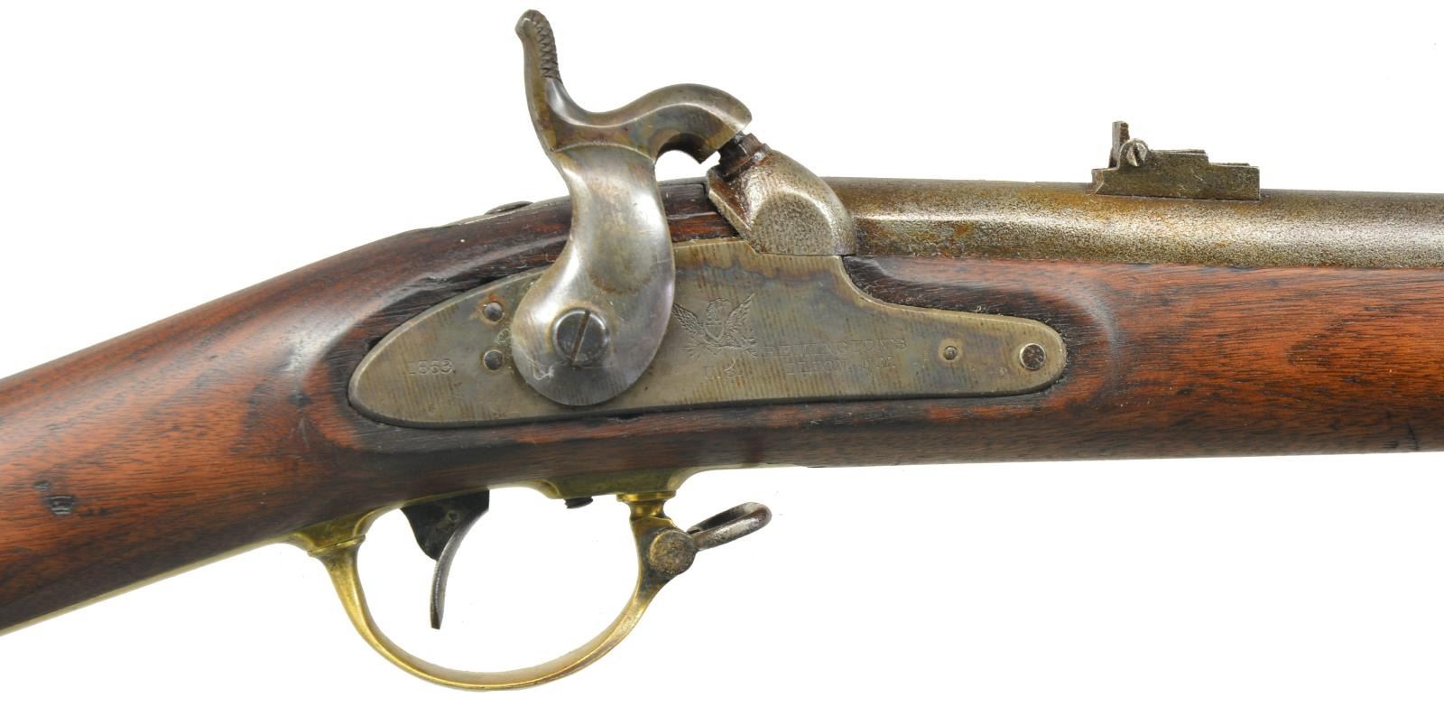 RIFLE. Cal. 58. NSN. Bbl. 33" w/ 7 groove rifling. Blade front sight w/ 2 leaf rear sight. Bbl. & lock are dated 1863. Lock has American Eagle over "US" followed by "REMINGTON'S / ILION N.Y.". 2 Band fastened walnut stock. Brass fittings include patch box, buttplate, trigger guard, side plate escutcheons, bbl. bands & nose cap. Left ear of stock has lightly visible "BH" & "HM" cartouches. Tulip tipped ramrod. The 1863 Remington is considered to be one of the best made military arms of the Civil War era. CONDITION: bbl. has cleaned gray appearance w/ general light pitting. Lock retains 30% lightly visible case colors. Sanded & refinished stock showing dents & handling marks w/ sm. chips around top tang & lock. Bore retains sound rifling showing spots of pitting. (01-18203/DS). ANTIQUE. $700-1,000.
